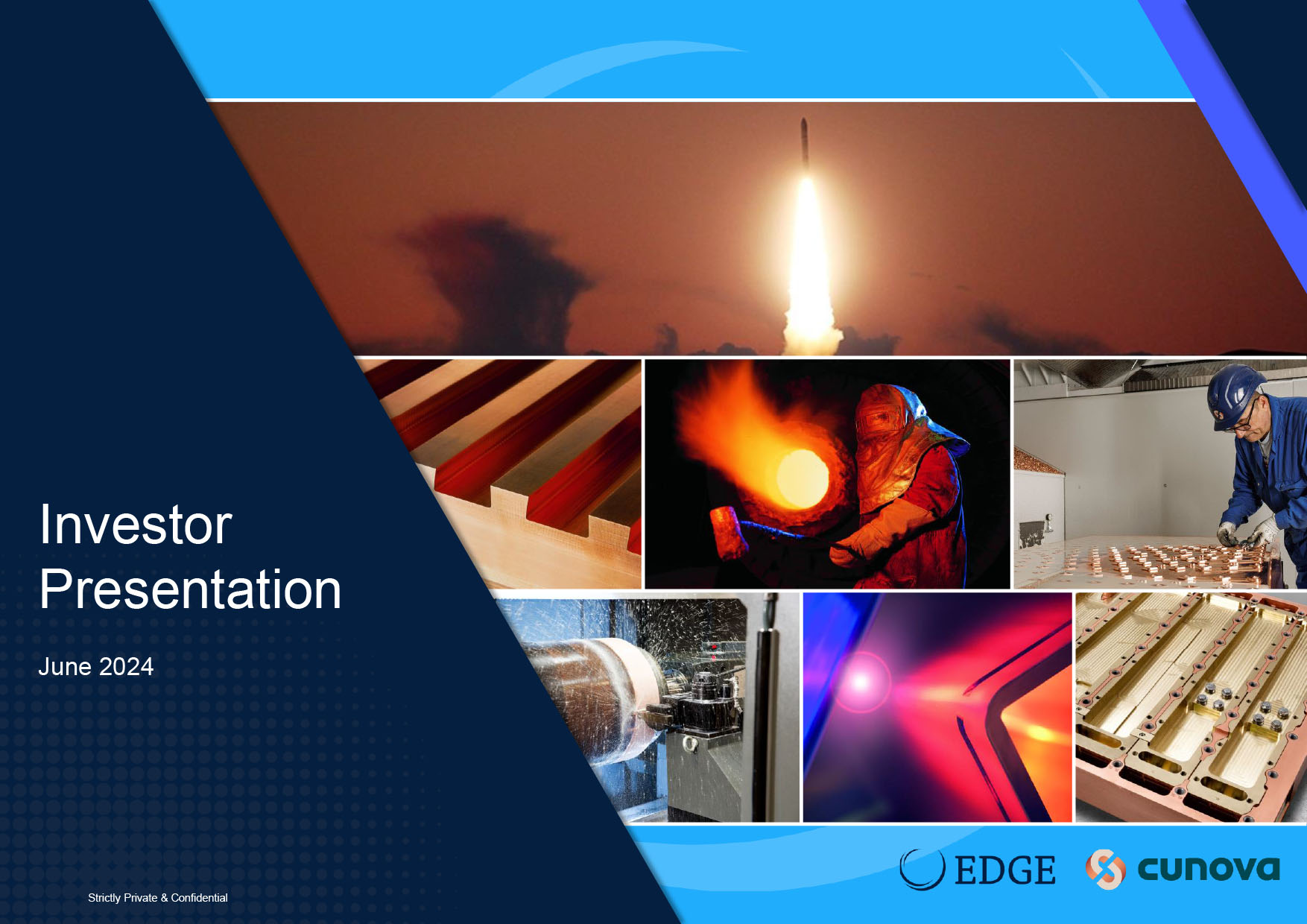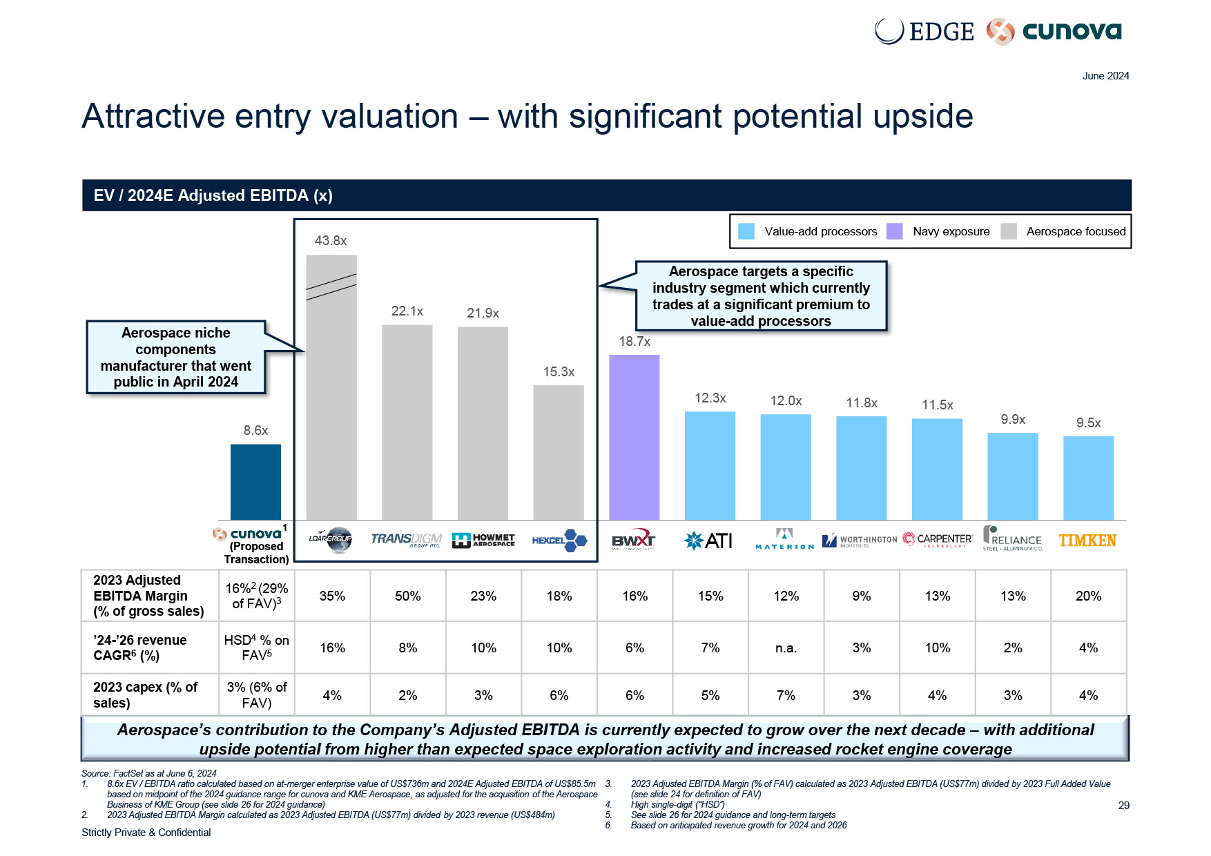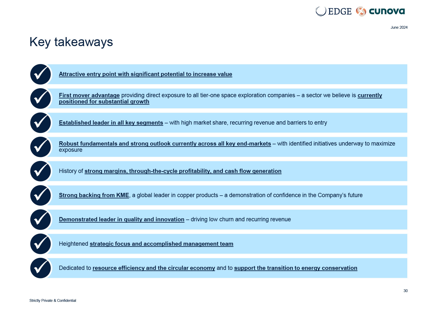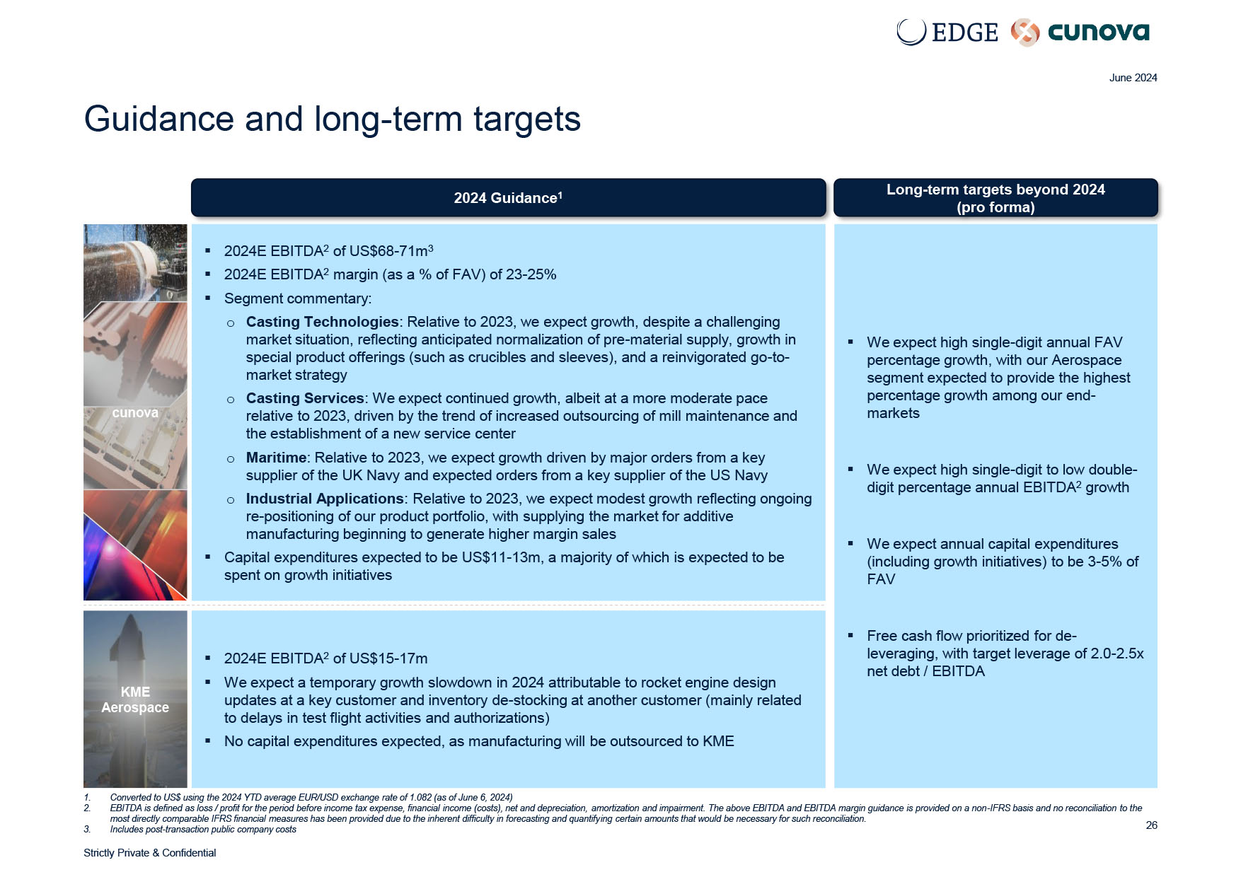 Strictly Private & Confidential Guidance and long - term targets 26 June 2024 ▪ 2024E EBITDA 2 of US$15 - 17m ▪ We expect a temporary growth slowdown in 2024 attributable to rocket engine design updates at a key customer and inventory de - stocking at another customer (mainly related to delays in test flight activities and authorizations) ▪ No capital expenditures expected, as manufacturing will be outsourced to KME ▪ We expect high single - digit annual FAV percentage growth, with our Aerospace segment expected to provide the highest percentage growth among our end - markets ▪ We expect high single - digit to low double - digit percentage annual EBITDA 2 growth ▪ We expect annual capital expenditures (including growth initiatives) to be 3 - 5% of FAV ▪ Free cash flow prioritized for de - leveraging, with target leverage of 2.0 - 2.5x net debt / EBITDA Long - term targets beyond 2024 (pro forma) 2024 Guidance 1 ▪ 2024E EBITDA 2 of US$68 - 71m 3 ▪ 2024E EBITDA 2 margin (as a % of FAV) of 23 - 25% ▪ Segment commentary: o Casting Technologies : Relative to 2023, we expect growth, despite a challenging market situation, reflecting anticipated normalization of pre - material supply, growth in special product offerings (such as crucibles and sleeves), and a reinvigorated go - to - market strategy o Casting Services : We expect continued growth, albeit at a more moderate pace relative to 2023, driven by the trend of increased outsourcing of mill maintenance and the establishment of a new service center o Maritime : Relative to 2023, we expect growth driven by major orders from a key supplier of the UK Navy and expected orders from a key supplier of the US Navy o Industrial Applications : Relative to 2023, we expect modest growth reflecting ongoing re - positioning of our product portfolio, with supplying the market for additive manufacturing beginning to generate higher margin sales ▪ Capital expenditures expected to be US$11 - 13m, a majority of which is expected to be spent on growth initiatives 1. Converted to US$ using the 2024 YTD average EUR/USD exchange rate of 1.082 (as of June 6, 2024) 2. EBITDA is defined as loss / profit for the period before income tax expense, financial income (costs), net and depreciation, amo rtization and impairment. The above EBITDA and EBITDA margin guidance is provided on a non - IFRS basis and no reconciliation to t he most directly comparable IFRS financial measures has been provided due to the inherent difficulty in forecasting and quantify ing certain amounts that would be necessary for such reconciliation. 3. Includes post - transaction public company costs cunova KME Aerospace