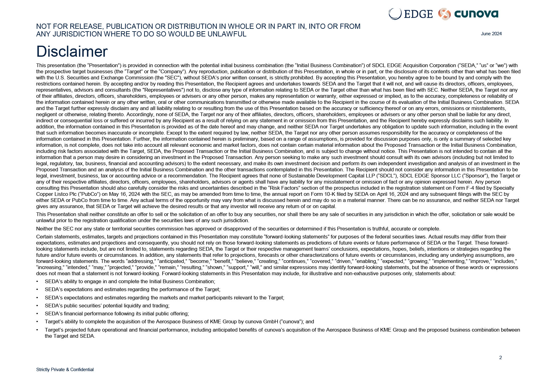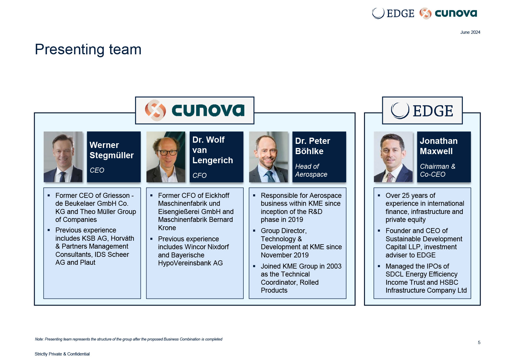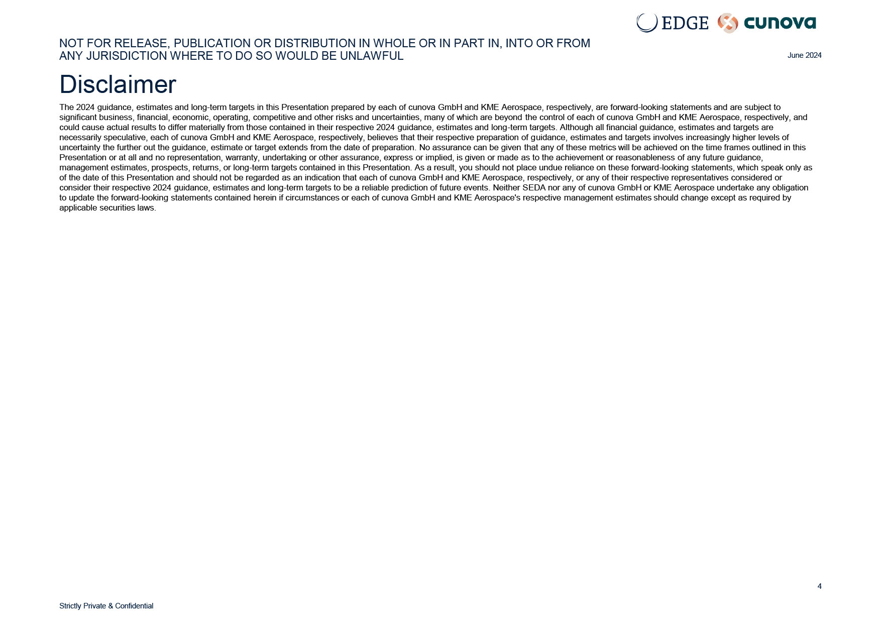 Strictly Private & Confidential Disclaimer 4 The 2024 guidance, estimates and long - term targets in this Presentation prepared by each of cunova GmbH and KME Aerospace, respe ctively, are forward - looking statements and are subject to significant business, financial, economic, operating, competitive and other risks and uncertainties, many of which are beyond th e control of each of cunova GmbH and KME Aerospace, respectively, and could cause actual results to differ materially from those contained in their respective 2024 guidance, estimates and long - term targets. Although all financial guidance, estimates and targets are necessarily speculative, each of cunova GmbH and KME Aerospace, respectively, believes that their respective preparation of g uid ance, estimates and targets involves increasingly higher levels of uncertainty the further out the guidance, estimate or target extends from the date of preparation. No assurance can be given tha t any of these metrics will be achieved on the time frames outlined in this Presentation or at all and no representation, warranty, undertaking or other assurance, express or implied, is given or made as to the achievement or reasonableness of any future guidance, management estimates, prospects, returns, or long - term targets contained in this P resentation. As a result, you should not place undue reliance on these forward - looking statements, which speak only as of the date of this P resentation and should not be regarded as an indication that each of cunova GmbH and KME Aerospace, respectively, or any of t hei r respective representatives considered or consider their respective 2024 guidance, estimates and long - term targets to be a reliable prediction of future events. Neither S EDA nor any of cunova GmbH or KME Aerospace undertake any obligation to update the forward - looking statements contained herein if circumstances or each of cunova GmbH and KME Aerospace's respective management estimates should change except as required by applicable securities laws. June 2024 NOT FOR RELEASE, PUBLICATION OR DISTRIBUTION IN WHOLE OR IN PART IN, INTO OR FROM ANY JURISDICTION WHERE TO DO SO WOULD BE UNLAWFUL