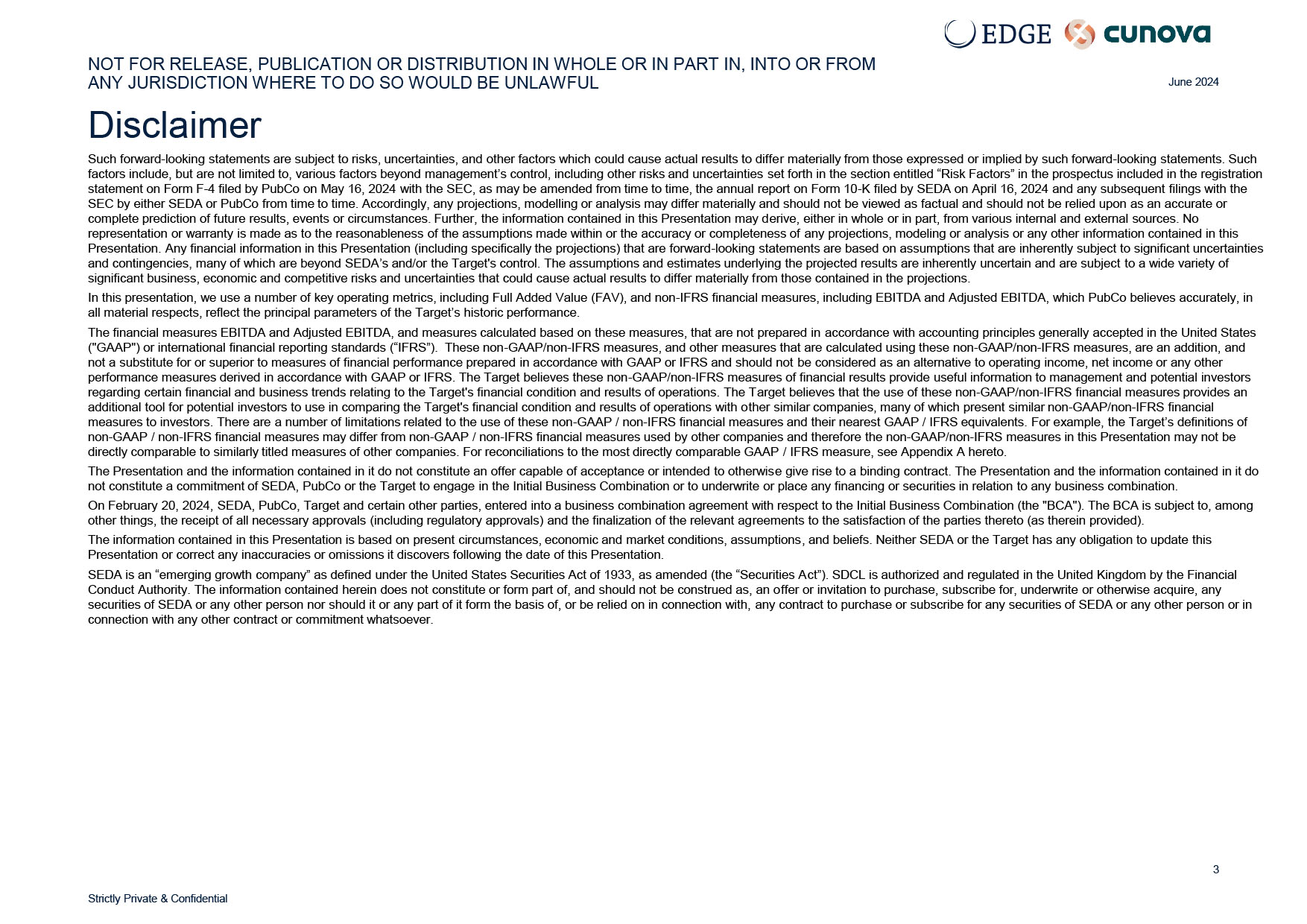 Strictly Private & Confidential Disclaimer 2 This presentation (the “Presentation”) is provided in connection with the potential initial business combination (the “Initia l B usiness Combination”) of SDCL EDGE Acquisition Corporation (“SEDA,” “us” or “we”) with the prospective target businesses (the “Target” or the “Company”). Any reproduction, publication or distribution of this Pres ent ation, in whole or in part, or the disclosure of its contents other than what has been filed with the U.S. Securities and Exchange Commission (the "SEC"), without SEDA’s prior written consent, is strictly prohibited. B y a ccepting this Presentation, you hereby agree to be bound by and comply with the restrictions contained herein. By accepting and/or by reading this Presentation, the Recipient agrees and undertakes towards SED A and the Target that it will not, and will cause its directors, officers, employees, representatives, advisors and consultants (the "Representatives") not to, disclose any type of information relating to SEDA o r t he Target other than what has been filed with SEC. N either SEDA, the Target nor any of their affiliates, directors, officers, shareholders, employees or advisers or any other person, makes any representation o r w arranty, either expressed or implied, as to the accuracy, completeness or reliability of the information contained herein or any other written, oral or other communications transmitted or otherwise made available t o t he Recipient in the course of its evaluation of the Initial Business Combination. SEDA and the Target further expressly disclaim any and all liability relating to or resulting from the use of this Presentation ba sed on the accuracy or sufficiency thereof or on any errors, omissions or misstatements, negligent or otherwise, relating thereto. Accordingly, none of SEDA, the Target nor any of their affiliates, directors, offic ers , shareholders, employees or advisers or any other person shall be liable for any direct, indirect or consequential loss or suffered or incurred by any Recipient as a result of relying on any statement in or omissio n f rom this Presentation, and the Recipient hereby expressly disclaims such liability. In addition, the information contained in this Presentation is provided as of the date hereof and may change, and neither SEDA n or Target undertakes any obligation to update such information, including in the event that such information becomes inaccurate or incomplete. Except to the extent required by law, neither SEDA, the Target nor an y o ther person assumes responsibility for the accuracy or completeness of the information contained in this Presentation. Further, the information contained herein is preliminary, based on a range of ass ump tions, is provided for discussion purposes only, is only a summary of selected key information, is not complete, does not take into account all relevant economic and market factors, does not contain certain m ate rial information about the Proposed Transaction or the Initial Business Combination, including risk factors associated with the Target, SEDA, the Proposed Transaction or the Initial Business Combination, and is su bject to change without notice. This Presentation is not intended to contain all the information that a person may desire in considering an investment in the Proposed Transaction. Any person seeking to make any su ch investment should consult with its own advisors (including but not limited to legal, regulatory, tax, business, financial and accounting advisors) to the extent necessary, and make its own investment dec isi on and perform its own independent investigation and analysis of an investment in the Proposed Transaction and an analysis of the Initial Business Combination and the other transactions contemplated in this Pres ent ation. The Recipient should not consider any information in this Presentation to be legal, investment, business, tax or accounting advice or a recommendation. The Recipient agrees that none of Sustainable Deve lop ment Capital LLP (“SDCL”), SDCL EDGE Sponsor LLC (“Sponsor”), the Target or any of their respective affiliates, directors, officers, employees, shareholders, advisors or agents shall have any liability fo r any misstatement or omission of fact or any opinion expressed herein. Any person consulting this Presentation should also carefully consider the risks and uncertainties described in the “Risk Factors” secti on of the prospectus included in the registration statement on Form F - 4 filed by Specialty Copper Listco Plc ( “ PubCo ”) on May 16, 2024 with the SEC, as may be amended from time to time, the annual report on Form 10 - K filed by SEDA on April 16, 2024 and any subseq uent filings with the SEC by either SEDA or PubCo from time to time. Any actual terms of the opportunity may vary from what is discussed herein and may do so in a material man ne r. There can be no assurance, and neither SEDA nor Target gives any assurance, that SEDA or Target will achieve the desired results or that any investor will receive any return of or on capital. This Presentation shall neither constitute an offer to sell or the solicitation of an offer to buy any securities, nor shall the re be any sale of securities in any jurisdiction in which the offer, solicitation or sale would be unlawful prior to the registration qualification under the securities laws of any such jurisdiction. Neither the SEC nor any state or territorial securities commission has approved or disapproved of the securities or determine d i f this Presentation is truthful, accurate or complete. Certain statements, estimates, targets and projections contained in this Presentation may constitute “forward - looking statements ” for purposes of the federal securities laws. Actual results may differ from their expectations, estimates and projections and consequently, you should not rely on those forward - looking statements as 