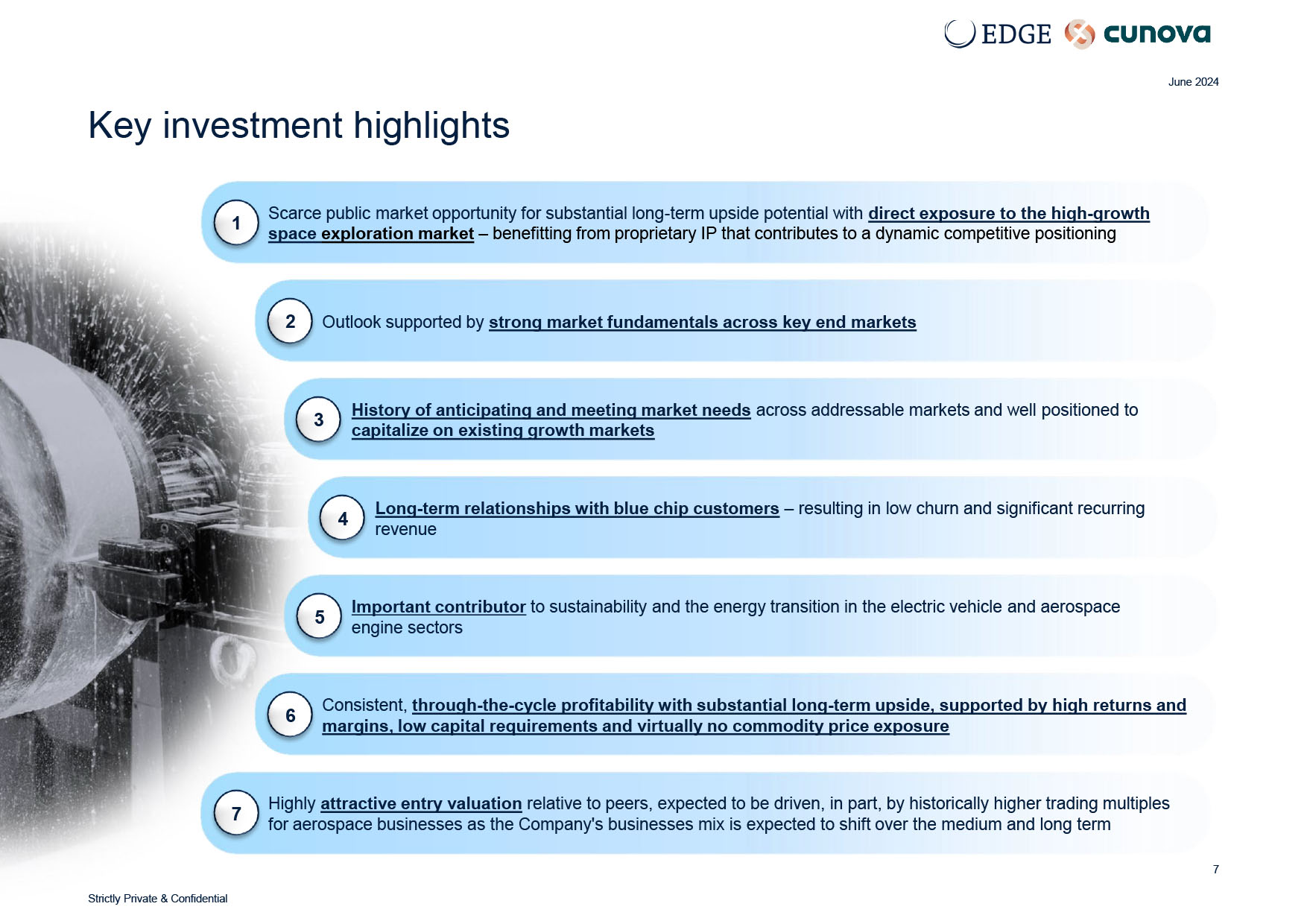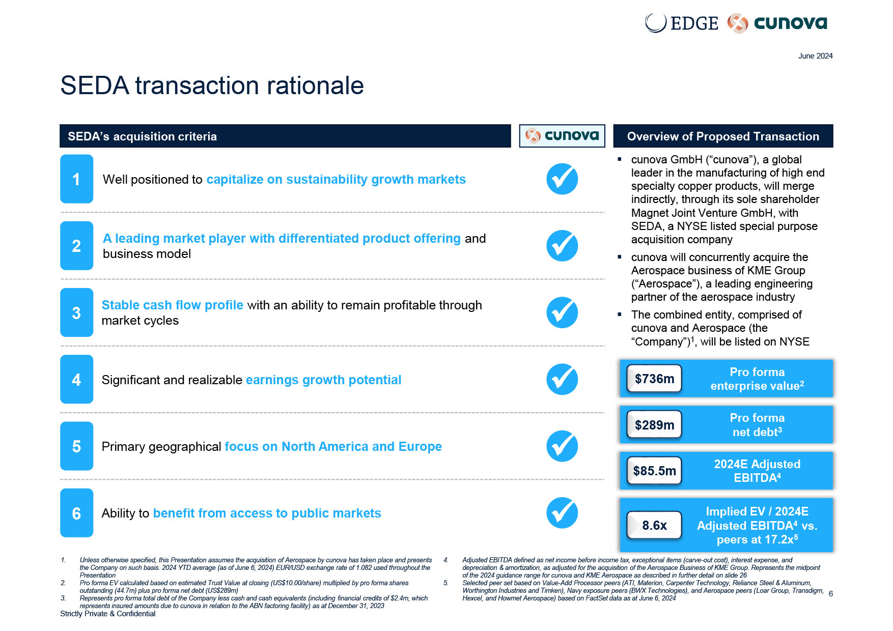 Strictly Private & Confidential SEDA transaction rationale 6 SEDA’s acquisition criteria 1 Well positioned to capitalize on sustainability growth markets x 2 A leading market player with differentiated product offering and business model x 3 Stable cash flow profile with an ability to remain profitable through market cycles x 4 Significant and realizable earnings growth potential x 5 Primary geographical focus on North America and Europe x 6 Ability to benefit from access to public markets x Overview of Proposed Transaction ▪ cunova GmbH (“cunova”), a global leader in the manufacturing of high end specialty copper products, will merge indirectly, through its sole shareholder Magnet Joint Venture GmbH, with SEDA, a NYSE listed special purpose acquisition company ▪ cunova will concurrently acquire the Aerospace business of KME Group (“Aerospace”), a leading engineering partner of the aerospace industry ▪ The combined entity, comprised of cunova and Aerospace (the “Company”) 1 , will be listed on NYSE Pro forma enterprise value 2 $736m Pro forma net debt 3 $289m Implied EV / 2024E Adjusted EBITDA 4 vs. peers at 17.2x 5 8.6x 2024E Adjusted EBITDA 4 $85.5m 1. Unless otherwise specified, this Presentation assumes the acquisition of Aerospace by cunova has taken place and presents the Company on such basis. 2024 YTD average (as of June 6, 2024) EUR/USD exchange rate of 1.082 used throughout the Presentation 2. Pro forma EV calculated based on estimated Trust Value at closing (US$10.00/share) multiplied by pro forma shares outstanding (44.7m) plus pro forma net debt (US$289m) 3. Represents pro forma total debt of the Company less cash and cash equivalents (including financial credits of $2.4m, which represents insured amounts due to cunova in relation to the ABN factoring facility ) as at December 31, 2023 4. Adjusted EBITDA defined as net income before income tax, exceptional items (carve - out cost), interest expense, and depreciation & amortization, as adjusted for the acquisition of the Aerospace Business of KME Group. Represents the midpoint of the 2024 guidance range for cunova and KME Aerospace as described in further detail on slide 26 5. Selected peer set based on Value - Add Processor peers (ATI, Materion , Carpenter Technology, Reliance Steel & Aluminum, Worthington Industries and Timken), Navy exposure peers (BWX Technologies), and Aerospace peers ( Loar Group, Transdigm , Hexcel, and Howmet Aerospace) based on FactSet data as at June 6, 2024 June 2024