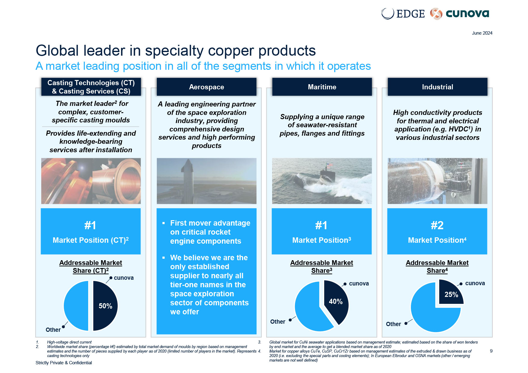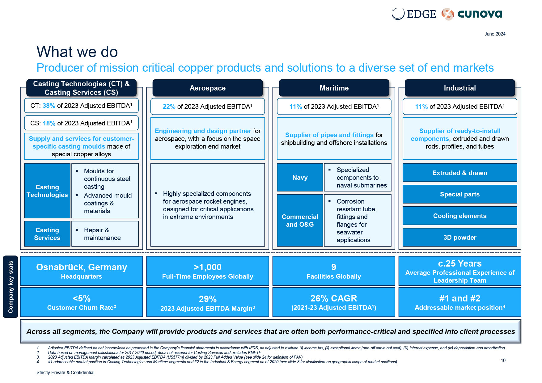 Strictly Private & Confidential Global leader in specialty copper products 9 A market leading position in all of the segments in which it operates Casting Technologies (CT) & Casting Services (CS) The market leader 2 for complex, customer - specific casting moulds #1 Market Position (CT) 2 1. High - voltage direct current 2. Worldwide market share (percentage k€) estimated by total market demand of moulds by region based on management estimates and the number of pieces supplied by each player as of 2020 (limited number of players in the market). Represents casting technologies only 3. Global market for CuNi seawater applications based on management estimate; estimated based on the share of won tenders by end market and the average to get a blended market share as of 2020 4. Market for copper alloys CuTe , CuSP , CuCr1Zr based on management estimates of the extruded & drawn business as of 2020 (i.e. excluding the special parts and cooling elements); In European Elbrodur and OSNA markets (other / emerging markets are not well defined) Addressable Market Share (CT) 2 Maritime Supplying a unique range of seawater - resistant pipes, flanges and fittings #1 Market Position 3 Industrial High conductivity products for thermal and electrical application (e.g. HVDC 1 ) in various industrial sectors #2 Market Position 4 Addressable Market Share 3 Addressable Market Share 4 50% Aerospace A leading engineering partner of the space exploration industry, providing comprehensive design services and high performing products ▪ First mover advantage on critical rocket engine components ▪ We believe we are the only established supplier to nearly all tier - one names in the space exploration sector of components we offer Provides life - extending and knowledge - bearing services after installation cunova Other cunova cunova Other 40% Other June 2024