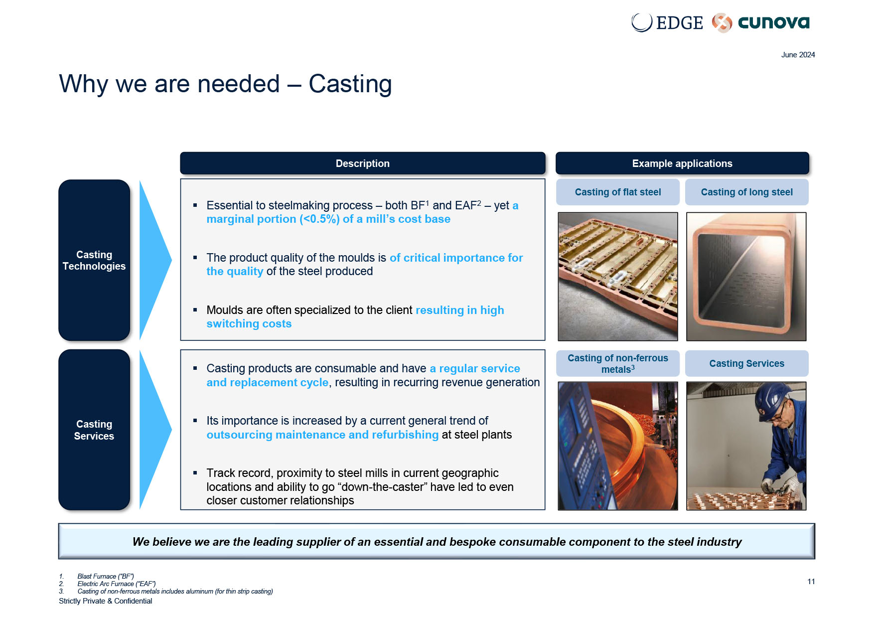 Strictly Private & Confidential Why we are needed – Casting 11 ▪ Essential to steelmaking process – both BF 1 and EAF 2 – yet a marginal portion (<0.5%) of a mill’s cost base ▪ The product quality of the moulds is of critical importance for the quality of the steel produced ▪ Moulds are often specialized to the client resulting in high switching costs 1. Blast Furnace (“BF”) 2. Electric Arc Furnace (“EAF”) 3. Casting of non - ferrous metals includes aluminum (for thin strip casting) Example applications Casting of flat steel Casting of long steel Casting of non - ferrous metals 3 We believe we are the leading supplier of an essential and bespoke consumable component to the steel industry Casting Services Description Casting Technologies Casting Services ▪ Casting products are consumable and have a regular service and replacement cycle , resulting in recurring revenue generation ▪ Its importance is increased by a current general trend of outsourcing maintenance and refurbishing at steel plants ▪ Track record, proximity to steel mills in current geographic locations and ability to go “down - the - caster” have led to even closer customer relationships June 2024