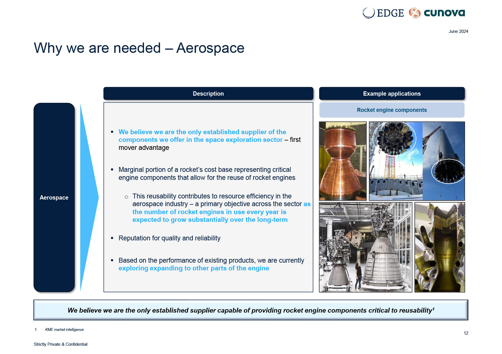Strictly Private & Confidential Why we are needed – Aerospace 12 ▪ We believe we are the only established supplier of the components we offer in the space exploration sector – first mover advantage ▪ Marginal portion of a rocket’s cost base representing critical engine components that allow for the reuse of rocket engines o This reusability contributes to resource efficiency in the aerospace industry – a primary objective across the sector as the number of rocket engines in use every year is expected to grow substantially over the long - term ▪ Reputation for quality and reliability ▪ Based on the performance of existing products, we are currently exploring expanding to other parts of the engine Rocket engine components We believe we are the only established supplier capable of providing rocket engine components critical to reusability 1 Description Example applications Aerospace 1. KME market intelligence June 2024