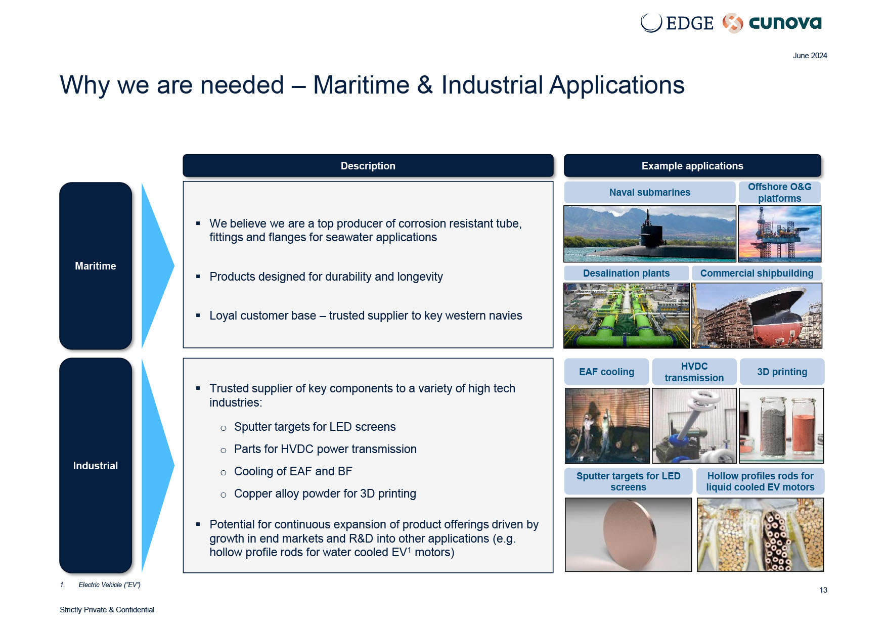 Strictly Private & Confidential Why we are needed – Maritime & Industrial Applications 13 ▪ We believe we are a top producer of corrosion resistant tube, fittings and flanges for seawater applications ▪ Products designed for durability and longevity ▪ Loyal customer base – trusted supplier to key western navies ▪ Trusted supplier of key components to a variety of high tech industries: o Sputter targets for LED screens o Parts for HVDC power transmission o Cooling of EAF and BF o Copper alloy powder for 3D printing ▪ Potential for continuous expansion of product offerings driven by growth in end markets and R&D into other applications (e.g. hollow profile rods for water cooled EV 1 motors) Offshore O&G platforms Naval submarines Hollow profiles rods for liquid cooled EV motors HVDC transmission 3D printing Commercial shipbuilding Desalination plants Industrial Maritime Description Example applications EAF cooling Sputter targets for LED screens 1. Electric Vehicle (“EV”) June 2024