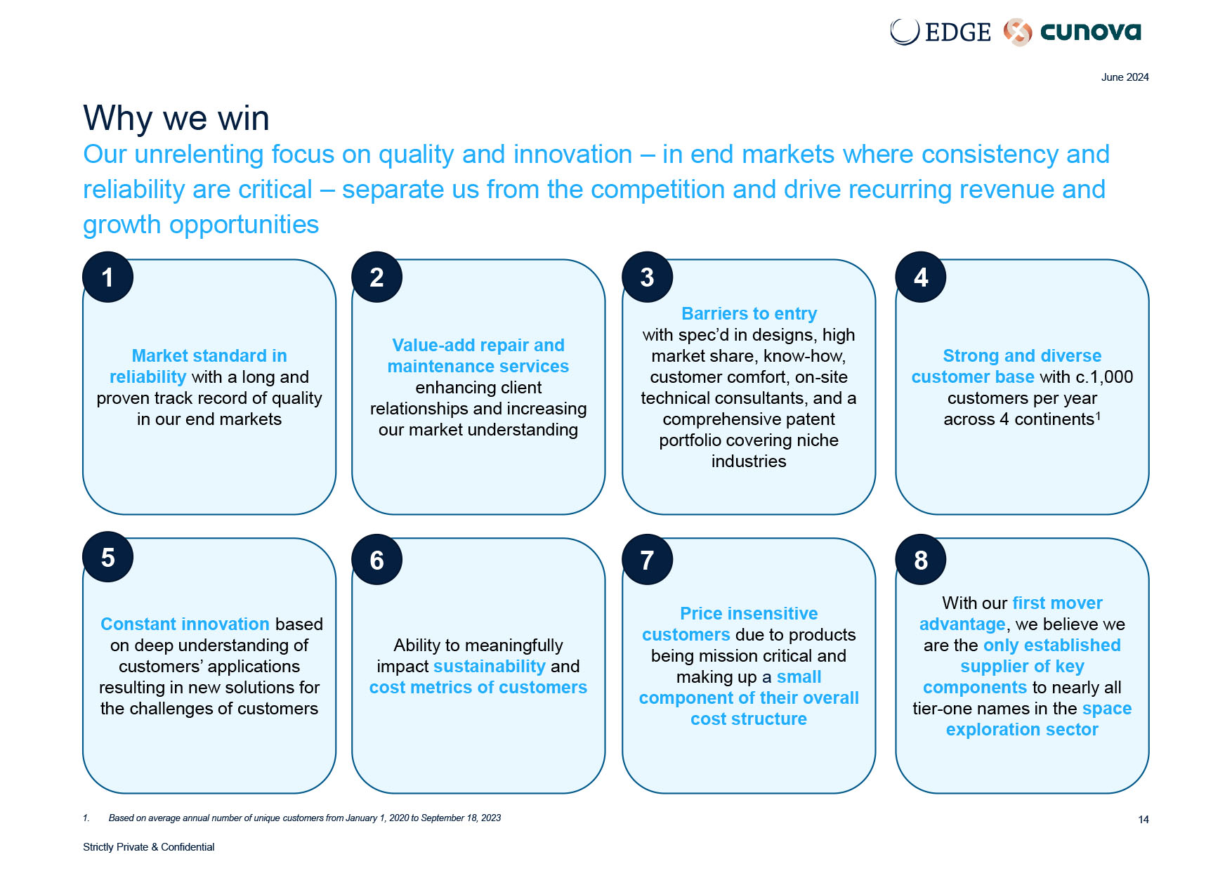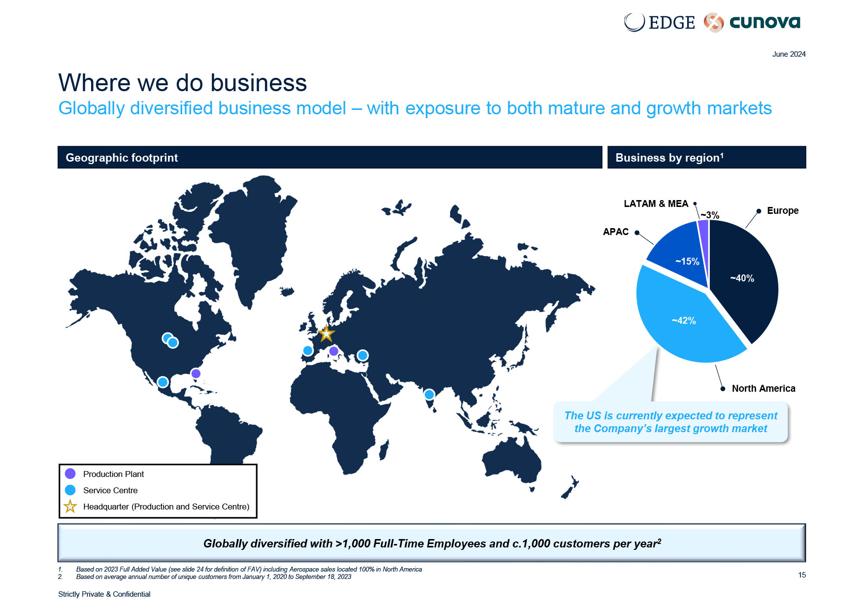 Strictly Private & Confidential Barriers to entry with spec’d in designs, high market share, know - how, customer comfort, on - site technical consultants, and a comprehensive patent portfolio covering niche industries Market standard in reliability with a long and proven track record of quality in our end markets Value - add repair and maintenance services enhancing client relationships and increasing our market understanding Why we win 14 Our unrelenting focus on quality and innovation – in end markets where consistency and reliability are critical – separate us from the competition and drive recurring revenue and growth opportunities Ability to meaningfully impact sustainability and cost metrics of customers Price insensitive customers due to products being mission critical and making up a small component of their overall cost structure Strong and diverse customer base with c.1,000 customers per year across 4 continents 1 Constant innovation based on deep understanding of customers’ applications resulting in new solutions for the challenges of customers With our first mover advantage , we believe we are the only established supplier of key components to nearly all tier - one names in the space exploration sector 1 2 3 4 5 6 7 8 1. Based on average annual number of unique customers from January 1, 2020 to September 18, 2023 June 2024
