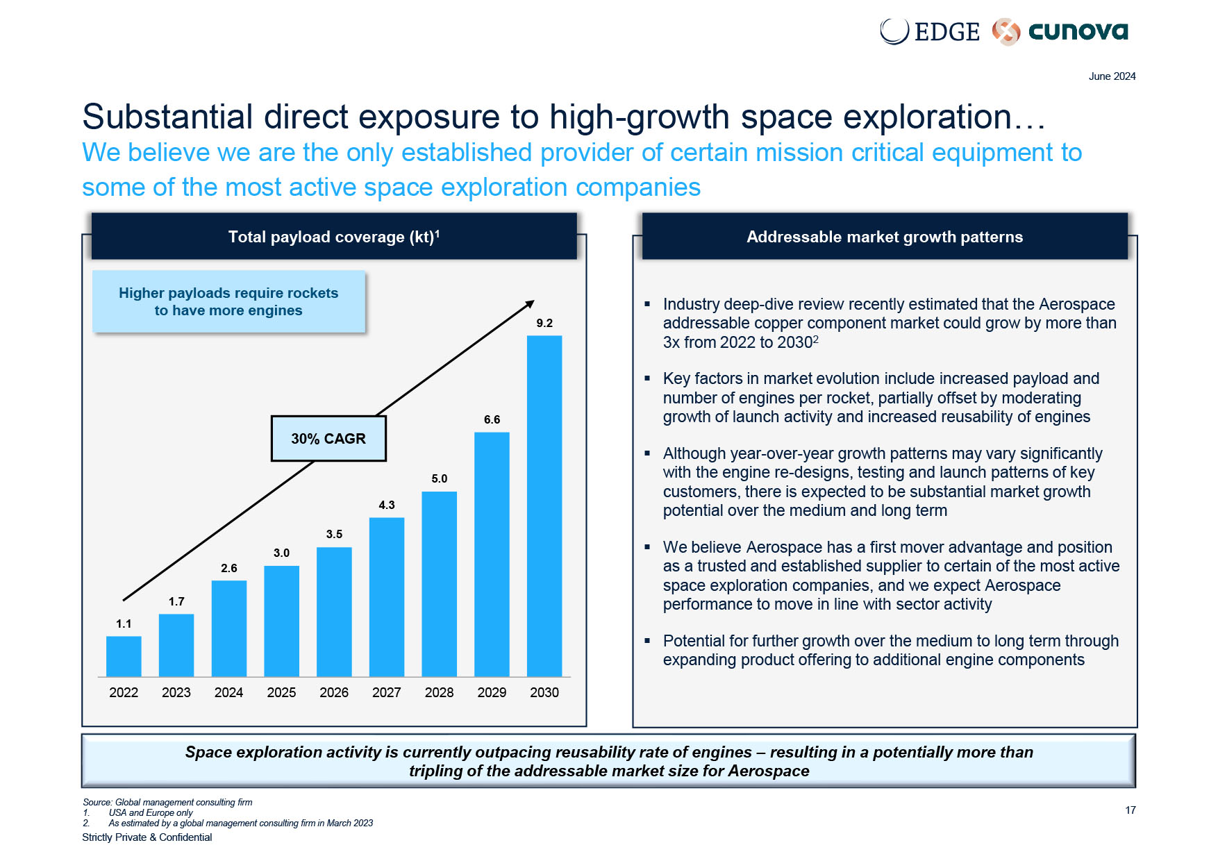Strictly Private & Confidential 1.1 1.7 2.6 3.0 3.5 4.3 5.0 6.6 9.2 2022 2023 2024 2025 2026 2027 2028 2029 2030 Space exploration activity is currently outpacing reusability rate of engines – resulting in a potentially more than tripling of the addressable market size for Aerospace Substantial direct exposure to high - growth space exploration… 17 We believe we are the only established provider of certain mission critical equipment to some of the most active space exploration companies Source: Global management consulting firm 1. USA and Europe only 2. As estimated by a global management consulting firm in March 2023 Total payload coverage (kt) 1 Higher payloads require rockets to have more engines 30% CAGR ▪ Industry deep - dive review recently estimated that the Aerospace addressable copper component market could grow by more than 3x from 2022 to 2030 2 ▪ Key factors in market evolution include increased payload and number of engines per rocket, partially offset by moderating growth of launch activity and increased reusability of engines ▪ Although year - over - year growth patterns may vary significantly with the engine re - designs, testing and launch patterns of key customers, there is expected to be substantial market growth potential over the medium and long term ▪ We believe Aerospace has a first mover advantage and position as a trusted and established supplier to certain of the most active space exploration companies, and we expect Aerospace performance to move in line with sector activity ▪ Potential for further growth over the medium to long term through expanding product offering to additional engine components Addressable market growth patterns June 2024