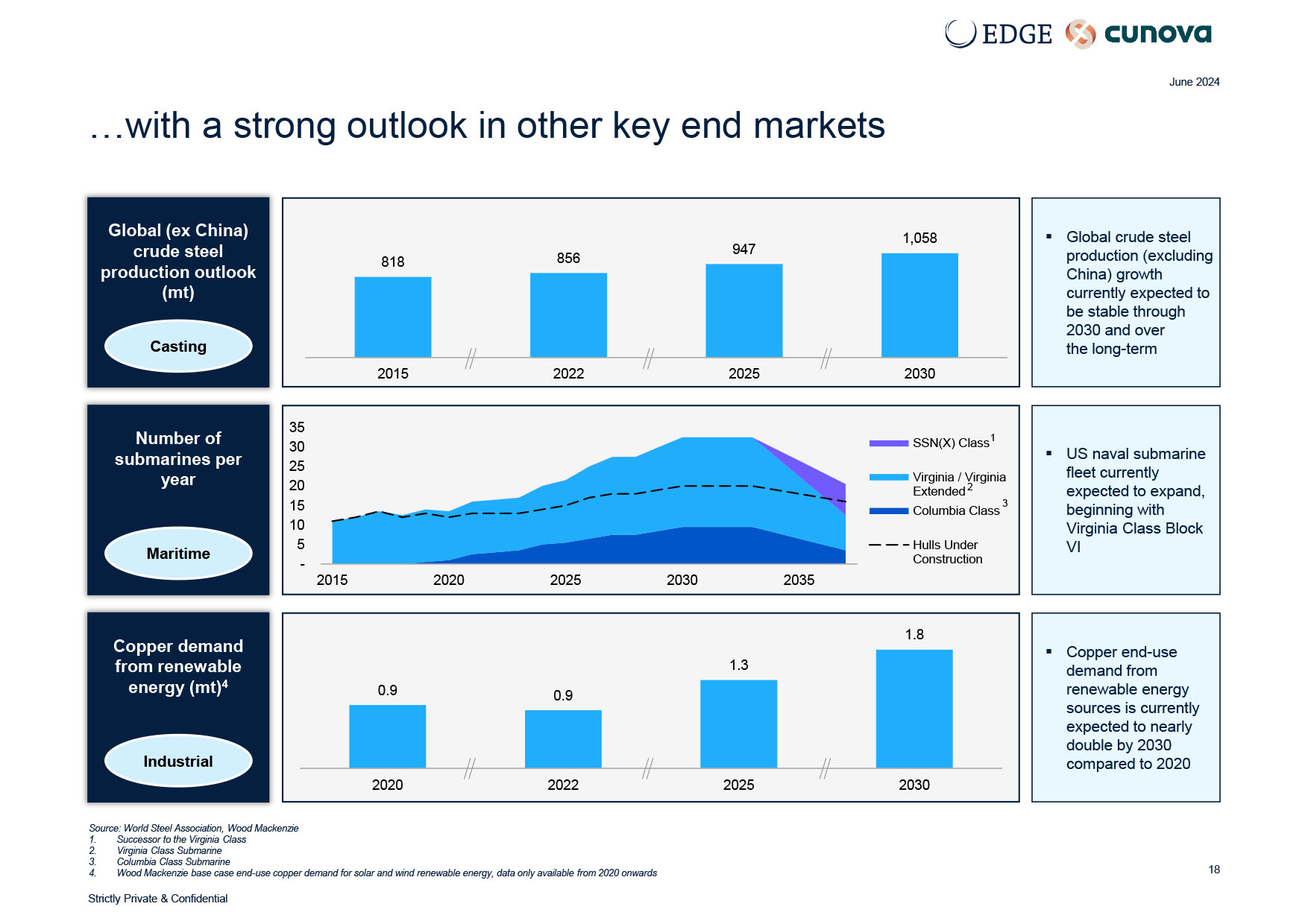 Strictly Private & Confidential 0.9 0.9 1.3 1.8 2020 2022 2025 2030 - 5 10 15 20 25 30 35 2015 2020 2025 2030 2035 SSN(X) Class Virginia / Virginia Extended Columbia Class Hulls Under Construction …with a strong outlook in other key end markets 18 Global (ex China) crude steel production outlook (mt) Source: World Steel Association, Wood Mackenzie 1. Successor to the Virginia Class 2. Virginia Class Submarine 3. Columbia Class Submarine 4. Wood Mackenzie base case end - use copper demand for solar and wind renewable energy, data only available from 2020 onwards Number of submarines per year Copper demand from renewable energy (mt) 4 ▪ Global crude steel production (excluding China) growth currently expected to be stable through 2030 and over the long - term ▪ US naval submarine fleet currently expected to expand, beginning with Virginia Class Block VI ▪ Copper end - use demand from renewable energy sources is currently expected to nearly double by 2030 compared to 2020 Casting Maritime Industrial 1 2 3 818 856 947 1,058 2015 2022 2025 2030 June 2024