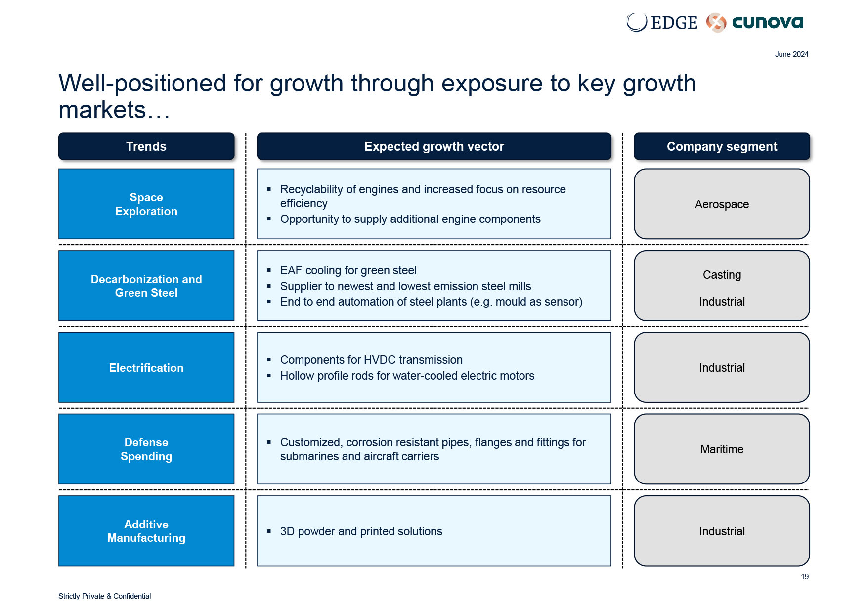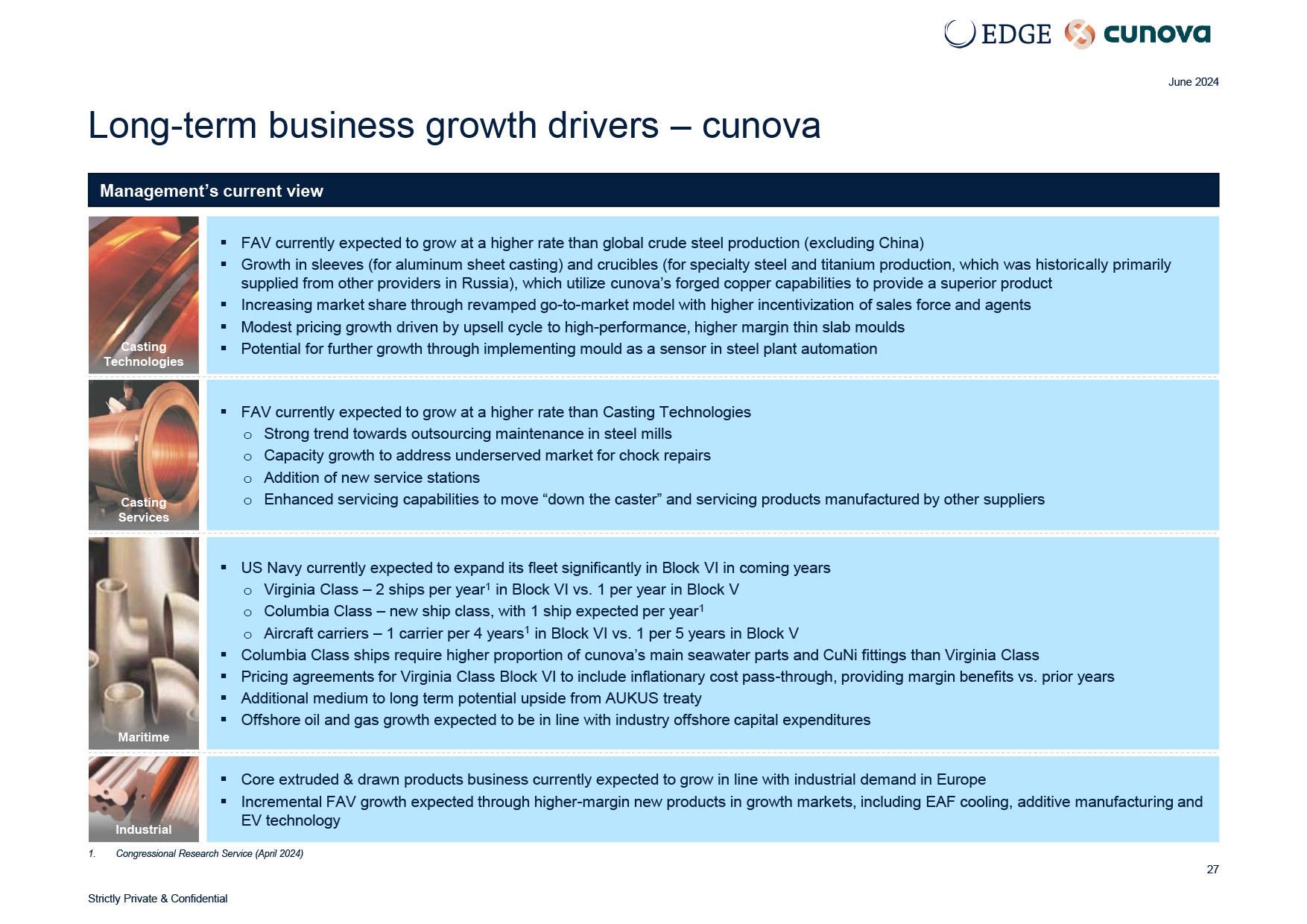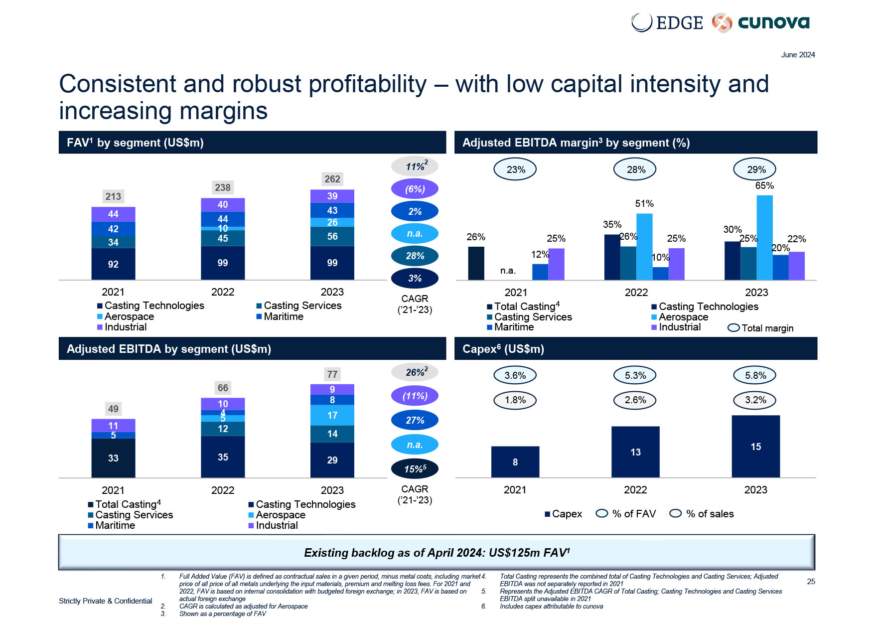 Strictly Private & Confidential Consistent and robust profitability – with low capital intensity and increasing margins 25 June 2024 FAV 1 by segment (US$m) Adjusted EBITDA margin 3 by segment (%) 1. Full Added Value (FAV) is defined as contractual sales in a given period, minus metal costs, including market price of all price of all metals underlying the input materials, premium and melting loss fees. For 2021 and 2022, FAV is based on internal consolidation with budgeted foreign exchange; in 2023, FAV is based on actual foreign exchange 2. CAGR is calculated as adjusted for Aerospace 3. Shown as a percentage of FAV 4. Total Casting represents the combined total of Casting Technologies and Casting Services; Adjusted EBITDA was not separately reported in 2021 5. Represents the Adjusted EBITDA CAGR of Total Casting; Casting Technologies and Casting Services EBITDA split unavailable in 2021 6. Includes capex attributable to cunova Adjusted EBITDA by segment ( US$m ) Capex 6 ( US$m ) Existing backlog as of April 2024: US$125m FAV 1 33 35 29 12 14 5 17 5 4 8 11 10 9 49 66 77 2021 2022 2023 Total Casting Casting Technologies Casting Services Aerospace Maritime Industrial 92 99 99 34 45 56 10 26 42 44 43 44 40 39 213 238 262 2021 2022 2023 Casting Technologies Casting Services Aerospace Maritime Industrial CAGR (’21 - ’23) 3 % n.a. 2 % (6 %) 11% 2 28 % n.a. 27 % (11 %) 26 % 2 CAGR (’21 - ’23) 15% 5 26% 35% 30% n.a. 26% 25% 51% 65% 12% 10% 20% 25% 25% 22% 23% 28% 29% 2021 2022 2023 Total Casting Casting Technologies Casting Services Aerospace Maritime Industrial Total margin 8 13 15 3.6% 5.3% 5.8% 1.8% 2.6% 3.2% 2021 2022 2023 Capex % of FAV % of sales 4 4