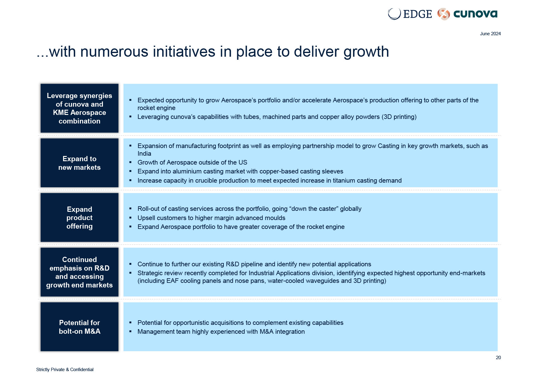 Strictly Private & Confidential Well - positioned for growth through exposure to key growth markets… 19 Trends Space Exploration ▪ Recyclability of engines and increased focus on resource efficiency ▪ Opportunity to supply additional engine components Electrification Additive Manufacturing Defense Spending Decarbonization and Green Steel Expected growth vector ▪ Components for HVDC transmission ▪ Hollow profile rods for water - cooled electric motors ▪ 3D powder and printed solutions ▪ Customized, corrosion resistant pipes, flanges and fittings for submarines and aircraft carriers ▪ EAF cooling for green steel ▪ Supplier to newest and lowest emission steel mills ▪ End to end automation of steel plants (e.g. mould as sensor) Company segment Aerospace Casting Industrial Industrial Maritime Industrial June 2024