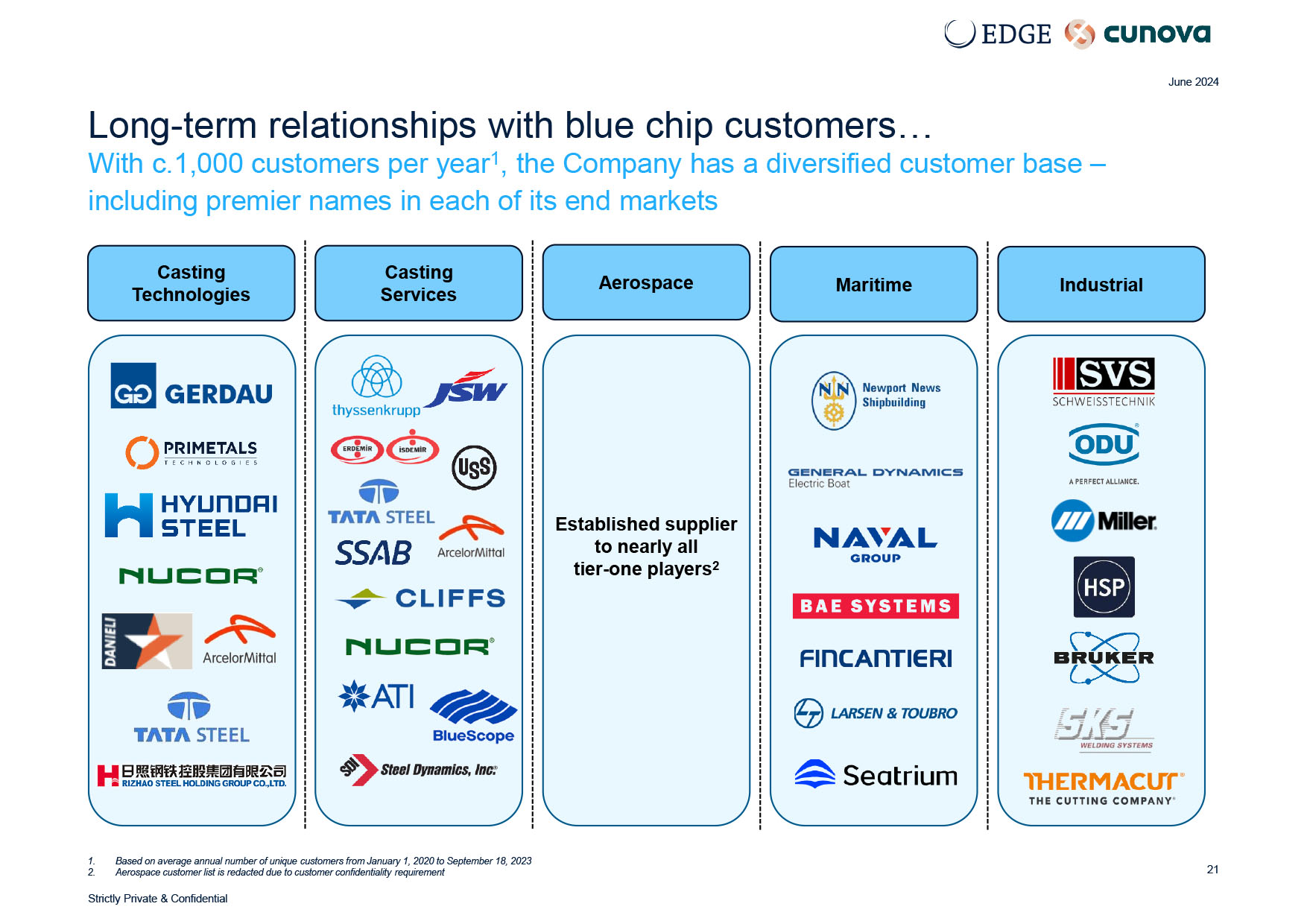 Strictly Private & Confidential 20 ▪ Expected opportunity to grow Aerospace’s portfolio and/or accelerate Aerospace’s production offering to other parts of the rocket engine ▪ Leveraging cunova’s capabilities with tubes, machined parts and copper alloy powders (3D printing) ▪ Expansion of manufacturing footprint as well as employing partnership model to grow Casting in key growth markets, such as India ▪ Growth of Aerospace outside of the US ▪ Expand into aluminium casting market with copper - based casting sleeves ▪ Increase capacity in crucible production to meet expected increase in titanium casting demand ▪ Roll - out of casting services across the portfolio, going “down the caster” globally ▪ Upsell customers to higher margin advanced moulds ▪ Expand Aerospace portfolio to have greater coverage of the rocket engine ▪ Continue to further our existing R&D pipeline and identify new potential applications ▪ Strategic review recently completed for Industrial Applications division, identifying expected highest opportunity end - markets (including EAF cooling panels and nose pans, water - cooled waveguides and 3D printing) Leverage synergies of cunova and KME Aerospace combination ▪ Potential for opportunistic acquisitions to complement existing capabilities ▪ Management team highly experienced with M&A integration Expand to new markets Expand product offering Continued emphasis on R&D and accessing growth end markets Potential for bolt - on M&A ...with numerous initiatives in place to deliver growth June 2024