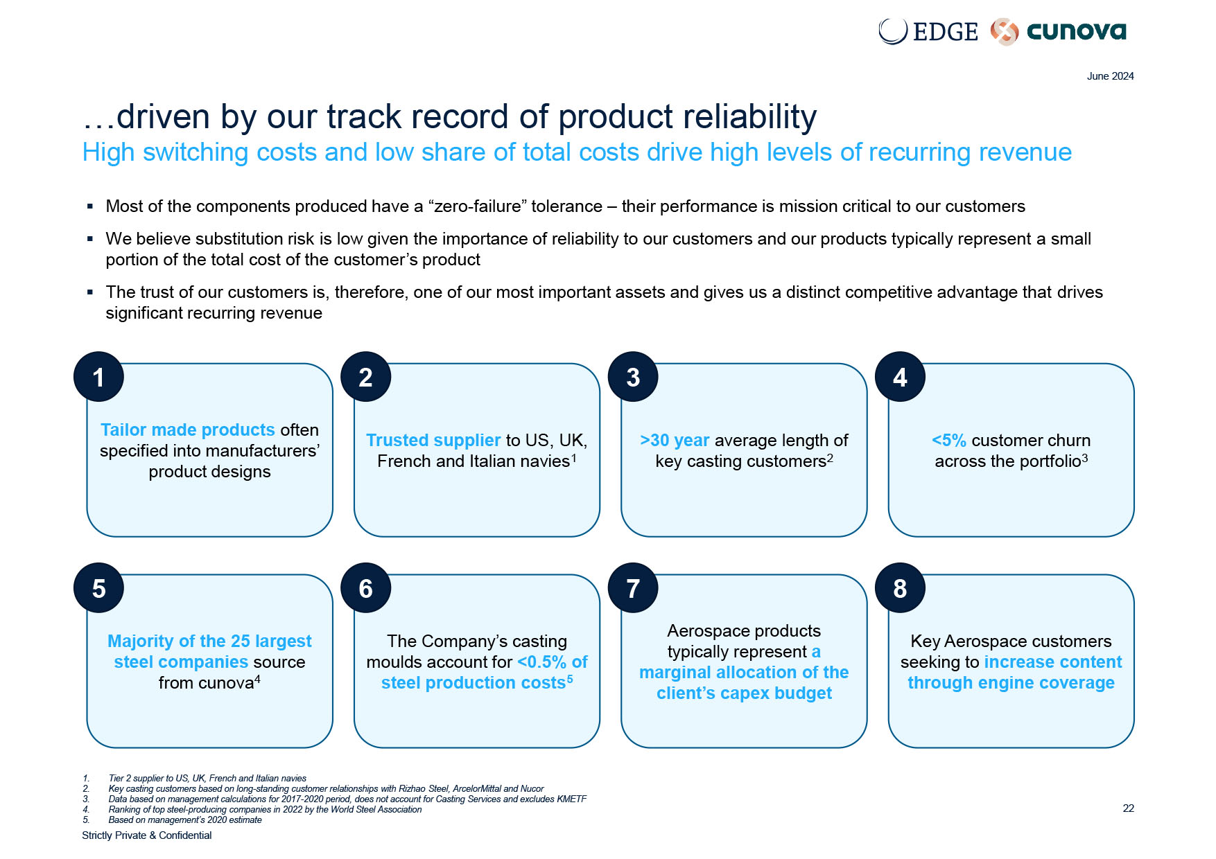Strictly Private & Confidential Long - term relationships with blue chip customers… 21 With c.1,000 customers per year 1 , the Company has a diversified customer base – including premier names in each of its end markets Casting Technologies Casting Services Aerospace Established supplier to nearly all tier - one players 2 Maritime Industrial 1. Based on average annual number of unique customers from January 1, 2020 to September 18, 2023 2. Aerospace customer list is redacted due to customer confidentiality requirement June 2024