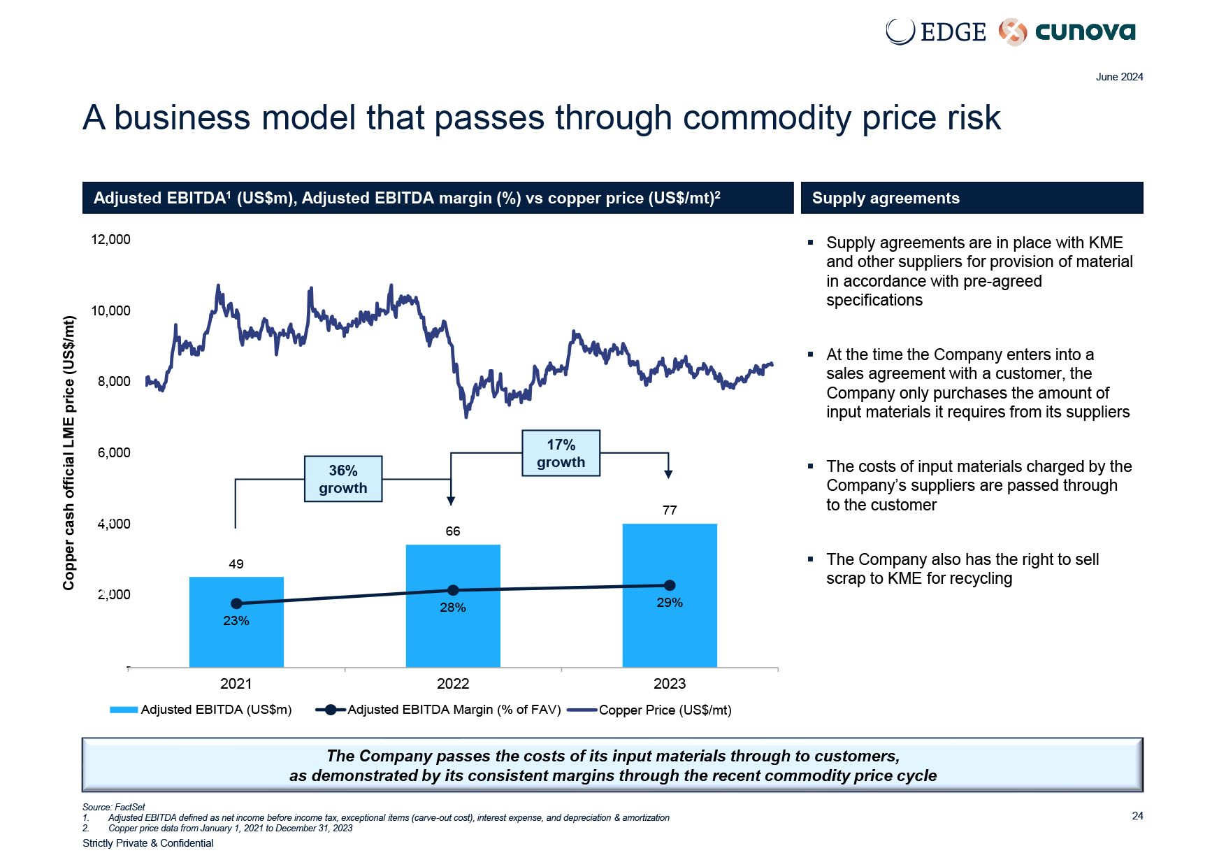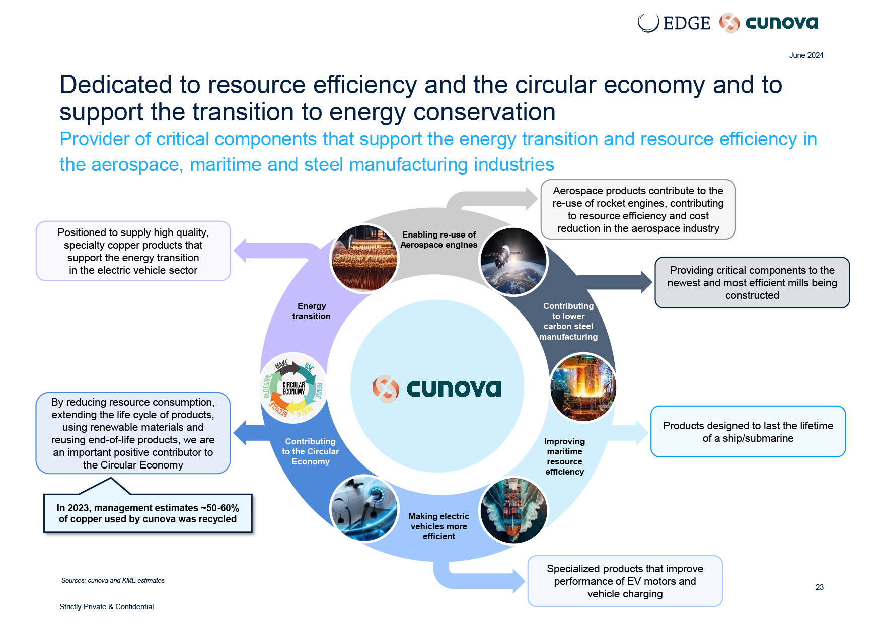 Strictly Private & Confidential Dedicated to resource efficiency and the circular economy and to support the transition to energy conservation 23 Provider of critical components that support the energy transition and resource efficiency in the aerospace, maritime and steel manufacturing industries Sources: cunova and KME estimates Energy transition Improving maritime resource efficiency Making electric vehicles more efficient Contributing to the Circular Economy Positioned to supply high quality, specialty copper products that support the energy transition in the electric vehicle sector Aerospace products contribute to the re - use of rocket engines, contributing to resource efficiency and cost reduction in the aerospace industry Providing critical components to the newest and most efficient mills being constructed Products designed to last the lifetime of a ship/submarine Specialized products that improve performance of EV motors and vehicle charging By reducing resource consumption, extending the life cycle of products, using renewable materials and reusing end - of - life products, we are an important positive contributor to the Circular Economy In 2023, management estimates ~50 - 60% of copper used by cunova was recycled Contributing to lower carbon steel manufacturing Enabling re - use of Aerospace engines June 2024