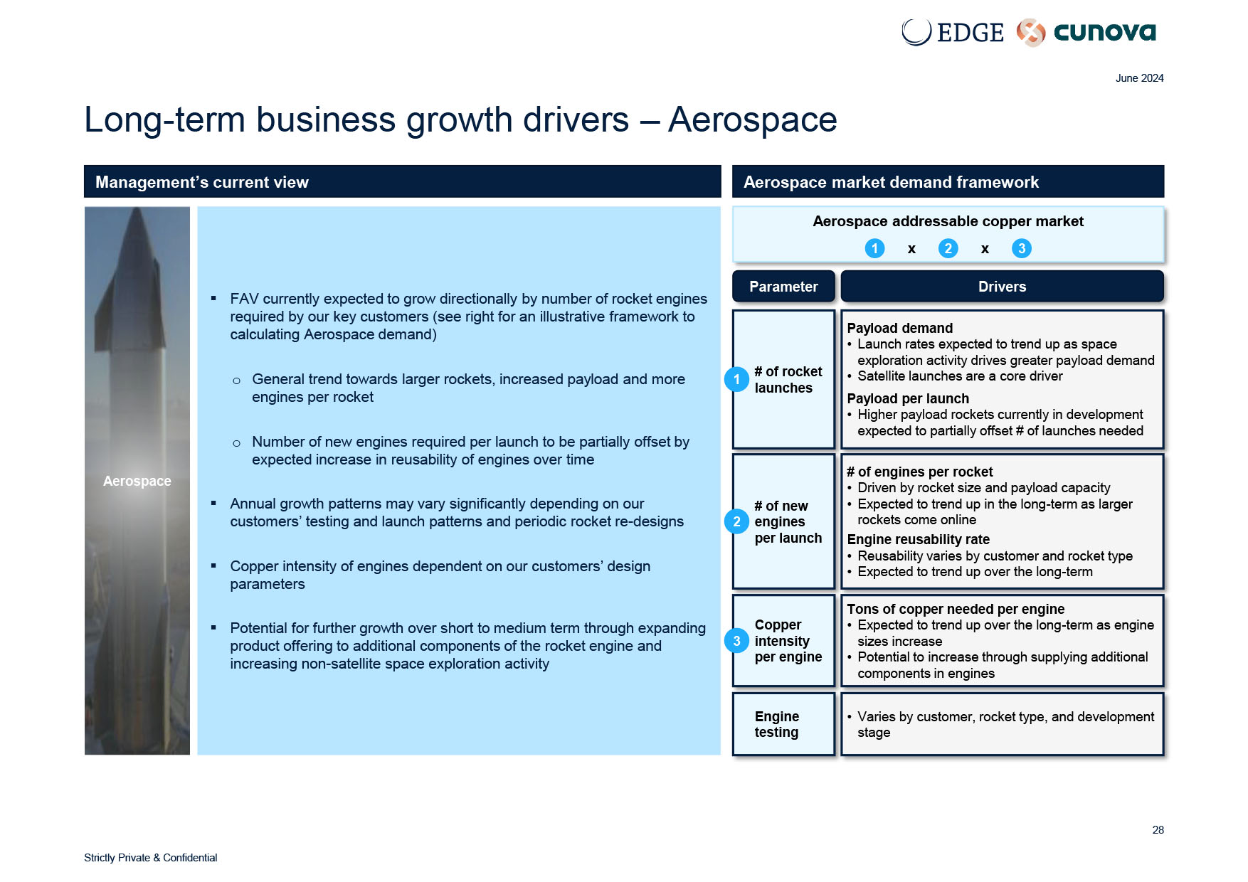 Strictly Private & Confidential Long - term business growth drivers – Aerospace 28 ▪ FAV currently expected to grow directionally by number of rocket engines required by our key customers (see right for an illustrative framework to calculating Aerospace demand) o General trend towards larger rockets, increased payload and more engines per rocket o Number of new engines required per launch to be partially offset by expected increase in reusability of engines over time ▪ Annual growth patterns may vary significantly depending on our customers’ testing and launch patterns and periodic rocket re - designs ▪ Copper intensity of engines dependent on our customers’ design parameters ▪ Potential for further growth over short to medium term through expanding product offering to additional components of the rocket engine and increasing non - satellite space exploration activity Management’s current view June 2024 Aerospace Aerospace market demand framework Aerospace addressable copper market x x # of rocket launches # of new engines per launch Copper intensity per engine 1 2 3 1 2 3 Engine testing Parameter Drivers Payload demand • Launch rates expected to trend up as space exploration activity drives greater payload demand • Satellite launches are a core driver Payload per launch • Higher payload rockets currently in development expected to partially offset # of launches needed # of engines per rocket • Driven by rocket size and payload capacity • Expected to trend up in the long - term as larger rockets come online Engine reusability rate • Reusability varies by customer and rocket type • Expected to trend up over the long - term Tons of copper needed per engine • Expected to trend up over the long - term as engine sizes increase • Potential to increase through supplying additional components in engines • Varies by customer, rocket type, and development stage