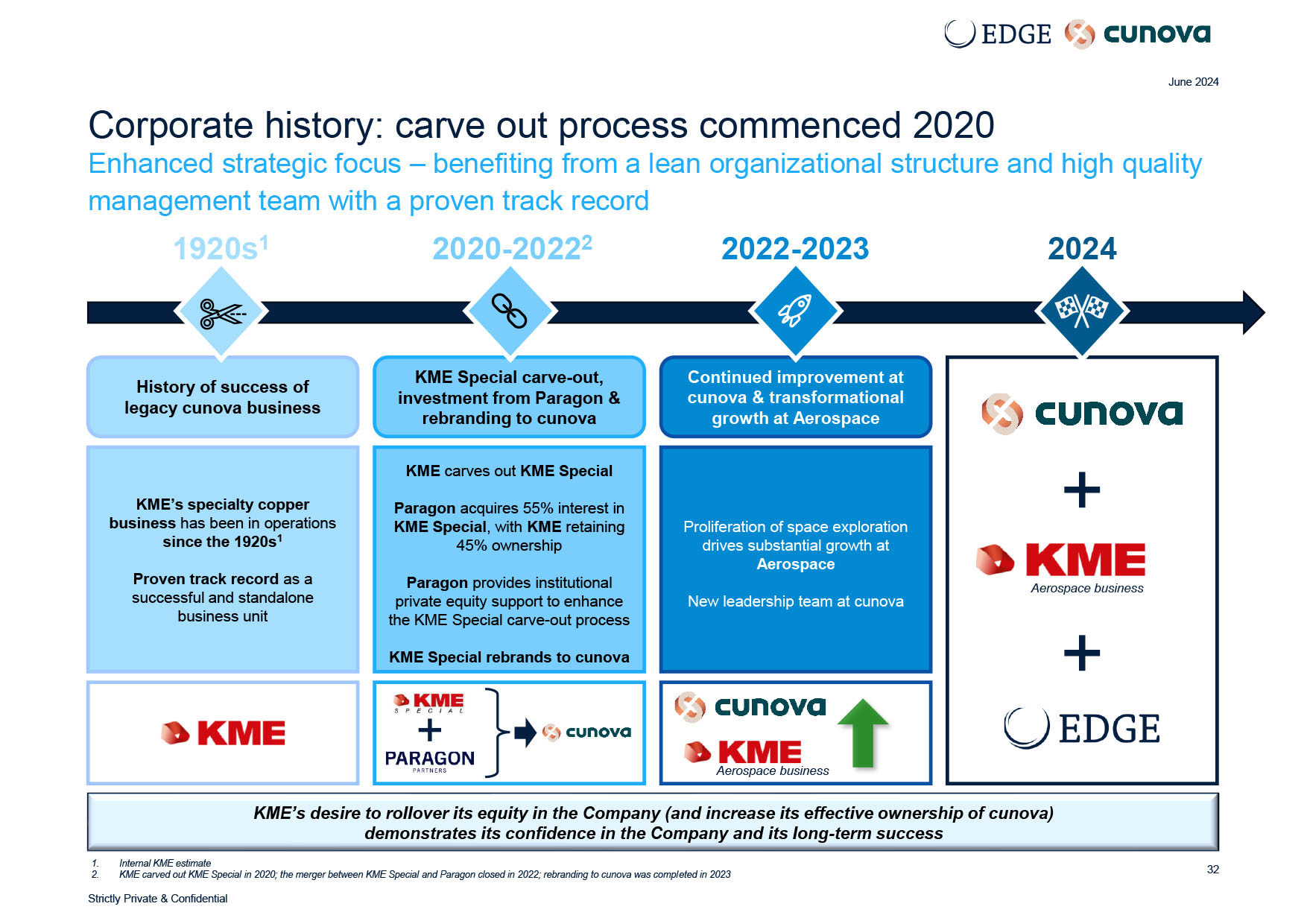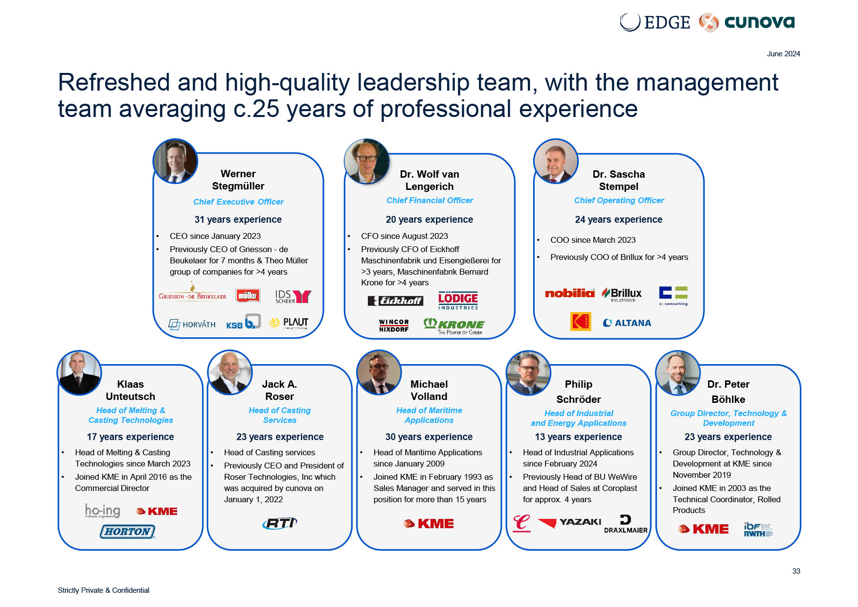 Strictly Private & Confidential Corporate history: carve out process commenced 2020 32 Enhanced strategic focus – benefiting from a lean organizational structure and high quality management team with a proven track record Proliferation of space exploration drives substantial growth at Aerospace New leadership team at cunova KME carves out KME Special Paragon acquires 55% interest in KME Special , with KME retaining 45% ownership Paragon provides institutional private equity support to enhance the KME Special carve - out process KME Special rebrands to cunova KME’s specialty copper business has been in operations since the 1920s 1 Proven track record as a successful and standalone business unit History of success of legacy cunova business KME Special carve - out, investment from Paragon & rebranding to cunova Continued improvement at cunova & transformational growth at Aerospace 2020 - 2022 2 2022 - 2023 2024 1. Internal KME estimate 2. KME carved out KME Special in 2020; the merger between KME Special and Paragon closed in 2022; rebranding to cunova was compl ete d in 2023 1920s 1 KME’s desire to rollover its equity in the Company (and increase its effective ownership of cunova) demonstrates its confidence in the Company and its long - term success Aerospace business Aerospace business June 2024