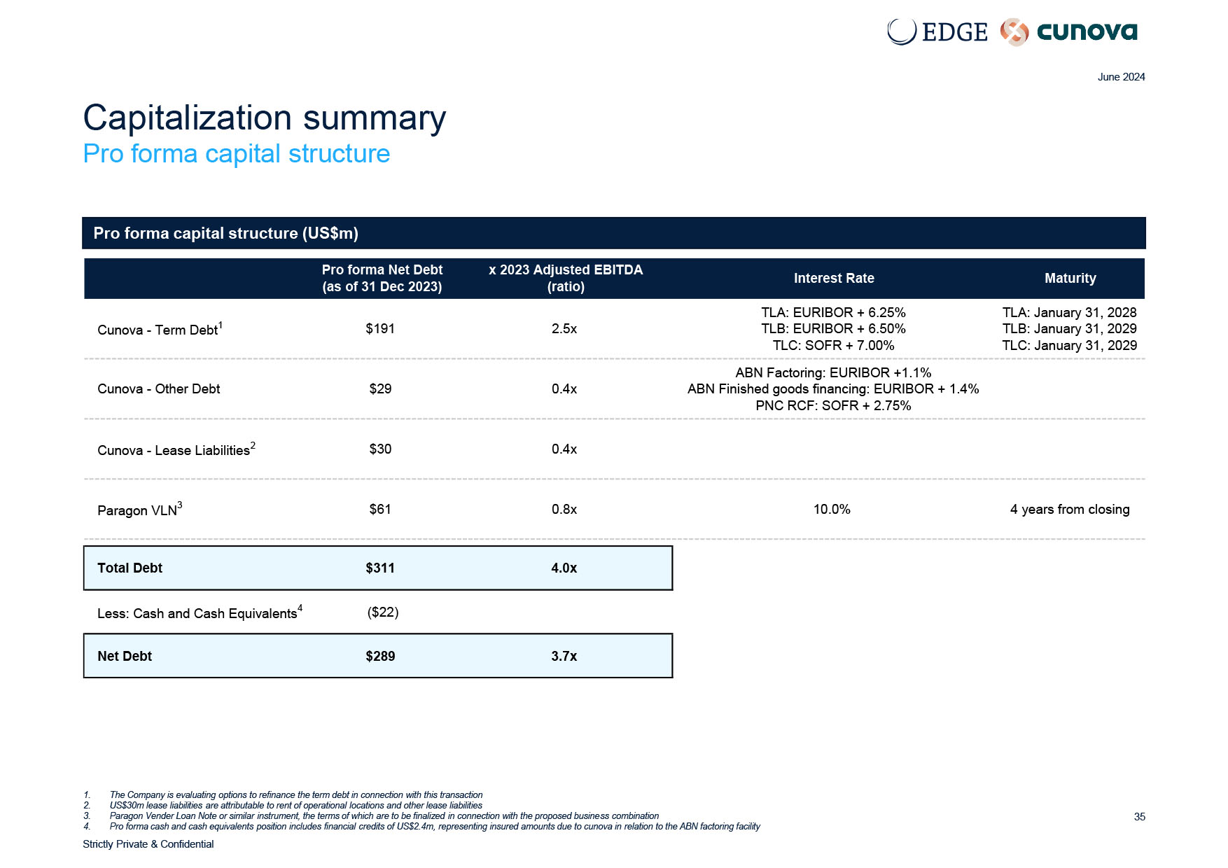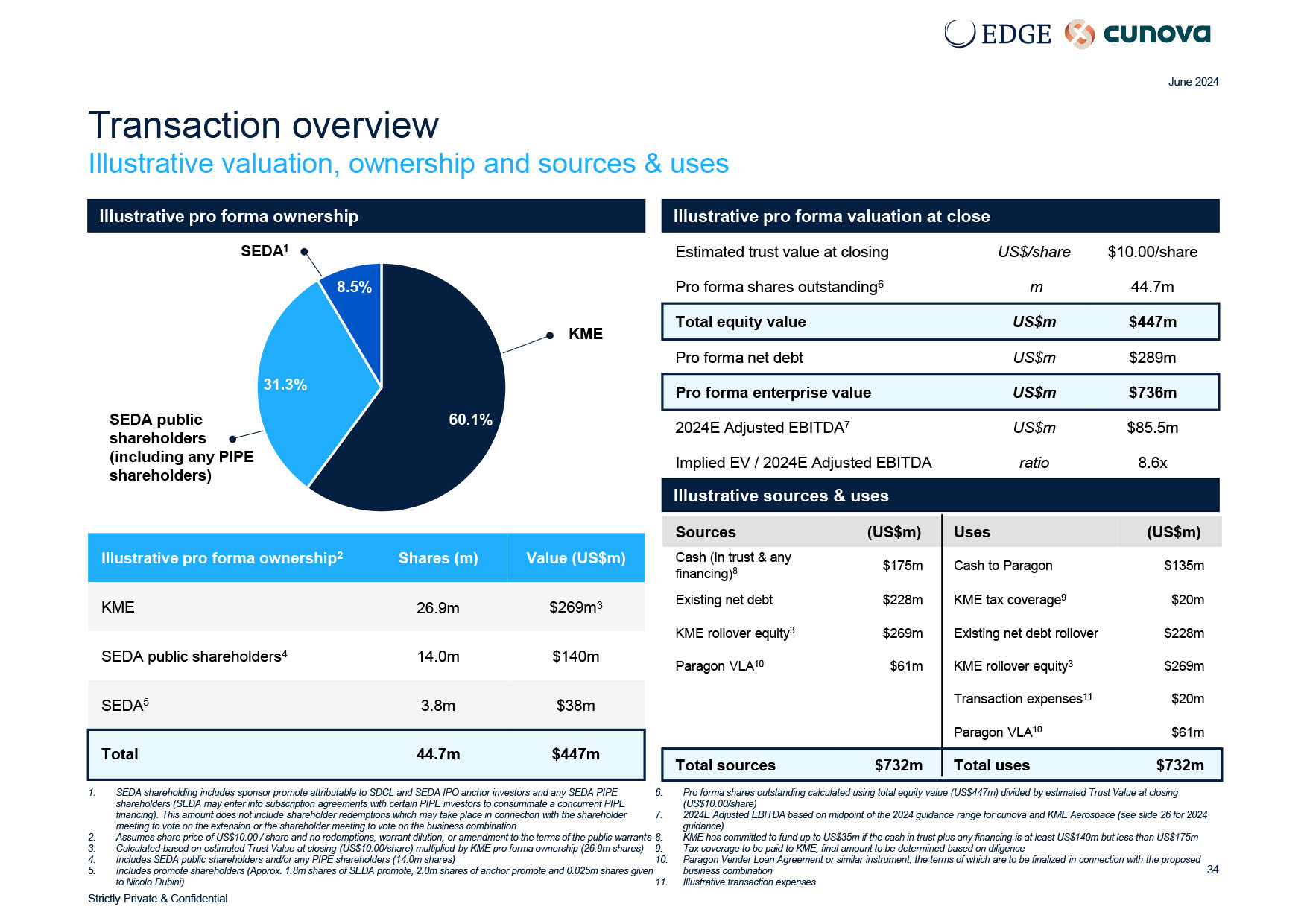 Strictly Private & Confidential $10.00/share US$/share Estimated trust value at closing 44.7m m Pro forma shares outstanding 6 $447m US$m Total equity value $289m US$m Pro forma net debt $736m US$m Pro forma enterprise value $85.5m US$m 2024E Adjusted EBITDA 7 8.6x ratio Implied EV / 2024E Adjusted EBITDA Transaction overview 34 Illustrative valuation, ownership and sources & uses 1. SEDA shareholding includes sponsor promote attributable to SDCL and SEDA IPO anchor investors and any SEDA PIPE shareholders (SEDA may enter into subscription agreements with certain PIPE investors to consummate a concurrent PIPE financing). This amount does not include shareholder redemptions which may take place in connection with the shareholder meeting to vote on the extension or the shareholder meeting to vote on the business combination 2. Assumes share price of US$10.00 / share and no redemptions, warrant dilution, or amendment to the terms of the public warrant s 3. Calculated based on estimated Trust Value at closing (US$10.00/share) multiplied by KME pro forma ownership (26.9m shares) 4. Includes SEDA public shareholders and/or any PIPE shareholders (14.0m shares) 5. Includes promote shareholders (Approx. 1.8m shares of SEDA promote, 2.0m shares of anchor promote and 0.025m shares given to Nicolo Dubini ) 6. Pro forma shares outstanding calculated using total equity value (US$447m) divided by estimated Trust Value at closing (US$10.00/share) 7. 2024E Adjusted EBITDA based on midpoint of the 2024 guidance range for cunova and KME Aerospace (see slide 26 for 2024 guidance) 8. KME has committed to fund up to US$35m if the cash in trust plus any financing is at least US$140m but less than US$175m 9. Tax coverage to be paid to KME, final amount to be determined based on diligence 10. Paragon Vender Loan Agreement or similar instrument, the terms of which are to be finalized in connection with the proposed business combination 11. Illustrative transaction expenses KME SEDA public shareholders (including any PIPE shareholders) SEDA 1 Illustrative pro forma ownership Illustrative pro forma valuation at close Value (US$m) Shares (m) Illustrative pro forma ownership 2 $269m 3 26.9m KME $140m 14.0m SEDA public shareholders 4 $38m 3.8m SEDA 5 $447m 44.7m Total (US$m) Uses (US$m) Sources $135m Cash to Paragon $175m Cash (in trust & any financing) 8 $20m KME tax coverage 9 $228m Existing net debt $228m Existing net debt rollover $269m KME rollover equity 3 $269m KME rollover equity 3 $61m Paragon VLA 10 $20m Transaction expenses 11 $61m Paragon VLA 10 $732m Total uses $732m Total sources Illustrative sources & uses 60.1% 31.3% 8.5% June 2024