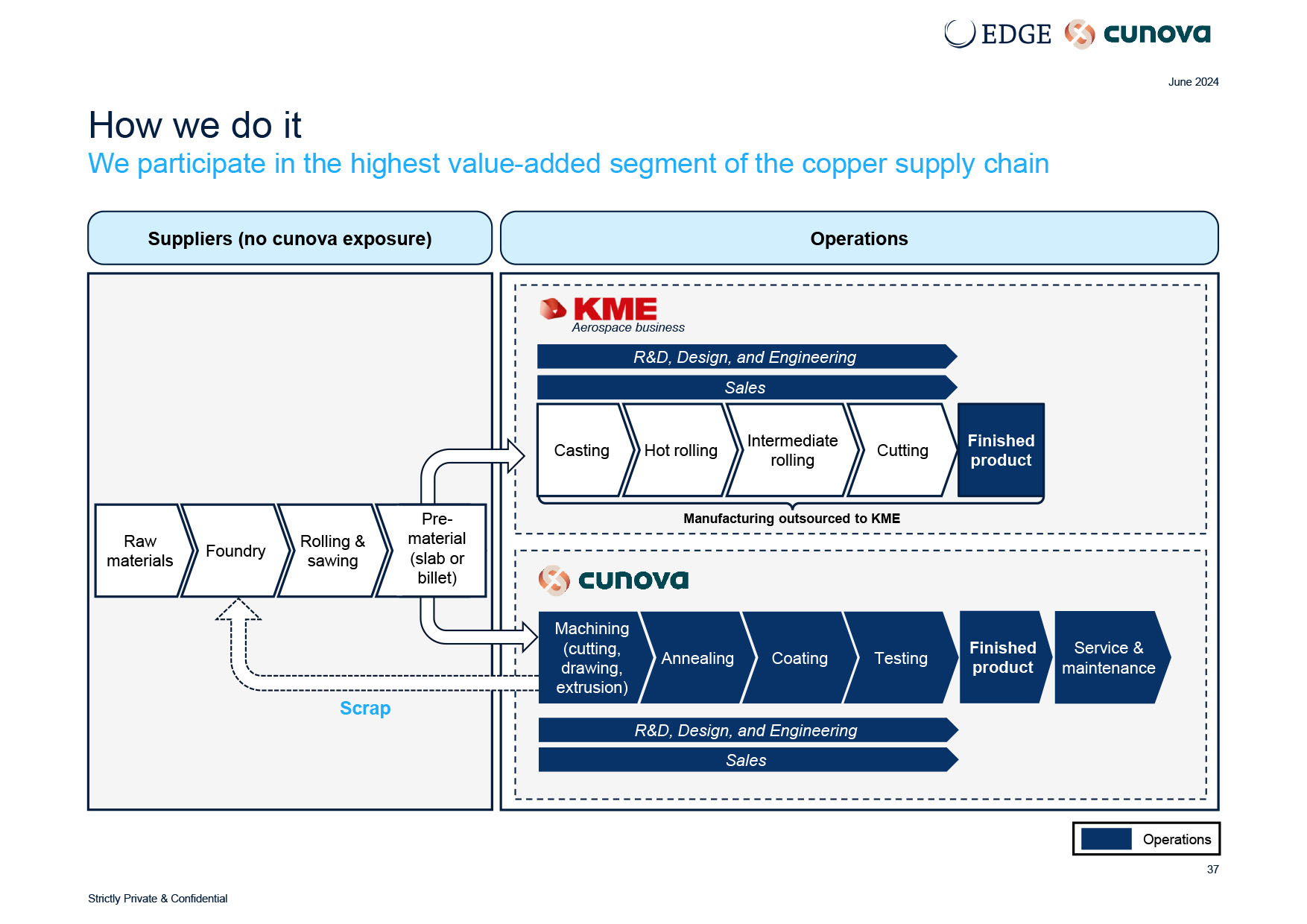 Strictly Private & Confidential + How we do it 37 We participate in the highest value - added segment of the copper supply chain Suppliers (no cunova exposure) Operations Scrap Rolling & sawing Foundry Raw materials Finished product Cutting Hot rolling Intermediate rolling Casting Testing Annealing Coating R&D, Design, and Engineering Sales Sales R&D, Design, and Engineering Service & maintenance Manufacturing outsourced to KME Operations Finished product Aerospace business Machining (cutting, drawing, extrusion) Pre - material (slab or billet) June 2024