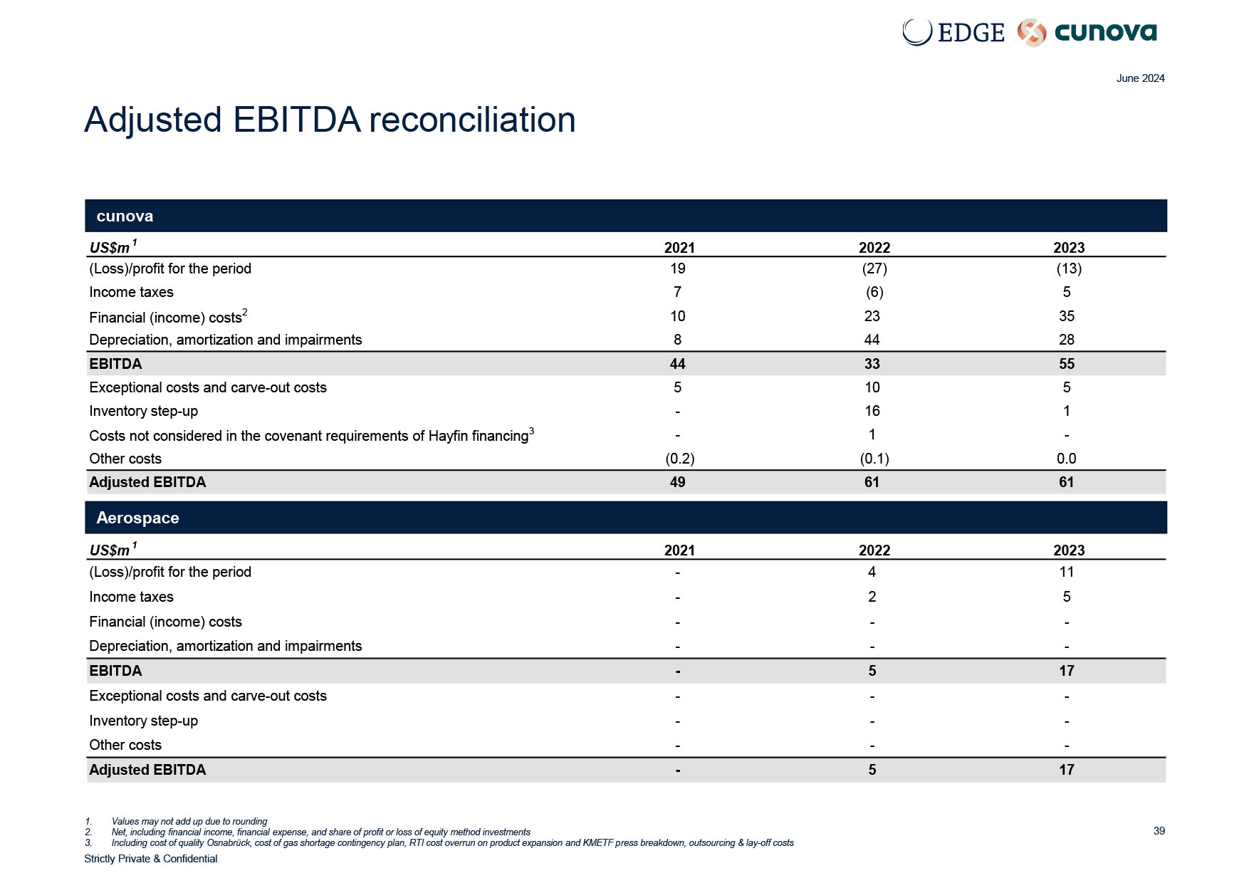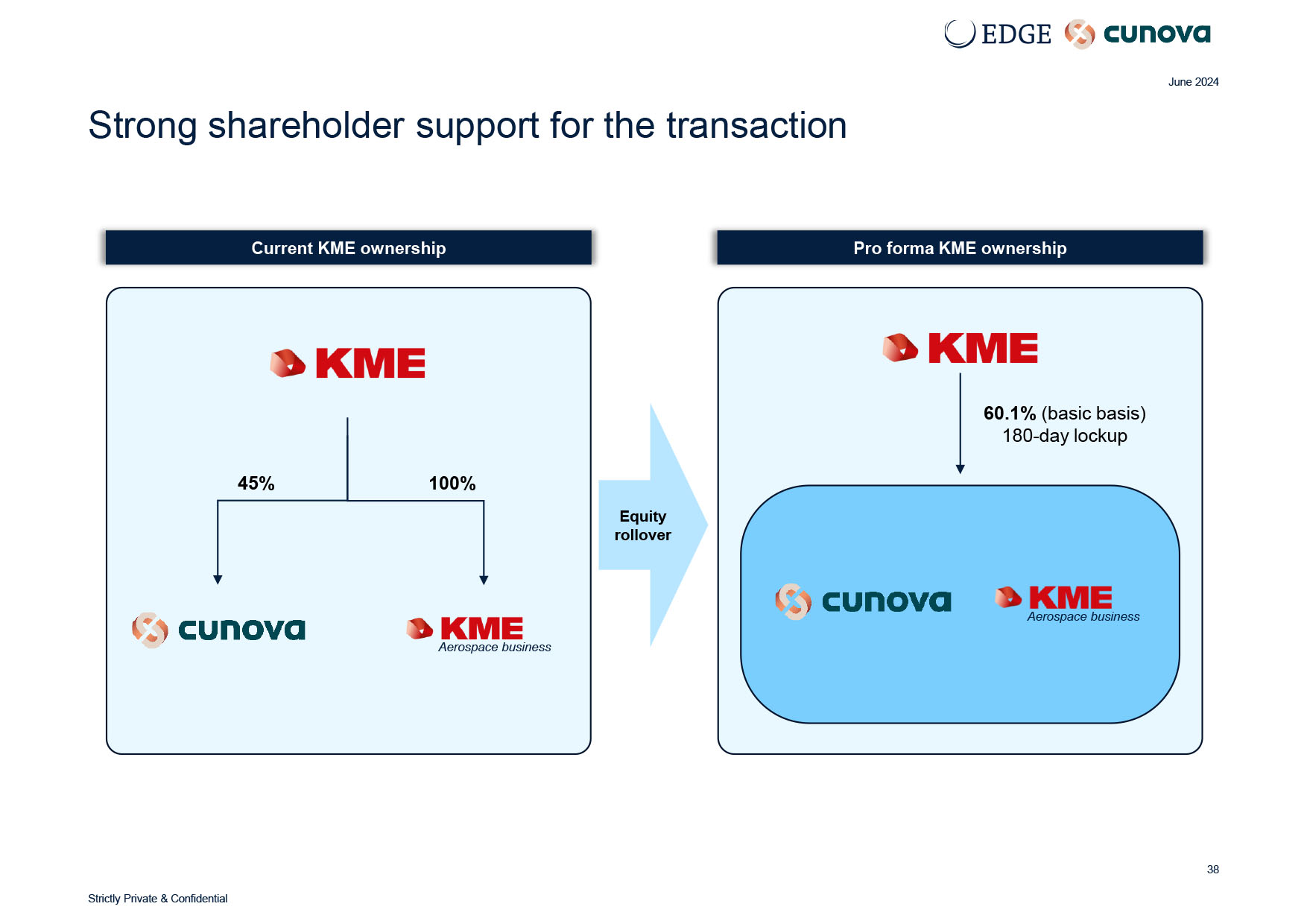 Strictly Private & Confidential 38 45% 100% 60.1% (basic basis) 180 - day lockup Equity rollover Current KME ownership Pro forma KME ownership Strong shareholder support for the transaction Aerospace business Aerospace business June 2024