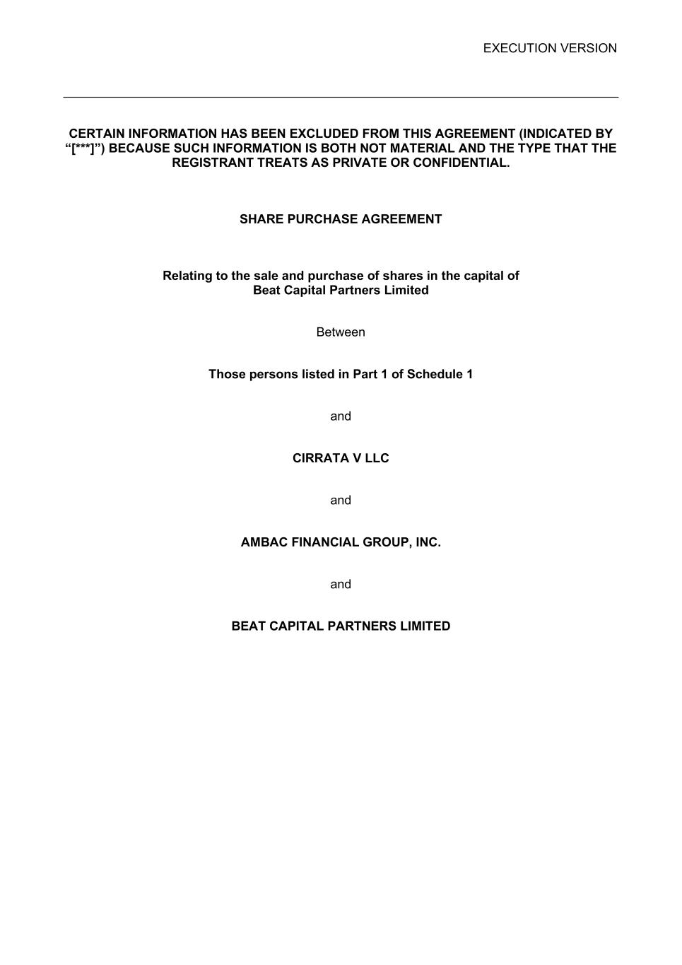 EXECUTION VERSION CERTAIN INFORMATION HAS BEEN EXCLUDED FROM THIS AGREEMENT (INDICATED BY “[***]”) BECAUSE SUCH INFORMATION IS BOTH NOT MATERIAL AND THE TYPE THAT THE REGISTRANT TREATS AS PRIVATE OR CONFIDENTIAL. SHARE PURCHASE AGREEMENT Relating to the sale and purchase of shares in the capital of Beat Capital Partners Limited Between Those persons listed in Part 1 of Schedule 1 and CIRRATA V LLC and AMBAC FINANCIAL GROUP, INC. and BEAT CAPITAL PARTNERS LIMITED