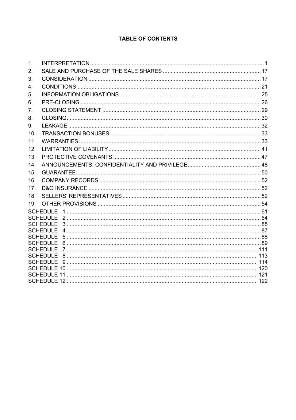 TABLE OF CONTENTS 1. INTERPRETATION ................................................................................................................ 1 2. SALE AND PURCHASE OF THE SALE SHARES ............................................................... 17 3. CONSIDERATION ............................................................................................................... 17 4. CONDITIONS ...................................................................................................................... 21 5. INFORMATION OBLIGATIONS ........................................................................................... 25 6. PRE-CLOSING .................................................................................................................... 26 7. CLOSING STATEMENT ...................................................................................................... 29 8. CLOSING ............................................................................................................................. 30 9. LEAKAGE ............................................................................................................................ 32 10. TRANSACTION BONUSES ................................................................................................. 33 11. WARRANTIES ..................................................................................................................... 33 12. LIMITATION OF LIABILITY .................................................................................................. 41 13. PROTECTIVE COVENANTS ............................................................................................... 47 14. ANNOUNCEMENTS, CONFIDENTIALITY AND PRIVILEGE ............................................... 48 15. GUARANTEE ....................................................................................................................... 50 16. COMPANY RECORDS ........................................................................................................ 52 17. D&O INSURANCE ............................................................................................................... 52 18. SELLERS' REPRESENTATIVES ......................................................................................... 52 19. OTHER PROVISIONS ......................................................................................................... 54 SCHEDULE 1 ............................................................................................................................. 61 SCHEDULE 2 ............................................................................................................................. 64 SCHEDULE 3 ............................................................................................................................. 85 SCHEDULE 4 ............................................................................................................................. 87 SCHEDULE 5 ............................................................................................................................. 88 SCHEDULE 6 ............................................................................................................................. 89 SCHEDULE 7 ........................................................................................................................... 111 SCHEDULE 8 ........................................................................................................................... 113 SCHEDULE 9 ........................................................................................................................... 114 SCHEDULE 10 ........................................................................................................................... 120 SCHEDULE 11 ........................................................................................................................... 121 SCHEDULE 12 ........................................................................................................................... 122