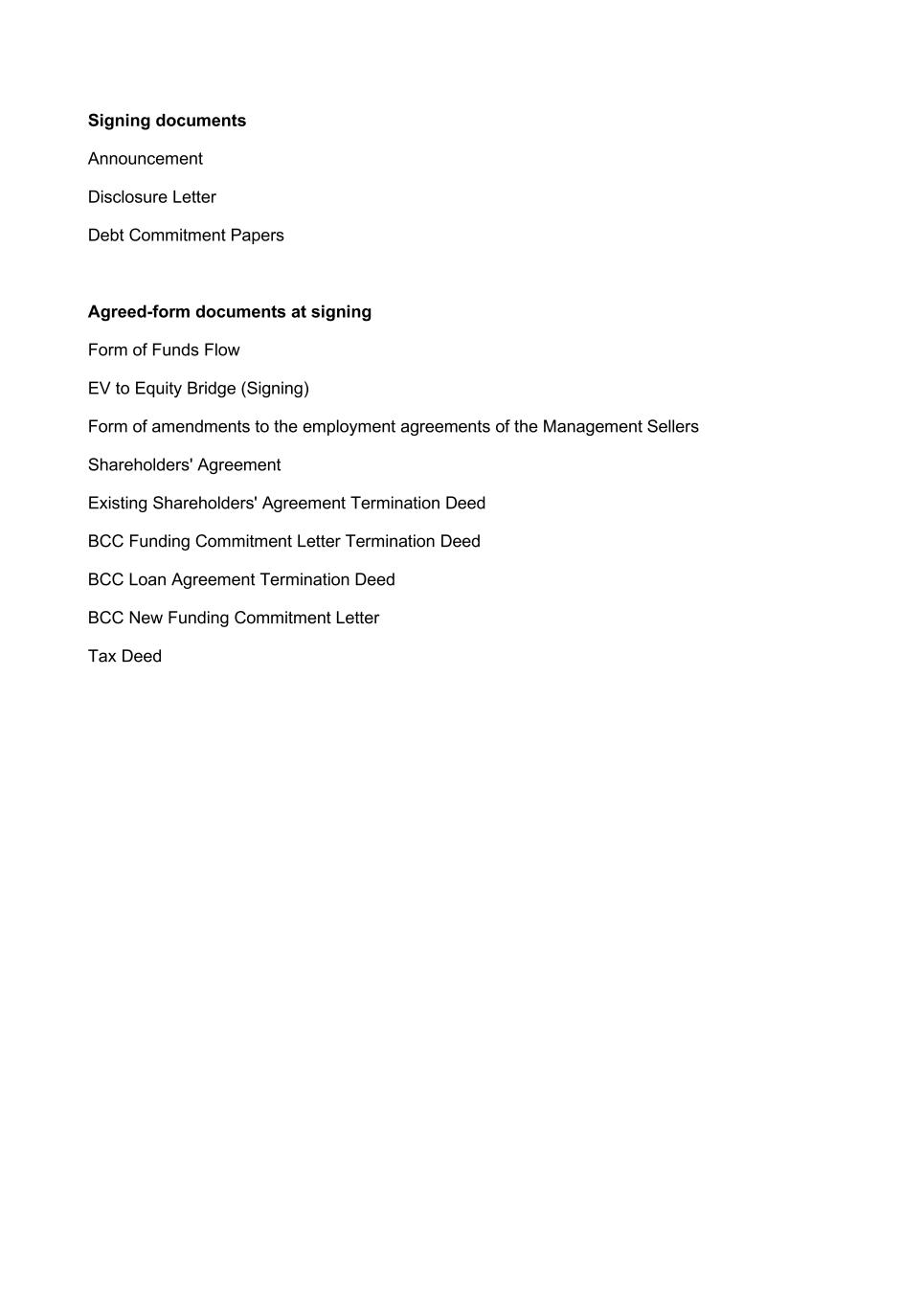 Signing documents Announcement Disclosure Letter Debt Commitment Papers Agreed-form documents at signing Form of Funds Flow EV to Equity Bridge (Signing) Form of amendments to the employment agreements of the Management Sellers Shareholders' Agreement Existing Shareholders' Agreement Termination Deed BCC Funding Commitment Letter Termination Deed BCC Loan Agreement Termination Deed BCC New Funding Commitment Letter Tax Deed