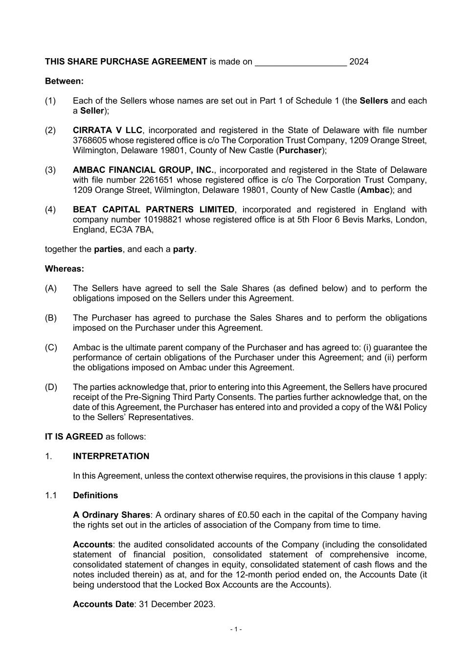 - 1 - THIS SHARE PURCHASE AGREEMENT is made on ___________________ 2024 Between: (1) Each of the Sellers whose names are set out in Part 1 of Schedule 1 (the Sellers and each a Seller); (2) CIRRATA V LLC, incorporated and registered in the State of Delaware with file number 3768605 whose registered office is c/o The Corporation Trust Company, 1209 Orange Street, Wilmington, Delaware 19801, County of New Castle (Purchaser); (3) AMBAC FINANCIAL GROUP, INC., incorporated and registered in the State of Delaware with file number 2261651 whose registered office is c/o The Corporation Trust Company, 1209 Orange Street, Wilmington, Delaware 19801, County of New Castle (Ambac); and (4) BEAT CAPITAL PARTNERS LIMITED, incorporated and registered in England with company number 10198821 whose registered office is at 5th Floor 6 Bevis Marks, London, England, EC3A 7BA, together the parties, and each a party. Whereas: (A) The Sellers have agreed to sell the Sale Shares (as defined below) and to perform the obligations imposed on the Sellers under this Agreement. (B) The Purchaser has agreed to purchase the Sales Shares and to perform the obligations imposed on the Purchaser under this Agreement. (C) Ambac is the ultimate parent company of the Purchaser and has agreed to: (i) guarantee the performance of certain obligations of the Purchaser under this Agreement; and (ii) perform the obligations imposed on Ambac under this Agreement. (D) The parties acknowledge that, prior to entering into this Agreement, the Sellers have procured receipt of the Pre-Signing Third Party Consents. The parties further acknowledge that, on the date of this Agreement, the Purchaser has entered into and provided a copy of the W&I Policy to the Sellers’ Representatives. IT IS AGREED as follows: 1. INTERPRETATION In this Agreement, unless the context otherwise requires, the provisions in this clause 1 apply: 1.1 Definitions A Ordinary Shares: A ordinary shares of £0.50 each in the capital of the Company having the rights set out in the articles of association of the Company from time to time. Accounts: the audited consolidated accounts of the Company (including the consolidated statement of financial position, consolidated statement of comprehensive income, consolidated statement of changes in equity, consolidated statement of cash flows and the notes included therein) as at, and for the 12-month period ended on, the Accounts Date (it being understood that the Locked Box Accounts are the Accounts). Accounts Date: 31 December 2023.