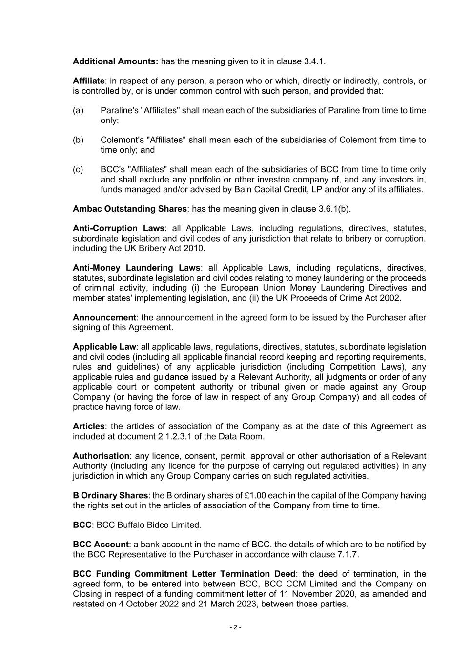 - 2 - Additional Amounts: has the meaning given to it in clause 3.4.1. Affiliate: in respect of any person, a person who or which, directly or indirectly, controls, or is controlled by, or is under common control with such person, and provided that: (a) Paraline's "Affiliates" shall mean each of the subsidiaries of Paraline from time to time only; (b) Colemont's "Affiliates" shall mean each of the subsidiaries of Colemont from time to time only; and (c) BCC's "Affiliates" shall mean each of the subsidiaries of BCC from time to time only and shall exclude any portfolio or other investee company of, and any investors in, funds managed and/or advised by Bain Capital Credit, LP and/or any of its affiliates. Ambac Outstanding Shares: has the meaning given in clause 3.6.1(b). Anti-Corruption Laws: all Applicable Laws, including regulations, directives, statutes, subordinate legislation and civil codes of any jurisdiction that relate to bribery or corruption, including the UK Bribery Act 2010. Anti-Money Laundering Laws: all Applicable Laws, including regulations, directives, statutes, subordinate legislation and civil codes relating to money laundering or the proceeds of criminal activity, including (i) the European Union Money Laundering Directives and member states' implementing legislation, and (ii) the UK Proceeds of Crime Act 2002. Announcement: the announcement in the agreed form to be issued by the Purchaser after signing of this Agreement. Applicable Law: all applicable laws, regulations, directives, statutes, subordinate legislation and civil codes (including all applicable financial record keeping and reporting requirements, rules and guidelines) of any applicable jurisdiction (including Competition Laws), any applicable rules and guidance issued by a Relevant Authority, all judgments or order of any applicable court or competent authority or tribunal given or made against any Group Company (or having the force of law in respect of any Group Company) and all codes of practice having force of law. Articles: the articles of association of the Company as at the date of this Agreement as included at document 2.1.2.3.1 of the Data Room. Authorisation: any licence, consent, permit, approval or other authorisation of a Relevant Authority (including any licence for the purpose of carrying out regulated activities) in any jurisdiction in which any Group Company carries on such regulated activities. B Ordinary Shares: the B ordinary shares of £1.00 each in the capital of the Company having the rights set out in the articles of association of the Company from time to time. BCC: BCC Buffalo Bidco Limited. BCC Account: a bank account in the name of BCC, the details of which are to be notified by the BCC Representative to the Purchaser in accordance with clause 7.1.7. BCC Funding Commitment Letter Termination Deed: the deed of termination, in the agreed form, to be entered into between BCC, BCC CCM Limited and the Company on Closing in respect of a funding commitment letter of 11 November 2020, as amended and restated on 4 October 2022 and 21 March 2023, between those parties.