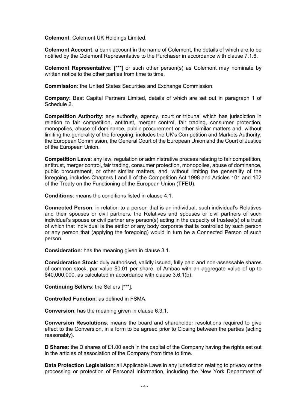 - 4 - Colemont: Colemont UK Holdings Limited. Colemont Account: a bank account in the name of Colemont, the details of which are to be notified by the Colemont Representative to the Purchaser in accordance with clause 7.1.6. Colemont Representative: [***] or such other person(s) as Colemont may nominate by written notice to the other parties from time to time. Commission: the United States Securities and Exchange Commission. Company: Beat Capital Partners Limited, details of which are set out in paragraph 1 of Schedule 2. Competition Authority: any authority, agency, court or tribunal which has jurisdiction in relation to fair competition, antitrust, merger control, fair trading, consumer protection, monopolies, abuse of dominance, public procurement or other similar matters and, without limiting the generality of the foregoing, includes the UK's Competition and Markets Authority, the European Commission, the General Court of the European Union and the Court of Justice of the European Union. Competition Laws: any law, regulation or administrative process relating to fair competition, antitrust, merger control, fair trading, consumer protection, monopolies, abuse of dominance, public procurement, or other similar matters, and, without limiting the generality of the foregoing, includes Chapters I and II of the Competition Act 1998 and Articles 101 and 102 of the Treaty on the Functioning of the European Union (TFEU). Conditions: means the conditions listed in clause 4.1. Connected Person: in relation to a person that is an individual, such individual’s Relatives and their spouses or civil partners, the Relatives and spouses or civil partners of such individual’s spouse or civil partner any person(s) acting in the capacity of trustee(s) of a trust of which that individual is the settlor or any body corporate that is controlled by such person or any person that (applying the foregoing) would in turn be a Connected Person of such person. Consideration: has the meaning given in clause 3.1. Consideration Stock: duly authorised, validly issued, fully paid and non-assessable shares of common stock, par value $0.01 per share, of Ambac with an aggregate value of up to $40,000,000, as calculated in accordance with clause 3.6.1(b). Continuing Sellers: the Sellers [***]. Controlled Function: as defined in FSMA. Conversion: has the meaning given in clause 6.3.1. Conversion Resolutions: means the board and shareholder resolutions required to give effect to the Conversion, in a form to be agreed prior to Closing between the parties (acting reasonably). D Shares: the D shares of £1.00 each in the capital of the Company having the rights set out in the articles of association of the Company from time to time. Data Protection Legislation: all Applicable Laws in any jurisdiction relating to privacy or the processing or protection of Personal Information, including the New York Department of