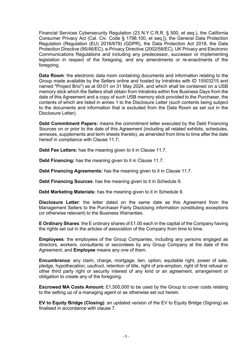 - 5 - Financial Services Cybersecurity Regulation (23 N.Y.C.R.R. § 500, et seq.), the California Consumer Privacy Act (Cal. Civ. Code § 1798.100, et seq.]), the General Data Protection Regulation (Regulation (EU) 2016/679) (GDPR), the Data Protection Act 2018, the Data Protection Directive (95/46/EC), e-Privacy Directive (2002/58/EC), UK Privacy and Electronic Communications Regulations and including any predecessor, successor or implementing legislation in respect of the foregoing, and any amendments or re-enactments of the foregoing. Data Room: the electronic data room containing documents and information relating to the Group made available by the Sellers online and hosted by Intralinks with ID 15503215 and named "Project Brio") as at 00:01 on 31 May 2024, and which shall be contained on a USB memory stick which the Sellers shall obtain from Intralinks within five Business Days from the date of this Agreement and a copy of such USB memory stick provided to the Purchaser, the contents of which are listed in annex 1 to the Disclosure Letter (such contents being subject to the documents and information that is excluded from the Data Room as set out in the Disclosure Letter). Debt Commitment Papers: means the commitment letter executed by the Debt Financing Sources on or prior to the date of this Agreement (including all related exhibits, schedules, annexes, supplements and term sheets thereto), as amended from time to time after the date hereof in compliance with Clause 11.7; Debt Fee Letters: has the meaning given to it in Clause 11.7. Debt Financing: has the meaning given to it in Clause 11.7. Debt Financing Agreements: has the meaning given to it in Clause 11.7. Debt Financing Sources: has the meaning given to it in Schedule 9. Debt Marketing Materials: has the meaning given to it in Schedule 9. Disclosure Letter: the letter dated on the same date as this Agreement from the Management Sellers to the Purchaser Fairly Disclosing information constituting exceptions (or otherwise relevant) to the Business Warranties. E Ordinary Shares: the E ordinary shares of £1.00 each in the capital of the Company having the rights set out in the articles of association of the Company from time to time. Employees: the employees of the Group Companies, including any persons engaged as directors, workers, consultants or secondees by any Group Company at the date of this Agreement, and Employee means any one of them. Encumbrance: any claim, charge, mortgage, lien, option, equitable right, power of sale, pledge, hypothecation, usufruct, retention of title, right of pre-emption, right of first refusal or other third party right or security interest of any kind or an agreement, arrangement or obligation to create any of the foregoing. Escrowed MA Costs Amount: £1,500,000 to be used by the Group to cover costs relating to the setting up of a managing agent or as otherwise set out herein. EV to Equity Bridge (Closing): an updated version of the EV to Equity Bridge (Signing) as finalised in accordance with clause 7.