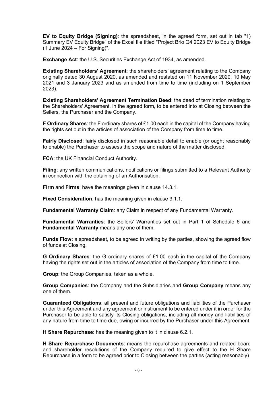 - 6 - EV to Equity Bridge (Signing): the spreadsheet, in the agreed form, set out in tab "1) Summary EV Equity Bridge" of the Excel file titled "Project Brio Q4 2023 EV to Equity Bridge (1 June 2024 – For Signing)". Exchange Act: the U.S. Securities Exchange Act of 1934, as amended. Existing Shareholders' Agreement: the shareholders' agreement relating to the Company originally dated 30 August 2020, as amended and restated on 11 November 2020, 10 May 2021 and 3 January 2023 and as amended from time to time (including on 1 September 2023). Existing Shareholders' Agreement Termination Deed: the deed of termination relating to the Shareholders' Agreement, in the agreed form, to be entered into at Closing between the Sellers, the Purchaser and the Company. F Ordinary Shares: the F ordinary shares of £1.00 each in the capital of the Company having the rights set out in the articles of association of the Company from time to time. Fairly Disclosed: fairly disclosed in such reasonable detail to enable (or ought reasonably to enable) the Purchaser to assess the scope and nature of the matter disclosed. FCA: the UK Financial Conduct Authority. Filing: any written communications, notifications or filings submitted to a Relevant Authority in connection with the obtaining of an Authorisation. Firm and Firms: have the meanings given in clause 14.3.1. Fixed Consideration: has the meaning given in clause 3.1.1. Fundamental Warranty Claim: any Claim in respect of any Fundamental Warranty. Fundamental Warranties: the Sellers' Warranties set out in Part 1 of Schedule 6 and Fundamental Warranty means any one of them. Funds Flow: a spreadsheet, to be agreed in writing by the parties, showing the agreed flow of funds at Closing. G Ordinary Shares: the G ordinary shares of £1.00 each in the capital of the Company having the rights set out in the articles of association of the Company from time to time. Group: the Group Companies, taken as a whole. Group Companies: the Company and the Subsidiaries and Group Company means any one of them. Guaranteed Obligations: all present and future obligations and liabilities of the Purchaser under this Agreement and any agreement or instrument to be entered under it in order for the Purchaser to be able to satisfy its Closing obligations, including all money and liabilities of any nature from time to time due, owing or incurred by the Purchaser under this Agreement. H Share Repurchase: has the meaning given to it in clause 6.2.1. H Share Repurchase Documents: means the repurchase agreements and related board and shareholder resolutions of the Company required to give effect to the H Share Repurchase in a form to be agreed prior to Closing between the parties (acting reasonably)