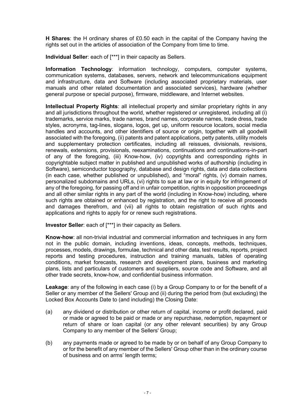 - 7 - H Shares: the H ordinary shares of £0.50 each in the capital of the Company having the rights set out in the articles of association of the Company from time to time. Individual Seller: each of [***] in their capacity as Sellers. Information Technology: information technology, computers, computer systems, communication systems, databases, servers, network and telecommunications equipment and infrastructure, data and Software (including associated proprietary materials, user manuals and other related documentation and associated services), hardware (whether general purpose or special purpose), firmware, middleware, and Internet websites. Intellectual Property Rights: all intellectual property and similar proprietary rights in any and all jurisdictions throughout the world, whether registered or unregistered, including all (i) trademarks, service marks, trade names, brand names, corporate names, trade dress, trade styles, acronyms, tag-lines, slogans, logos, get up, uniform resource locators, social media handles and accounts, and other identifiers of source or origin, together with all goodwill associated with the foregoing, (ii) patents and patent applications, petty patents, utility models and supplementary protection certificates, including all reissues, divisionals, revisions, renewals, extensions, provisionals, reexaminations, continuations and continuations-in-part of any of the foregoing, (iii) Know-how, (iv) copyrights and corresponding rights in copyrightable subject matter in published and unpublished works of authorship (including in Software), semiconductor topography, database and design rights, data and data collections (in each case, whether published or unpublished), and “moral” rights, (v) domain names, personalized subdomains and URLs, (vi) rights to sue at law or in equity for infringement of any of the foregoing, for passing off and in unfair competition, rights in opposition proceedings and all other similar rights in any part of the world (including in Know-how) including, where such rights are obtained or enhanced by registration, and the right to receive all proceeds and damages therefrom, and (vii) all rights to obtain registration of such rights and applications and rights to apply for or renew such registrations. Investor Seller: each of [***] in their capacity as Sellers. Know-how: all non-trivial industrial and commercial information and techniques in any form not in the public domain, including inventions, ideas, concepts, methods, techniques, processes, models, drawings, formulae, technical and other data, test results, reports, project reports and testing procedures, instruction and training manuals, tables of operating conditions, market forecasts, research and development plans, business and marketing plans, lists and particulars of customers and suppliers, source code and Software, and all other trade secrets, know-how, and confidential business information. Leakage: any of the following in each case (i) by a Group Company to or for the benefit of a Seller or any member of the Sellers' Group and (ii) during the period from (but excluding) the Locked Box Accounts Date to (and including) the Closing Date: (a) any dividend or distribution or other return of capital, income or profit declared, paid or made or agreed to be paid or made or any repurchase, redemption, repayment or return of share or loan capital (or any other relevant securities) by any Group Company to any member of the Sellers' Group; (b) any payments made or agreed to be made by or on behalf of any Group Company to or for the benefit of any member of the Sellers' Group other than in the ordinary course of business and on arms’ length terms;