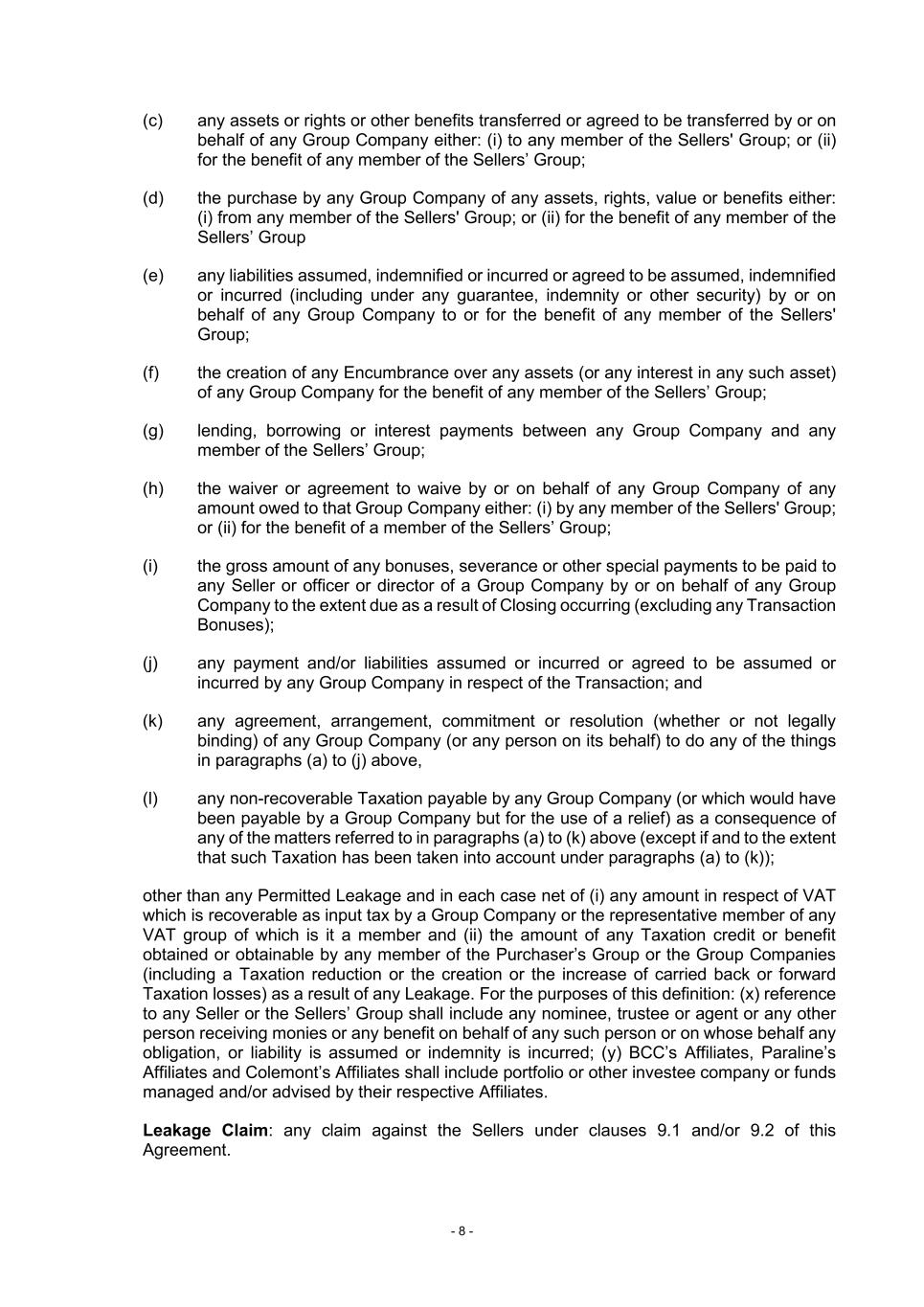 - 8 - (c) any assets or rights or other benefits transferred or agreed to be transferred by or on behalf of any Group Company either: (i) to any member of the Sellers' Group; or (ii) for the benefit of any member of the Sellers’ Group; (d) the purchase by any Group Company of any assets, rights, value or benefits either: (i) from any member of the Sellers' Group; or (ii) for the benefit of any member of the Sellers’ Group (e) any liabilities assumed, indemnified or incurred or agreed to be assumed, indemnified or incurred (including under any guarantee, indemnity or other security) by or on behalf of any Group Company to or for the benefit of any member of the Sellers' Group; (f) the creation of any Encumbrance over any assets (or any interest in any such asset) of any Group Company for the benefit of any member of the Sellers’ Group; (g) lending, borrowing or interest payments between any Group Company and any member of the Sellers’ Group; (h) the waiver or agreement to waive by or on behalf of any Group Company of any amount owed to that Group Company either: (i) by any member of the Sellers' Group; or (ii) for the benefit of a member of the Sellers’ Group; (i) the gross amount of any bonuses, severance or other special payments to be paid to any Seller or officer or director of a Group Company by or on behalf of any Group Company to the extent due as a result of Closing occurring (excluding any Transaction Bonuses); (j) any payment and/or liabilities assumed or incurred or agreed to be assumed or incurred by any Group Company in respect of the Transaction; and (k) any agreement, arrangement, commitment or resolution (whether or not legally binding) of any Group Company (or any person on its behalf) to do any of the things in paragraphs (a) to (j) above, (l) any non-recoverable Taxation payable by any Group Company (or which would have been payable by a Group Company but for the use of a relief) as a consequence of any of the matters referred to in paragraphs (a) to (k) above (except if and to the extent that such Taxation has been taken into account under paragraphs (a) to (k)); other than any Permitted Leakage and in each case net of (i) any amount in respect of VAT which is recoverable as input tax by a Group Company or the representative member of any VAT group of which is it a member and (ii) the amount of any Taxation credit or benefit obtained or obtainable by any member of the Purchaser’s Group or the Group Companies (including a Taxation reduction or the creation or the increase of carried back or forward Taxation losses) as a result of any Leakage. For the purposes of this definition: (x) reference to any Seller or the Sellers’ Group shall include any nominee, trustee or agent or any other person receiving monies or any benefit on behalf of any such person or on whose behalf any obligation, or liability is assumed or indemnity is incurred; (y) BCC’s Affiliates, Paraline’s Affiliates and Colemont’s Affiliates shall include portfolio or other investee company or funds managed and/or advised by their respective Affiliates. Leakage Claim: any claim against the Sellers under clauses 9.1 and/or 9.2 of this Agreement.