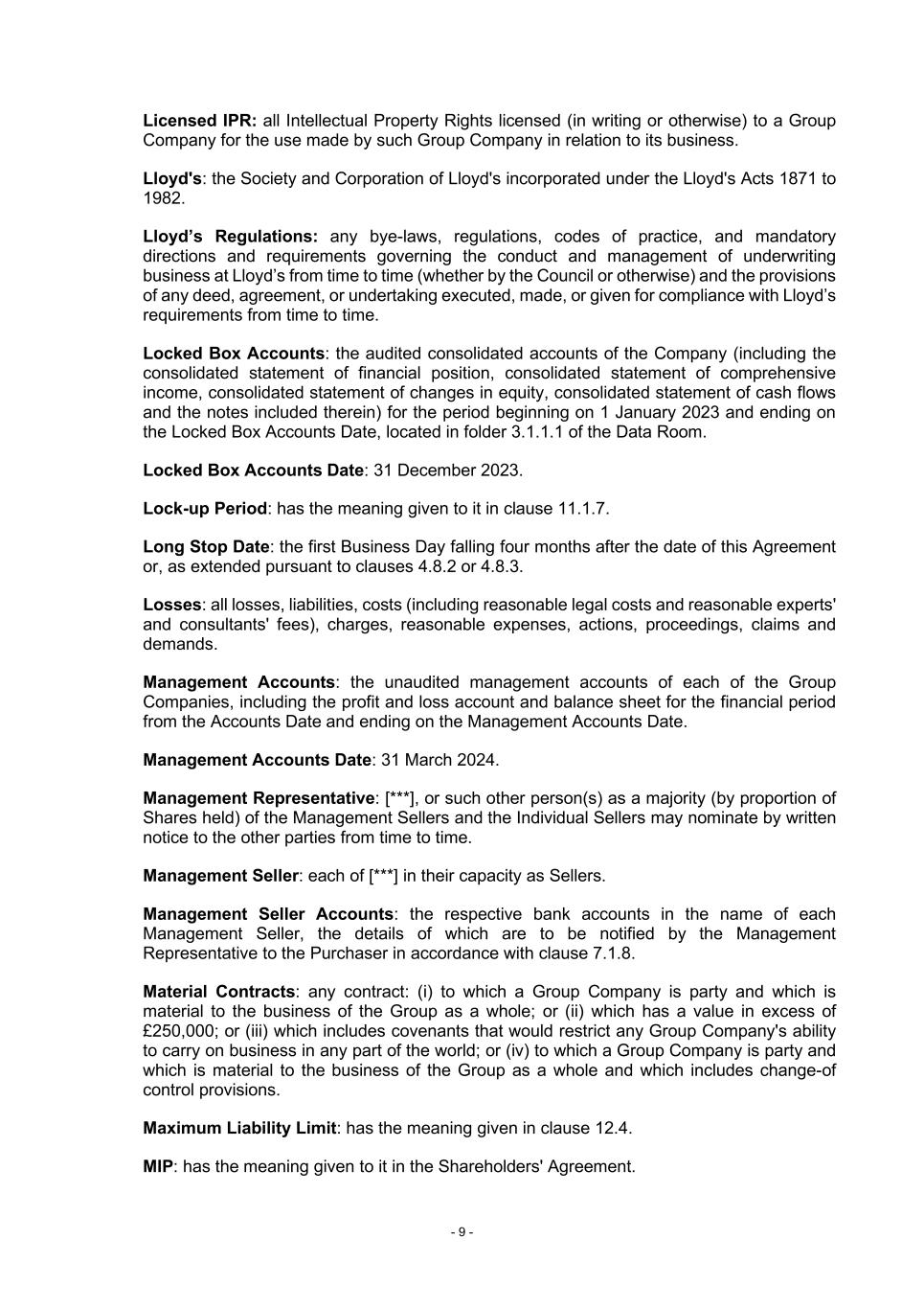 - 9 - Licensed IPR: all Intellectual Property Rights licensed (in writing or otherwise) to a Group Company for the use made by such Group Company in relation to its business. Lloyd's: the Society and Corporation of Lloyd's incorporated under the Lloyd's Acts 1871 to 1982. Lloyd’s Regulations: any bye-laws, regulations, codes of practice, and mandatory directions and requirements governing the conduct and management of underwriting business at Lloyd’s from time to time (whether by the Council or otherwise) and the provisions of any deed, agreement, or undertaking executed, made, or given for compliance with Lloyd’s requirements from time to time. Locked Box Accounts: the audited consolidated accounts of the Company (including the consolidated statement of financial position, consolidated statement of comprehensive income, consolidated statement of changes in equity, consolidated statement of cash flows and the notes included therein) for the period beginning on 1 January 2023 and ending on the Locked Box Accounts Date, located in folder 3.1.1.1 of the Data Room. Locked Box Accounts Date: 31 December 2023. Lock-up Period: has the meaning given to it in clause 11.1.7. Long Stop Date: the first Business Day falling four months after the date of this Agreement or, as extended pursuant to clauses 4.8.2 or 4.8.3. Losses: all losses, liabilities, costs (including reasonable legal costs and reasonable experts' and consultants' fees), charges, reasonable expenses, actions, proceedings, claims and demands. Management Accounts: the unaudited management accounts of each of the Group Companies, including the profit and loss account and balance sheet for the financial period from the Accounts Date and ending on the Management Accounts Date. Management Accounts Date: 31 March 2024. Management Representative: [***], or such other person(s) as a majority (by proportion of Shares held) of the Management Sellers and the Individual Sellers may nominate by written notice to the other parties from time to time. Management Seller: each of [***] in their capacity as Sellers. Management Seller Accounts: the respective bank accounts in the name of each Management Seller, the details of which are to be notified by the Management Representative to the Purchaser in accordance with clause 7.1.8. Material Contracts: any contract: (i) to which a Group Company is party and which is material to the business of the Group as a whole; or (ii) which has a value in excess of £250,000; or (iii) which includes covenants that would restrict any Group Company's ability to carry on business in any part of the world; or (iv) to which a Group Company is party and which is material to the business of the Group as a whole and which includes change-of control provisions. Maximum Liability Limit: has the meaning given in clause 12.4. MIP: has the meaning given to it in the Shareholders' Agreement.