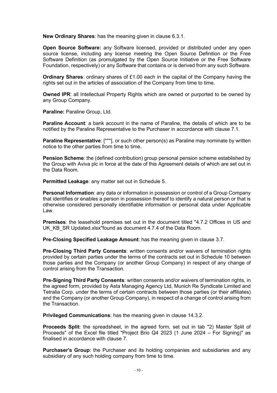 - 10 - New Ordinary Shares: has the meaning given in clause 6.3.1. Open Source Software: any Software licensed, provided or distributed under any open source license, including any license meeting the Open Source Definition or the Free Software Definition (as promulgated by the Open Source Initiative or the Free Software Foundation, respectively) or any Software that contains or is derived from any such Software. Ordinary Shares: ordinary shares of £1.00 each in the capital of the Company having the rights set out in the articles of association of the Company from time to time. Owned IPR: all Intellectual Property Rights which are owned or purported to be owned by any Group Company. Paraline: Paraline Group, Ltd. Paraline Account: a bank account in the name of Paraline, the details of which are to be notified by the Paraline Representative to the Purchaser in accordance with clause 7.1. Paraline Representative: [***], or such other person(s) as Paraline may nominate by written notice to the other parties from time to time. Pension Scheme: the (defined contribution) group personal pension scheme established by the Group with Aviva plc in force at the date of this Agreement details of which are set out in the Data Room. Permitted Leakage: any matter set out in Schedule 5. Personal Information: any data or information in possession or control of a Group Company that identifies or enables a person in possession thereof to identify a natural person or that is otherwise considered personally identifiable information or personal data under Applicable Law. Premises: the leasehold premises set out in the document titled "4.7.2 Offices in US and UK_KB_SR Updated.xlsx"found as document 4.7.4 of the Data Room. Pre-Closing Specified Leakage Amount: has the meaning given in clause 3.7. Pre-Closing Third Party Consents: written consents and/or waivers of termination rights provided by certain parties under the terms of the contracts set out in Schedule 10 between those parties and the Company (or another Group Company) in respect of any change of control arising from the Transaction. Pre-Signing Third Party Consents: written consents and/or waivers of termination rights, in the agreed form, provided by Asta Managing Agency Ltd, Munich Re Syndicate Limited and Tetralia Corp. under the terms of certain contracts between those parties (or their affiliates) and the Company (or another Group Company), in respect of a change of control arising from the Transaction. Privileged Communications: has the meaning given in clause 14.3.2. Proceeds Split: the spreadsheet, in the agreed form, set out in tab "2) Master Split of Proceeds" of the Excel file titled "Project Brio Q4 2023 (1 June 2024 – For Signing)" as finalised in accordance with clause 7. Purchaser's Group: the Purchaser and its holding companies and subsidiaries and any subsidiary of any such holding company from time to time.