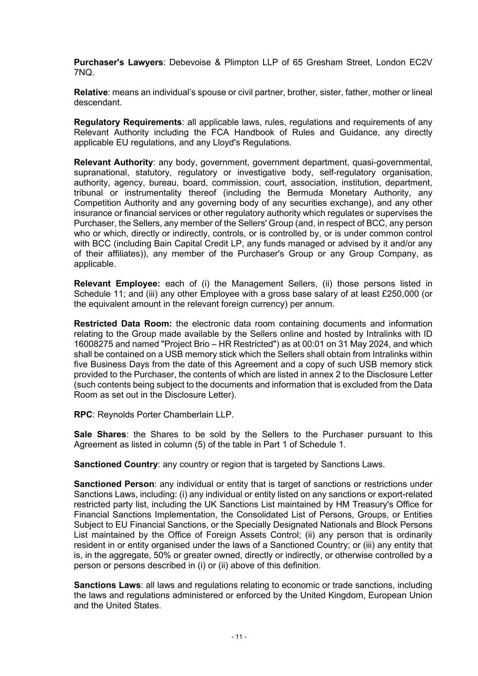 - 11 - Purchaser's Lawyers: Debevoise & Plimpton LLP of 65 Gresham Street, London EC2V 7NQ. Relative: means an individual’s spouse or civil partner, brother, sister, father, mother or lineal descendant. Regulatory Requirements: all applicable laws, rules, regulations and requirements of any Relevant Authority including the FCA Handbook of Rules and Guidance, any directly applicable EU regulations, and any Lloyd's Regulations. Relevant Authority: any body, government, government department, quasi-governmental, supranational, statutory, regulatory or investigative body, self-regulatory organisation, authority, agency, bureau, board, commission, court, association, institution, department, tribunal or instrumentality thereof (including the Bermuda Monetary Authority, any Competition Authority and any governing body of any securities exchange), and any other insurance or financial services or other regulatory authority which regulates or supervises the Purchaser, the Sellers, any member of the Sellers' Group (and, in respect of BCC, any person who or which, directly or indirectly, controls, or is controlled by, or is under common control with BCC (including Bain Capital Credit LP, any funds managed or advised by it and/or any of their affiliates)), any member of the Purchaser's Group or any Group Company, as applicable. Relevant Employee: each of (i) the Management Sellers, (ii) those persons listed in Schedule 11; and (iii) any other Employee with a gross base salary of at least £250,000 (or the equivalent amount in the relevant foreign currency) per annum. Restricted Data Room: the electronic data room containing documents and information relating to the Group made available by the Sellers online and hosted by Intralinks with ID 16008275 and named "Project Brio – HR Restricted") as at 00:01 on 31 May 2024, and which shall be contained on a USB memory stick which the Sellers shall obtain from Intralinks within five Business Days from the date of this Agreement and a copy of such USB memory stick provided to the Purchaser, the contents of which are listed in annex 2 to the Disclosure Letter (such contents being subject to the documents and information that is excluded from the Data Room as set out in the Disclosure Letter). RPC: Reynolds Porter Chamberlain LLP. Sale Shares: the Shares to be sold by the Sellers to the Purchaser pursuant to this Agreement as listed in column (5) of the table in Part 1 of Schedule 1. Sanctioned Country: any country or region that is targeted by Sanctions Laws. Sanctioned Person: any individual or entity that is target of sanctions or restrictions under Sanctions Laws, including: (i) any individual or entity listed on any sanctions or export-related restricted party list, including the UK Sanctions List maintained by HM Treasury's Office for Financial Sanctions Implementation, the Consolidated List of Persons, Groups, or Entities Subject to EU Financial Sanctions, or the Specially Designated Nationals and Block Persons List maintained by the Office of Foreign Assets Control; (ii) any person that is ordinarily resident in or entity organised under the laws of a Sanctioned Country; or (iii) any entity that is, in the aggregate, 50% or greater owned, directly or indirectly, or otherwise controlled by a person or persons described in (i) or (ii) above of this definition. Sanctions Laws: all laws and regulations relating to economic or trade sanctions, including the laws and regulations administered or enforced by the United Kingdom, European Union and the United States.