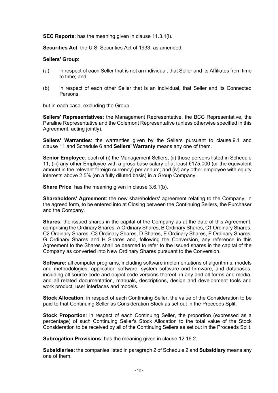 - 12 - SEC Reports: has the meaning given in clause 11.3.1(l). Securities Act: the U.S. Securities Act of 1933, as amended. Sellers' Group: (a) in respect of each Seller that is not an individual, that Seller and its Affiliates from time to time; and (b) in respect of each other Seller that is an individual, that Seller and its Connected Persons, but in each case, excluding the Group. Sellers' Representatives: the Management Representative, the BCC Representative, the Paraline Representative and the Colemont Representative (unless otherwise specified in this Agreement, acting jointly). Sellers' Warranties: the warranties given by the Sellers pursuant to clause 9.1 and clause 11 and Schedule 6 and Sellers' Warranty means any one of them. Senior Employee: each of (i) the Management Sellers, (ii) those persons listed in Schedule 11; (iii) any other Employee with a gross base salary of at least £175,000 (or the equivalent amount in the relevant foreign currency) per annum; and (iv) any other employee with equity interests above 2.5% (on a fully diluted basis) in a Group Company. Share Price: has the meaning given in clause 3.6.1(b). Shareholders' Agreement: the new shareholders' agreement relating to the Company, in the agreed form, to be entered into at Closing between the Continuing Sellers, the Purchaser and the Company. Shares: the issued shares in the capital of the Company as at the date of this Agreement, comprising the Ordinary Shares, A Ordinary Shares, B Ordinary Shares, C1 Ordinary Shares, C2 Ordinary Shares, C3 Ordinary Shares, D Shares, E Ordinary Shares, F Ordinary Shares, G Ordinary Shares and H Shares and, following the Conversion, any reference in this Agreement to the Shares shall be deemed to refer to the issued shares in the capital of the Company as converted into New Ordinary Shares pursuant to the Conversion. Software: all computer programs, including software implementations of algorithms, models and methodologies, application software, system software and firmware, and databases, including all source code and object code versions thereof, in any and all forms and media, and all related documentation, manuals, descriptions, design and development tools and work product, user interfaces and models. Stock Allocation: in respect of each Continuing Seller, the value of the Consideration to be paid to that Continuing Seller as Consideration Stock as set out in the Proceeds Split. Stock Proportion: in respect of each Continuing Seller, the proportion (expressed as a percentage) of such Continuing Seller's Stock Allocation to the total value of the Stock Consideration to be received by all of the Continuing Sellers as set out in the Proceeds Split. Subrogation Provisions: has the meaning given in clause 12.16.2. Subsidiaries: the companies listed in paragraph 2 of Schedule 2 and Subsidiary means any one of them.