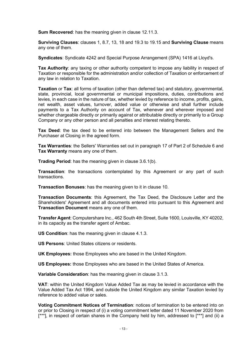 - 13 - Sum Recovered: has the meaning given in clause 12.11.3. Surviving Clauses: clauses 1, 8.7, 13, 18 and 19.3 to 19.15 and Surviving Clause means any one of them. Syndicates: Syndicate 4242 and Special Purpose Arrangement (SPA) 1416 at Lloyd's. Tax Authority: any taxing or other authority competent to impose any liability in respect of Taxation or responsible for the administration and/or collection of Taxation or enforcement of any law in relation to Taxation. Taxation or Tax: all forms of taxation (other than deferred tax) and statutory, governmental, state, provincial, local governmental or municipal impositions, duties, contributions and levies, in each case in the nature of tax, whether levied by reference to income, profits, gains, net wealth, asset values, turnover, added value or otherwise and shall further include payments to a Tax Authority on account of Tax, whenever and wherever imposed and whether chargeable directly or primarily against or attributable directly or primarily to a Group Company or any other person and all penalties and interest relating thereto. Tax Deed: the tax deed to be entered into between the Management Sellers and the Purchaser at Closing in the agreed form. Tax Warranties: the Sellers' Warranties set out in paragraph 17 of Part 2 of Schedule 6 and Tax Warranty means any one of them. Trading Period: has the meaning given in clause 3.6.1(b). Transaction: the transactions contemplated by this Agreement or any part of such transactions. Transaction Bonuses: has the meaning given to it in clause 10. Transaction Documents: this Agreement, the Tax Deed, the Disclosure Letter and the Shareholders' Agreement and all documents entered into pursuant to this Agreement and Transaction Document means any one of them. Transfer Agent: Computershare Inc., 462 South 4th Street, Suite 1600, Louisville, KY 40202, in its capacity as the transfer agent of Ambac. US Condition: has the meaning given in clause 4.1.3. US Persons: United States citizens or residents. UK Employees: those Employees who are based in the United Kingdom. US Employees: those Employees who are based in the United States of America. Variable Consideration: has the meaning given in clause 3.1.3. VAT: within the United Kingdom Value Added Tax as may be levied in accordance with the Value Added Tax Act 1994, and outside the United Kingdom any similar Taxation levied by reference to added value or sales. Voting Commitment Notices of Termination: notices of termination to be entered into on or prior to Closing in respect of (i) a voting commitment letter dated 11 November 2020 from [***], in respect of certain shares in the Company held by him, addressed to [***] and (ii) a