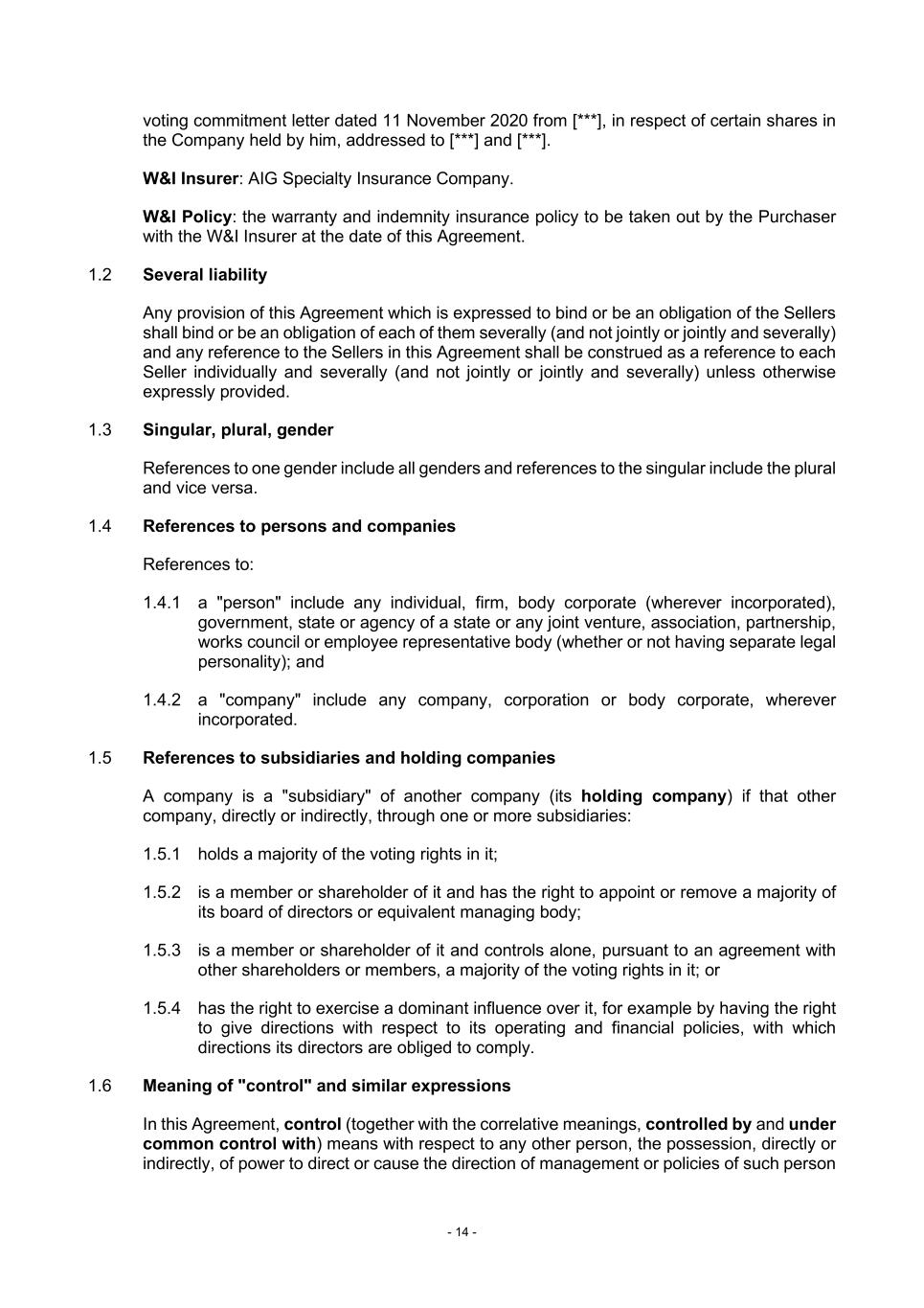 - 14 - voting commitment letter dated 11 November 2020 from [***], in respect of certain shares in the Company held by him, addressed to [***] and [***]. W&I Insurer: AIG Specialty Insurance Company. W&I Policy: the warranty and indemnity insurance policy to be taken out by the Purchaser with the W&I Insurer at the date of this Agreement. 1.2 Several liability Any provision of this Agreement which is expressed to bind or be an obligation of the Sellers shall bind or be an obligation of each of them severally (and not jointly or jointly and severally) and any reference to the Sellers in this Agreement shall be construed as a reference to each Seller individually and severally (and not jointly or jointly and severally) unless otherwise expressly provided. 1.3 Singular, plural, gender References to one gender include all genders and references to the singular include the plural and vice versa. 1.4 References to persons and companies References to: 1.4.1 a "person" include any individual, firm, body corporate (wherever incorporated), government, state or agency of a state or any joint venture, association, partnership, works council or employee representative body (whether or not having separate legal personality); and 1.4.2 a "company" include any company, corporation or body corporate, wherever incorporated. 1.5 References to subsidiaries and holding companies A company is a "subsidiary" of another company (its holding company) if that other company, directly or indirectly, through one or more subsidiaries: 1.5.1 holds a majority of the voting rights in it; 1.5.2 is a member or shareholder of it and has the right to appoint or remove a majority of its board of directors or equivalent managing body; 1.5.3 is a member or shareholder of it and controls alone, pursuant to an agreement with other shareholders or members, a majority of the voting rights in it; or 1.5.4 has the right to exercise a dominant influence over it, for example by having the right to give directions with respect to its operating and financial policies, with which directions its directors are obliged to comply. 1.6 Meaning of "control" and similar expressions In this Agreement, control (together with the correlative meanings, controlled by and under common control with) means with respect to any other person, the possession, directly or indirectly, of power to direct or cause the direction of management or policies of such person