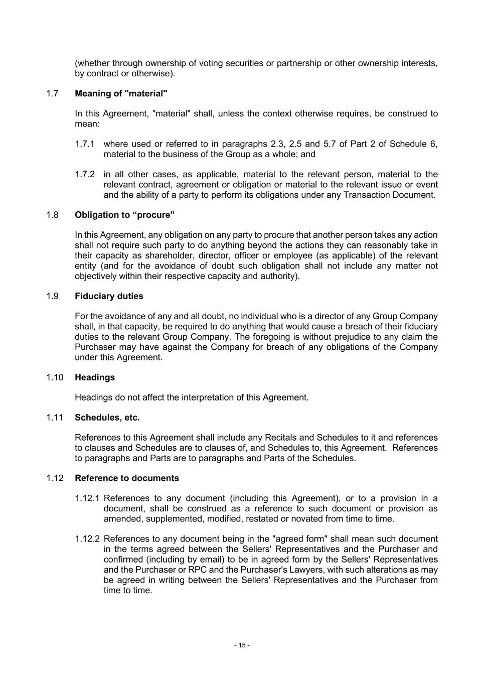 - 15 - (whether through ownership of voting securities or partnership or other ownership interests, by contract or otherwise). 1.7 Meaning of "material" In this Agreement, "material" shall, unless the context otherwise requires, be construed to mean: 1.7.1 where used or referred to in paragraphs 2.3, 2.5 and 5.7 of Part 2 of Schedule 6, material to the business of the Group as a whole; and 1.7.2 in all other cases, as applicable, material to the relevant person, material to the relevant contract, agreement or obligation or material to the relevant issue or event and the ability of a party to perform its obligations under any Transaction Document. 1.8 Obligation to “procure” In this Agreement, any obligation on any party to procure that another person takes any action shall not require such party to do anything beyond the actions they can reasonably take in their capacity as shareholder, director, officer or employee (as applicable) of the relevant entity (and for the avoidance of doubt such obligation shall not include any matter not objectively within their respective capacity and authority). 1.9 Fiduciary duties For the avoidance of any and all doubt, no individual who is a director of any Group Company shall, in that capacity, be required to do anything that would cause a breach of their fiduciary duties to the relevant Group Company. The foregoing is without prejudice to any claim the Purchaser may have against the Company for breach of any obligations of the Company under this Agreement. 1.10 Headings Headings do not affect the interpretation of this Agreement. 1.11 Schedules, etc. References to this Agreement shall include any Recitals and Schedules to it and references to clauses and Schedules are to clauses of, and Schedules to, this Agreement. References to paragraphs and Parts are to paragraphs and Parts of the Schedules. 1.12 Reference to documents 1.12.1 References to any document (including this Agreement), or to a provision in a document, shall be construed as a reference to such document or provision as amended, supplemented, modified, restated or novated from time to time. 1.12.2 References to any document being in the "agreed form" shall mean such document in the terms agreed between the Sellers' Representatives and the Purchaser and confirmed (including by email) to be in agreed form by the Sellers' Representatives and the Purchaser or RPC and the Purchaser's Lawyers, with such alterations as may be agreed in writing between the Sellers' Representatives and the Purchaser from time to time.