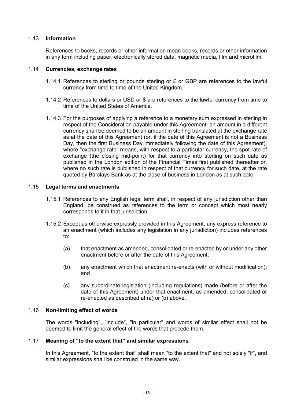 - 16 - 1.13 Information References to books, records or other information mean books, records or other information in any form including paper, electronically stored data, magnetic media, film and microfilm. 1.14 Currencies, exchange rates 1.14.1 References to sterling or pounds sterling or £ or GBP are references to the lawful currency from time to time of the United Kingdom. 1.14.2 References to dollars or USD or $ are references to the lawful currency from time to time of the United States of America. 1.14.3 For the purposes of applying a reference to a monetary sum expressed in sterling in respect of the Consideration payable under this Agreement, an amount in a different currency shall be deemed to be an amount in sterling translated at the exchange rate as at the date of this Agreement (or, if the date of this Agreement is not a Business Day, then the first Business Day immediately following the date of this Agreement), where "exchange rate" means, with respect to a particular currency, the spot rate of exchange (the closing mid-point) for that currency into sterling on such date as published in the London edition of the Financial Times first published thereafter or, where no such rate is published in respect of that currency for such date, at the rate quoted by Barclays Bank as at the close of business in London as at such date. 1.15 Legal terms and enactments 1.15.1 References to any English legal term shall, in respect of any jurisdiction other than England, be construed as references to the term or concept which most nearly corresponds to it in that jurisdiction. 1.15.2 Except as otherwise expressly provided in this Agreement, any express reference to an enactment (which includes any legislation in any jurisdiction) includes references to: (a) that enactment as amended, consolidated or re-enacted by or under any other enactment before or after the date of this Agreement; (b) any enactment which that enactment re-enacts (with or without modification); and (c) any subordinate legislation (including regulations) made (before or after the date of this Agreement) under that enactment, as amended, consolidated or re-enacted as described at (a) or (b) above. 1.16 Non-limiting effect of words The words "including", "include", "in particular" and words of similar effect shall not be deemed to limit the general effect of the words that precede them. 1.17 Meaning of "to the extent that" and similar expressions In this Agreement, "to the extent that" shall mean "to the extent that" and not solely "if", and similar expressions shall be construed in the same way.