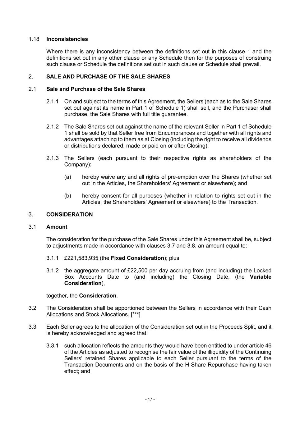 - 17 - 1.18 Inconsistencies Where there is any inconsistency between the definitions set out in this clause 1 and the definitions set out in any other clause or any Schedule then for the purposes of construing such clause or Schedule the definitions set out in such clause or Schedule shall prevail. 2. SALE AND PURCHASE OF THE SALE SHARES 2.1 Sale and Purchase of the Sale Shares 2.1.1 On and subject to the terms of this Agreement, the Sellers (each as to the Sale Shares set out against its name in Part 1 of Schedule 1) shall sell, and the Purchaser shall purchase, the Sale Shares with full title guarantee. 2.1.2 The Sale Shares set out against the name of the relevant Seller in Part 1 of Schedule 1 shall be sold by that Seller free from Encumbrances and together with all rights and advantages attaching to them as at Closing (including the right to receive all dividends or distributions declared, made or paid on or after Closing). 2.1.3 The Sellers (each pursuant to their respective rights as shareholders of the Company): (a) hereby waive any and all rights of pre-emption over the Shares (whether set out in the Articles, the Shareholders' Agreement or elsewhere); and (b) hereby consent for all purposes (whether in relation to rights set out in the Articles, the Shareholders' Agreement or elsewhere) to the Transaction. 3. CONSIDERATION 3.1 Amount The consideration for the purchase of the Sale Shares under this Agreement shall be, subject to adjustments made in accordance with clauses 3.7 and 3.8, an amount equal to: 3.1.1 £221,583,935 (the Fixed Consideration); plus 3.1.2 the aggregate amount of £22,500 per day accruing from (and including) the Locked Box Accounts Date to (and including) the Closing Date, (the Variable Consideration), together, the Consideration. 3.2 The Consideration shall be apportioned between the Sellers in accordance with their Cash Allocations and Stock Allocations. [***] 3.3 Each Seller agrees to the allocation of the Consideration set out in the Proceeds Split, and it is hereby acknowledged and agreed that: 3.3.1 such allocation reflects the amounts they would have been entitled to under article 46 of the Articles as adjusted to recognise the fair value of the illiquidity of the Continuing Sellers’ retained Shares applicable to each Seller pursuant to the terms of the Transaction Documents and on the basis of the H Share Repurchase having taken effect; and
