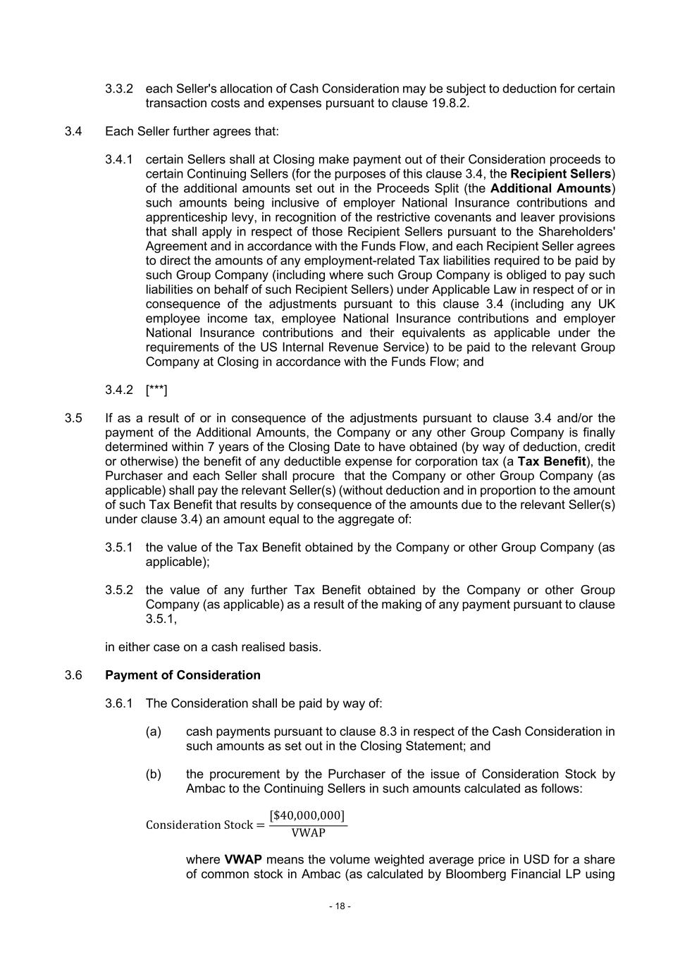 - 18 - 3.3.2 each Seller's allocation of Cash Consideration may be subject to deduction for certain transaction costs and expenses pursuant to clause 19.8.2. 3.4 Each Seller further agrees that: 3.4.1 certain Sellers shall at Closing make payment out of their Consideration proceeds to certain Continuing Sellers (for the purposes of this clause 3.4, the Recipient Sellers) of the additional amounts set out in the Proceeds Split (the Additional Amounts) such amounts being inclusive of employer National Insurance contributions and apprenticeship levy, in recognition of the restrictive covenants and leaver provisions that shall apply in respect of those Recipient Sellers pursuant to the Shareholders' Agreement and in accordance with the Funds Flow, and each Recipient Seller agrees to direct the amounts of any employment-related Tax liabilities required to be paid by such Group Company (including where such Group Company is obliged to pay such liabilities on behalf of such Recipient Sellers) under Applicable Law in respect of or in consequence of the adjustments pursuant to this clause 3.4 (including any UK employee income tax, employee National Insurance contributions and employer National Insurance contributions and their equivalents as applicable under the requirements of the US Internal Revenue Service) to be paid to the relevant Group Company at Closing in accordance with the Funds Flow; and 3.4.2 [***] 3.5 If as a result of or in consequence of the adjustments pursuant to clause 3.4 and/or the payment of the Additional Amounts, the Company or any other Group Company is finally determined within 7 years of the Closing Date to have obtained (by way of deduction, credit or otherwise) the benefit of any deductible expense for corporation tax (a Tax Benefit), the Purchaser and each Seller shall procure that the Company or other Group Company (as applicable) shall pay the relevant Seller(s) (without deduction and in proportion to the amount of such Tax Benefit that results by consequence of the amounts due to the relevant Seller(s) under clause 3.4) an amount equal to the aggregate of: 3.5.1 the value of the Tax Benefit obtained by the Company or other Group Company (as applicable); 3.5.2 the value of any further Tax Benefit obtained by the Company or other Group Company (as applicable) as a result of the making of any payment pursuant to clause 3.5.1, in either case on a cash realised basis. 3.6 Payment of Consideration 3.6.1 The Consideration shall be paid by way of: (a) cash payments pursuant to clause 8.3 in respect of the Cash Consideration in such amounts as set out in the Closing Statement; and (b) the procurement by the Purchaser of the issue of Consideration Stock by Ambac to the Continuing Sellers in such amounts calculated as follows: where VWAP means the volume weighted average price in USD for a share of common stock in Ambac (as calculated by Bloomberg Financial LP using Consideration Stock = [$40,000,000] VWAP