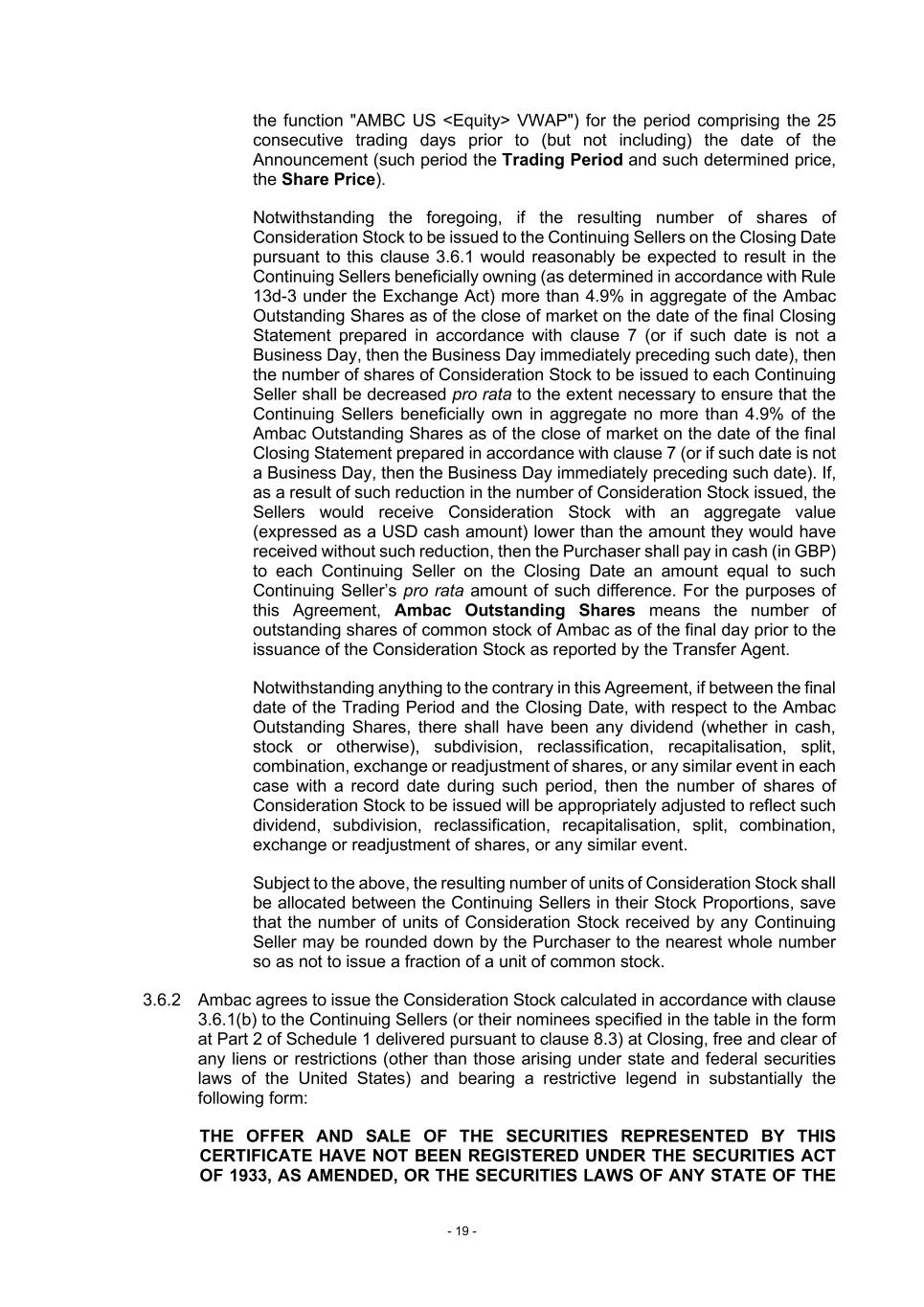 - 19 - the function "AMBC US <Equity> VWAP") for the period comprising the 25 consecutive trading days prior to (but not including) the date of the Announcement (such period the Trading Period and such determined price, the Share Price). Notwithstanding the foregoing, if the resulting number of shares of Consideration Stock to be issued to the Continuing Sellers on the Closing Date pursuant to this clause 3.6.1 would reasonably be expected to result in the Continuing Sellers beneficially owning (as determined in accordance with Rule 13d-3 under the Exchange Act) more than 4.9% in aggregate of the Ambac Outstanding Shares as of the close of market on the date of the final Closing Statement prepared in accordance with clause 7 (or if such date is not a Business Day, then the Business Day immediately preceding such date), then the number of shares of Consideration Stock to be issued to each Continuing Seller shall be decreased pro rata to the extent necessary to ensure that the Continuing Sellers beneficially own in aggregate no more than 4.9% of the Ambac Outstanding Shares as of the close of market on the date of the final Closing Statement prepared in accordance with clause 7 (or if such date is not a Business Day, then the Business Day immediately preceding such date). If, as a result of such reduction in the number of Consideration Stock issued, the Sellers would receive Consideration Stock with an aggregate value (expressed as a USD cash amount) lower than the amount they would have received without such reduction, then the Purchaser shall pay in cash (in GBP) to each Continuing Seller on the Closing Date an amount equal to such Continuing Seller’s pro rata amount of such difference. For the purposes of this Agreement, Ambac Outstanding Shares means the number of outstanding shares of common stock of Ambac as of the final day prior to the issuance of the Consideration Stock as reported by the Transfer Agent. Notwithstanding anything to the contrary in this Agreement, if between the final date of the Trading Period and the Closing Date, with respect to the Ambac Outstanding Shares, there shall have been any dividend (whether in cash, stock or otherwise), subdivision, reclassification, recapitalisation, split, combination, exchange or readjustment of shares, or any similar event in each case with a record date during such period, then the number of shares of Consideration Stock to be issued will be appropriately adjusted to reflect such dividend, subdivision, reclassification, recapitalisation, split, combination, exchange or readjustment of shares, or any similar event. Subject to the above, the resulting number of units of Consideration Stock shall be allocated between the Continuing Sellers in their Stock Proportions, save that the number of units of Consideration Stock received by any Continuing Seller may be rounded down by the Purchaser to the nearest whole number so as not to issue a fraction of a unit of common stock. 3.6.2 Ambac agrees to issue the Consideration Stock calculated in accordance with clause 3.6.1(b) to the Continuing Sellers (or their nominees specified in the table in the form at Part 2 of Schedule 1 delivered pursuant to clause 8.3) at Closing, free and clear of any liens or restrictions (other than those arising under state and federal securities laws of the United States) and bearing a restrictive legend in substantially the following form: THE OFFER AND SALE OF THE SECURITIES REPRESENTED BY THIS CERTIFICATE HAVE NOT BEEN REGISTERED UNDER THE SECURITIES ACT OF 1933, AS AMENDED, OR THE SECURITIES LAWS OF ANY STATE OF THE