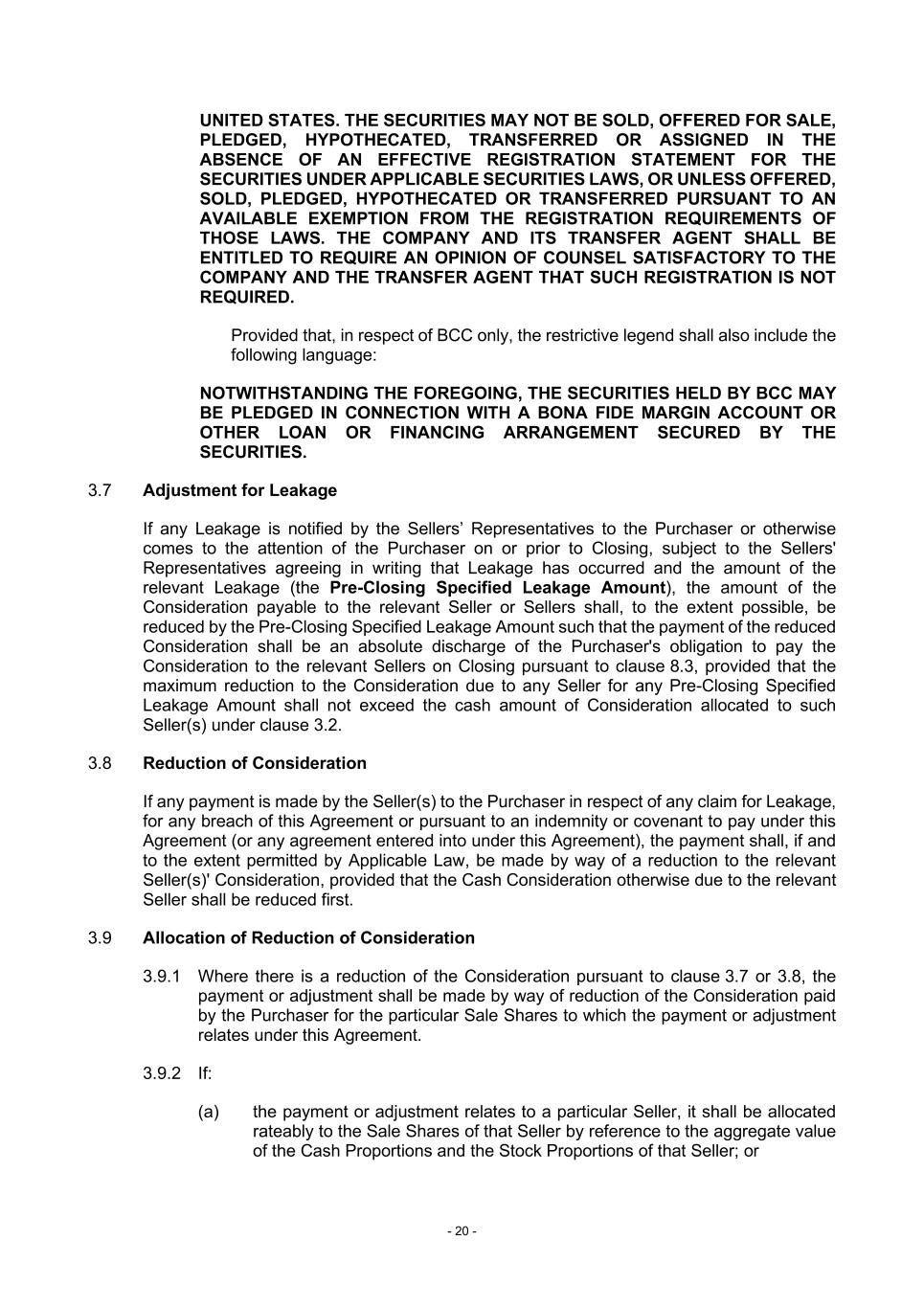 - 20 - UNITED STATES. THE SECURITIES MAY NOT BE SOLD, OFFERED FOR SALE, PLEDGED, HYPOTHECATED, TRANSFERRED OR ASSIGNED IN THE ABSENCE OF AN EFFECTIVE REGISTRATION STATEMENT FOR THE SECURITIES UNDER APPLICABLE SECURITIES LAWS, OR UNLESS OFFERED, SOLD, PLEDGED, HYPOTHECATED OR TRANSFERRED PURSUANT TO AN AVAILABLE EXEMPTION FROM THE REGISTRATION REQUIREMENTS OF THOSE LAWS. THE COMPANY AND ITS TRANSFER AGENT SHALL BE ENTITLED TO REQUIRE AN OPINION OF COUNSEL SATISFACTORY TO THE COMPANY AND THE TRANSFER AGENT THAT SUCH REGISTRATION IS NOT REQUIRED. Provided that, in respect of BCC only, the restrictive legend shall also include the following language: NOTWITHSTANDING THE FOREGOING, THE SECURITIES HELD BY BCC MAY BE PLEDGED IN CONNECTION WITH A BONA FIDE MARGIN ACCOUNT OR OTHER LOAN OR FINANCING ARRANGEMENT SECURED BY THE SECURITIES. 3.7 Adjustment for Leakage If any Leakage is notified by the Sellers’ Representatives to the Purchaser or otherwise comes to the attention of the Purchaser on or prior to Closing, subject to the Sellers' Representatives agreeing in writing that Leakage has occurred and the amount of the relevant Leakage (the Pre-Closing Specified Leakage Amount), the amount of the Consideration payable to the relevant Seller or Sellers shall, to the extent possible, be reduced by the Pre-Closing Specified Leakage Amount such that the payment of the reduced Consideration shall be an absolute discharge of the Purchaser's obligation to pay the Consideration to the relevant Sellers on Closing pursuant to clause 8.3, provided that the maximum reduction to the Consideration due to any Seller for any Pre-Closing Specified Leakage Amount shall not exceed the cash amount of Consideration allocated to such Seller(s) under clause 3.2. 3.8 Reduction of Consideration If any payment is made by the Seller(s) to the Purchaser in respect of any claim for Leakage, for any breach of this Agreement or pursuant to an indemnity or covenant to pay under this Agreement (or any agreement entered into under this Agreement), the payment shall, if and to the extent permitted by Applicable Law, be made by way of a reduction to the relevant Seller(s)' Consideration, provided that the Cash Consideration otherwise due to the relevant Seller shall be reduced first. 3.9 Allocation of Reduction of Consideration 3.9.1 Where there is a reduction of the Consideration pursuant to clause 3.7 or 3.8, the payment or adjustment shall be made by way of reduction of the Consideration paid by the Purchaser for the particular Sale Shares to which the payment or adjustment relates under this Agreement. 3.9.2 If: (a) the payment or adjustment relates to a particular Seller, it shall be allocated rateably to the Sale Shares of that Seller by reference to the aggregate value of the Cash Proportions and the Stock Proportions of that Seller; or