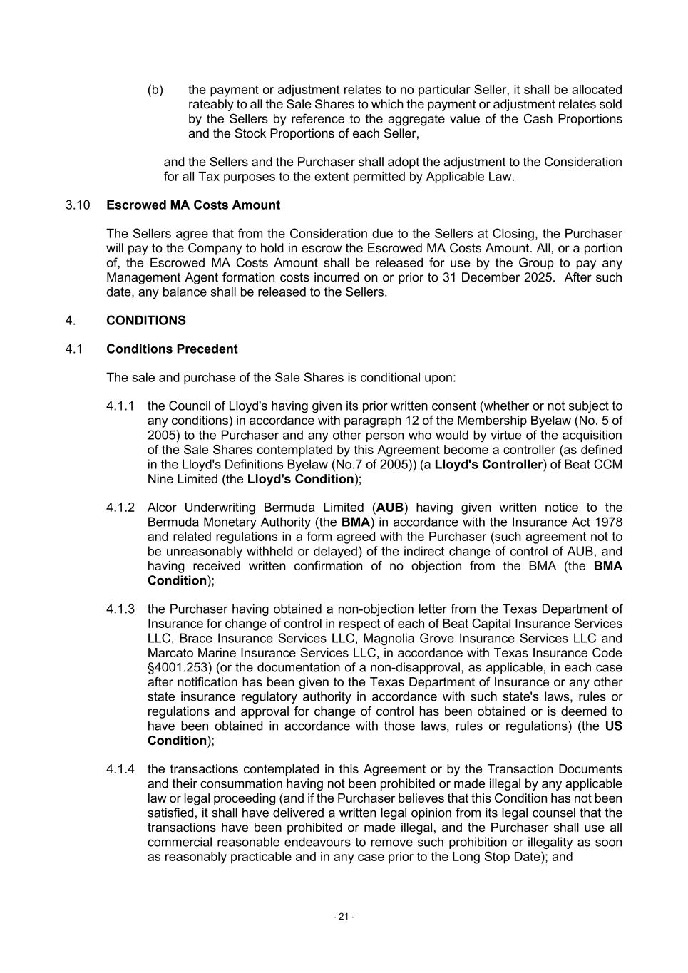 - 21 - (b) the payment or adjustment relates to no particular Seller, it shall be allocated rateably to all the Sale Shares to which the payment or adjustment relates sold by the Sellers by reference to the aggregate value of the Cash Proportions and the Stock Proportions of each Seller, and the Sellers and the Purchaser shall adopt the adjustment to the Consideration for all Tax purposes to the extent permitted by Applicable Law. 3.10 Escrowed MA Costs Amount The Sellers agree that from the Consideration due to the Sellers at Closing, the Purchaser will pay to the Company to hold in escrow the Escrowed MA Costs Amount. All, or a portion of, the Escrowed MA Costs Amount shall be released for use by the Group to pay any Management Agent formation costs incurred on or prior to 31 December 2025. After such date, any balance shall be released to the Sellers. 4. CONDITIONS 4.1 Conditions Precedent The sale and purchase of the Sale Shares is conditional upon: 4.1.1 the Council of Lloyd's having given its prior written consent (whether or not subject to any conditions) in accordance with paragraph 12 of the Membership Byelaw (No. 5 of 2005) to the Purchaser and any other person who would by virtue of the acquisition of the Sale Shares contemplated by this Agreement become a controller (as defined in the Lloyd's Definitions Byelaw (No.7 of 2005)) (a Lloyd's Controller) of Beat CCM Nine Limited (the Lloyd's Condition); 4.1.2 Alcor Underwriting Bermuda Limited (AUB) having given written notice to the Bermuda Monetary Authority (the BMA) in accordance with the Insurance Act 1978 and related regulations in a form agreed with the Purchaser (such agreement not to be unreasonably withheld or delayed) of the indirect change of control of AUB, and having received written confirmation of no objection from the BMA (the BMA Condition); 4.1.3 the Purchaser having obtained a non-objection letter from the Texas Department of Insurance for change of control in respect of each of Beat Capital Insurance Services LLC, Brace Insurance Services LLC, Magnolia Grove Insurance Services LLC and Marcato Marine Insurance Services LLC, in accordance with Texas Insurance Code §4001.253) (or the documentation of a non-disapproval, as applicable, in each case after notification has been given to the Texas Department of Insurance or any other state insurance regulatory authority in accordance with such state's laws, rules or regulations and approval for change of control has been obtained or is deemed to have been obtained in accordance with those laws, rules or regulations) (the US Condition); 4.1.4 the transactions contemplated in this Agreement or by the Transaction Documents and their consummation having not been prohibited or made illegal by any applicable law or legal proceeding (and if the Purchaser believes that this Condition has not been satisfied, it shall have delivered a written legal opinion from its legal counsel that the transactions have been prohibited or made illegal, and the Purchaser shall use all commercial reasonable endeavours to remove such prohibition or illegality as soon as reasonably practicable and in any case prior to the Long Stop Date); and