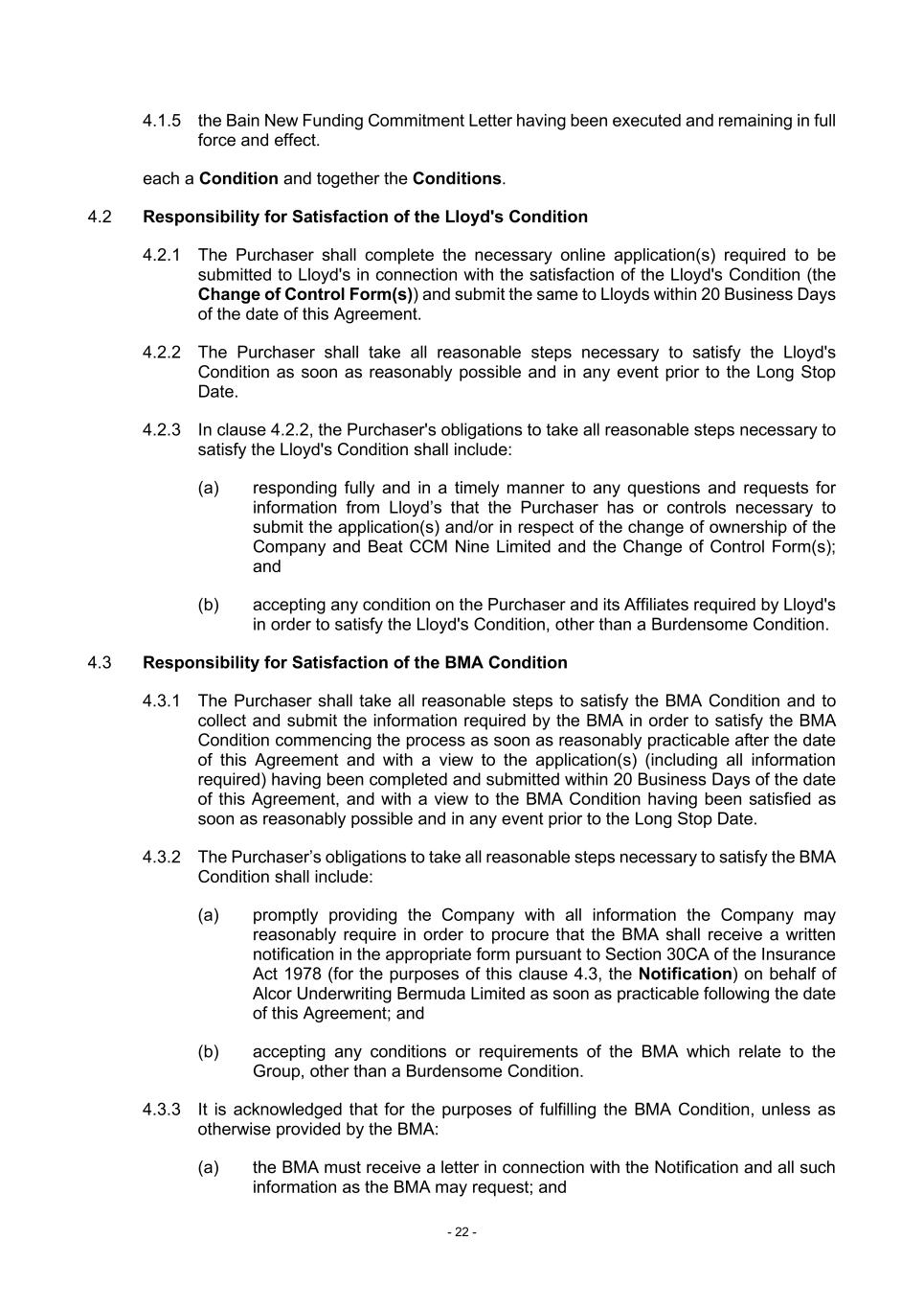 - 22 - 4.1.5 the Bain New Funding Commitment Letter having been executed and remaining in full force and effect. each a Condition and together the Conditions. 4.2 Responsibility for Satisfaction of the Lloyd's Condition 4.2.1 The Purchaser shall complete the necessary online application(s) required to be submitted to Lloyd's in connection with the satisfaction of the Lloyd's Condition (the Change of Control Form(s)) and submit the same to Lloyds within 20 Business Days of the date of this Agreement. 4.2.2 The Purchaser shall take all reasonable steps necessary to satisfy the Lloyd's Condition as soon as reasonably possible and in any event prior to the Long Stop Date. 4.2.3 In clause 4.2.2, the Purchaser's obligations to take all reasonable steps necessary to satisfy the Lloyd's Condition shall include: (a) responding fully and in a timely manner to any questions and requests for information from Lloyd’s that the Purchaser has or controls necessary to submit the application(s) and/or in respect of the change of ownership of the Company and Beat CCM Nine Limited and the Change of Control Form(s); and (b) accepting any condition on the Purchaser and its Affiliates required by Lloyd's in order to satisfy the Lloyd's Condition, other than a Burdensome Condition. 4.3 Responsibility for Satisfaction of the BMA Condition 4.3.1 The Purchaser shall take all reasonable steps to satisfy the BMA Condition and to collect and submit the information required by the BMA in order to satisfy the BMA Condition commencing the process as soon as reasonably practicable after the date of this Agreement and with a view to the application(s) (including all information required) having been completed and submitted within 20 Business Days of the date of this Agreement, and with a view to the BMA Condition having been satisfied as soon as reasonably possible and in any event prior to the Long Stop Date. 4.3.2 The Purchaser’s obligations to take all reasonable steps necessary to satisfy the BMA Condition shall include: (a) promptly providing the Company with all information the Company may reasonably require in order to procure that the BMA shall receive a written notification in the appropriate form pursuant to Section 30CA of the Insurance Act 1978 (for the purposes of this clause 4.3, the Notification) on behalf of Alcor Underwriting Bermuda Limited as soon as practicable following the date of this Agreement; and (b) accepting any conditions or requirements of the BMA which relate to the Group, other than a Burdensome Condition. 4.3.3 It is acknowledged that for the purposes of fulfilling the BMA Condition, unless as otherwise provided by the BMA: (a) the BMA must receive a letter in connection with the Notification and all such information as the BMA may request; and