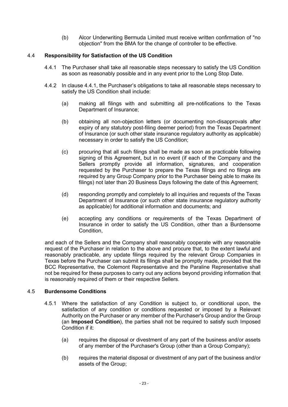 - 23 - (b) Alcor Underwriting Bermuda Limited must receive written confirmation of "no objection" from the BMA for the change of controller to be effective. 4.4 Responsibility for Satisfaction of the US Condition 4.4.1 The Purchaser shall take all reasonable steps necessary to satisfy the US Condition as soon as reasonably possible and in any event prior to the Long Stop Date. 4.4.2 In clause 4.4.1, the Purchaser’s obligations to take all reasonable steps necessary to satisfy the US Condition shall include: (a) making all filings with and submitting all pre-notifications to the Texas Department of Insurance; (b) obtaining all non-objection letters (or documenting non-disapprovals after expiry of any statutory post-filing deemer period) from the Texas Department of Insurance (or such other state insurance regulatory authority as applicable) necessary in order to satisfy the US Condition; (c) procuring that all such filings shall be made as soon as practicable following signing of this Agreement, but in no event (if each of the Company and the Sellers promptly provide all information, signatures, and cooperation requested by the Purchaser to prepare the Texas filings and no filings are required by any Group Company prior to the Purchaser being able to make its filings) not later than 20 Business Days following the date of this Agreement; (d) responding promptly and completely to all inquiries and requests of the Texas Department of Insurance (or such other state insurance regulatory authority as applicable) for additional information and documents; and (e) accepting any conditions or requirements of the Texas Department of Insurance in order to satisfy the US Condition, other than a Burdensome Condition, and each of the Sellers and the Company shall reasonably cooperate with any reasonable request of the Purchaser in relation to the above and procure that, to the extent lawful and reasonably practicable, any update filings required by the relevant Group Companies in Texas before the Purchaser can submit its filings shall be promptly made, provided that the BCC Representative, the Colemont Representative and the Paraline Representative shall not be required for these purposes to carry out any actions beyond providing information that is reasonably required of them or their respective Sellers. 4.5 Burdensome Conditions 4.5.1 Where the satisfaction of any Condition is subject to, or conditional upon, the satisfaction of any condition or conditions requested or imposed by a Relevant Authority on the Purchaser or any member of the Purchaser's Group and/or the Group (an Imposed Condition), the parties shall not be required to satisfy such Imposed Condition if it: (a) requires the disposal or divestment of any part of the business and/or assets of any member of the Purchaser's Group (other than a Group Company); (b) requires the material disposal or divestment of any part of the business and/or assets of the Group;