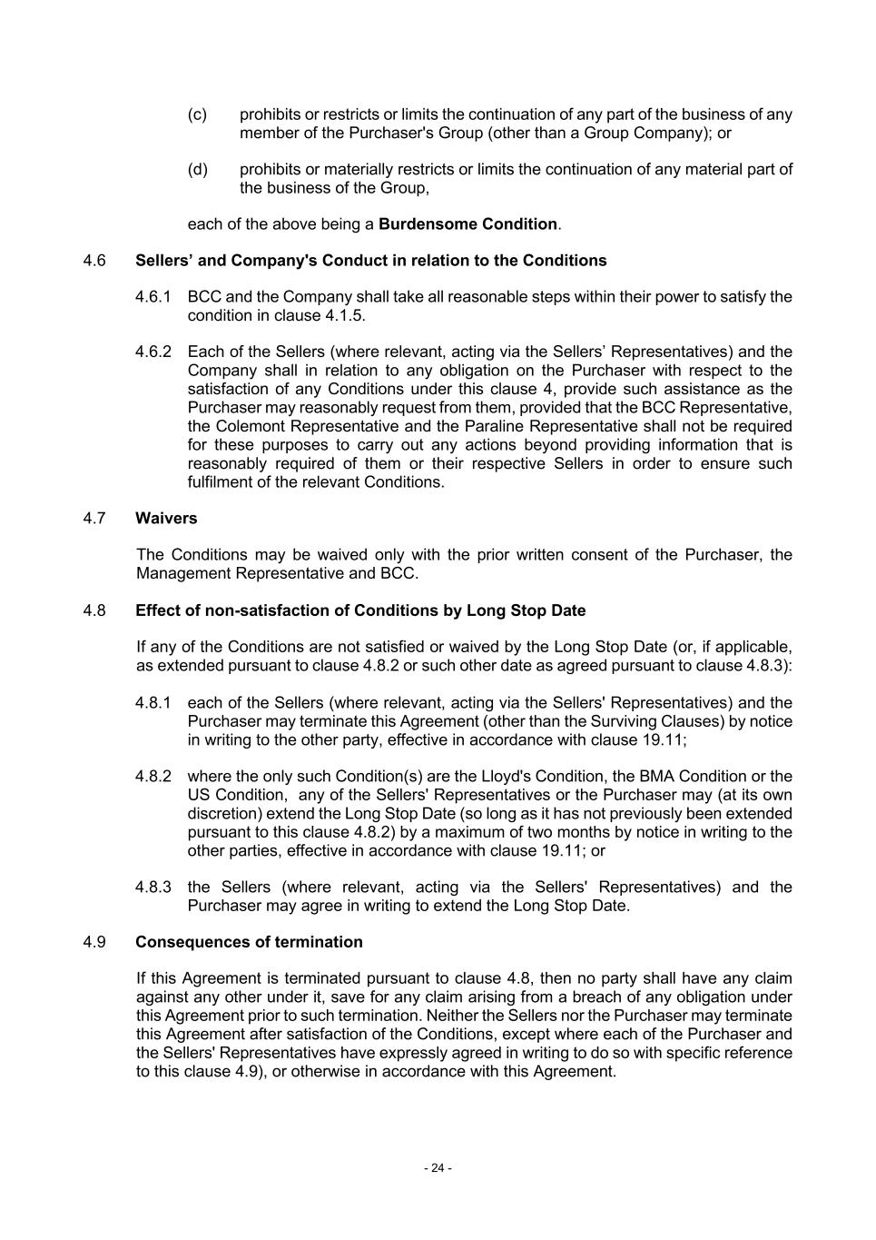 - 24 - (c) prohibits or restricts or limits the continuation of any part of the business of any member of the Purchaser's Group (other than a Group Company); or (d) prohibits or materially restricts or limits the continuation of any material part of the business of the Group, each of the above being a Burdensome Condition. 4.6 Sellers’ and Company's Conduct in relation to the Conditions 4.6.1 BCC and the Company shall take all reasonable steps within their power to satisfy the condition in clause 4.1.5. 4.6.2 Each of the Sellers (where relevant, acting via the Sellers’ Representatives) and the Company shall in relation to any obligation on the Purchaser with respect to the satisfaction of any Conditions under this clause 4, provide such assistance as the Purchaser may reasonably request from them, provided that the BCC Representative, the Colemont Representative and the Paraline Representative shall not be required for these purposes to carry out any actions beyond providing information that is reasonably required of them or their respective Sellers in order to ensure such fulfilment of the relevant Conditions. 4.7 Waivers The Conditions may be waived only with the prior written consent of the Purchaser, the Management Representative and BCC. 4.8 Effect of non-satisfaction of Conditions by Long Stop Date If any of the Conditions are not satisfied or waived by the Long Stop Date (or, if applicable, as extended pursuant to clause 4.8.2 or such other date as agreed pursuant to clause 4.8.3): 4.8.1 each of the Sellers (where relevant, acting via the Sellers' Representatives) and the Purchaser may terminate this Agreement (other than the Surviving Clauses) by notice in writing to the other party, effective in accordance with clause 19.11; 4.8.2 where the only such Condition(s) are the Lloyd's Condition, the BMA Condition or the US Condition, any of the Sellers' Representatives or the Purchaser may (at its own discretion) extend the Long Stop Date (so long as it has not previously been extended pursuant to this clause 4.8.2) by a maximum of two months by notice in writing to the other parties, effective in accordance with clause 19.11; or 4.8.3 the Sellers (where relevant, acting via the Sellers' Representatives) and the Purchaser may agree in writing to extend the Long Stop Date. 4.9 Consequences of termination If this Agreement is terminated pursuant to clause 4.8, then no party shall have any claim against any other under it, save for any claim arising from a breach of any obligation under this Agreement prior to such termination. Neither the Sellers nor the Purchaser may terminate this Agreement after satisfaction of the Conditions, except where each of the Purchaser and the Sellers' Representatives have expressly agreed in writing to do so with specific reference to this clause 4.9), or otherwise in accordance with this Agreement.