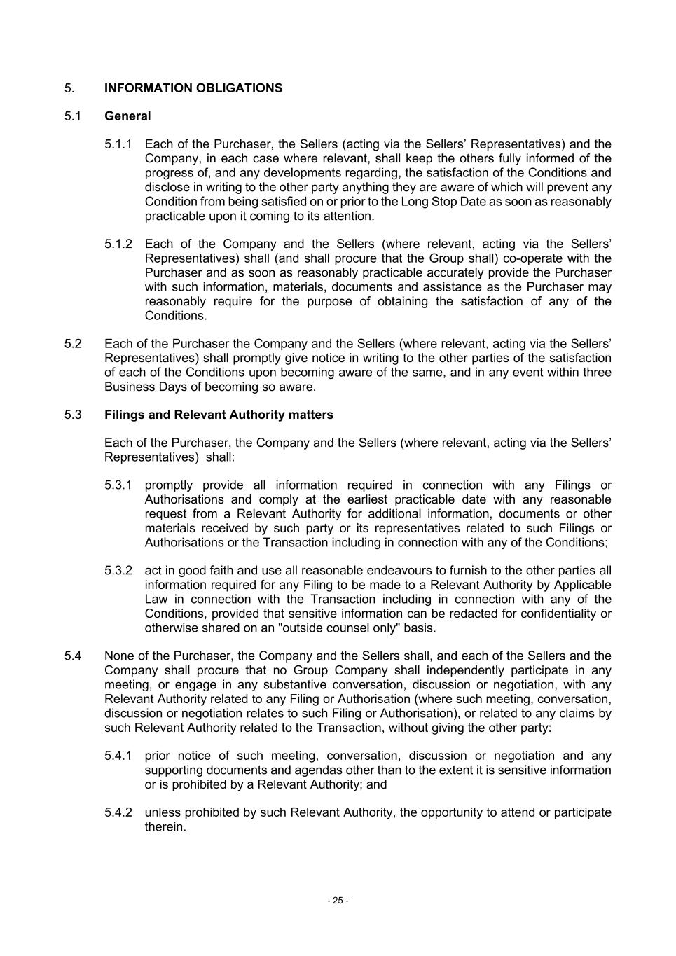 - 25 - 5. INFORMATION OBLIGATIONS 5.1 General 5.1.1 Each of the Purchaser, the Sellers (acting via the Sellers’ Representatives) and the Company, in each case where relevant, shall keep the others fully informed of the progress of, and any developments regarding, the satisfaction of the Conditions and disclose in writing to the other party anything they are aware of which will prevent any Condition from being satisfied on or prior to the Long Stop Date as soon as reasonably practicable upon it coming to its attention. 5.1.2 Each of the Company and the Sellers (where relevant, acting via the Sellers’ Representatives) shall (and shall procure that the Group shall) co-operate with the Purchaser and as soon as reasonably practicable accurately provide the Purchaser with such information, materials, documents and assistance as the Purchaser may reasonably require for the purpose of obtaining the satisfaction of any of the Conditions. 5.2 Each of the Purchaser the Company and the Sellers (where relevant, acting via the Sellers’ Representatives) shall promptly give notice in writing to the other parties of the satisfaction of each of the Conditions upon becoming aware of the same, and in any event within three Business Days of becoming so aware. 5.3 Filings and Relevant Authority matters Each of the Purchaser, the Company and the Sellers (where relevant, acting via the Sellers’ Representatives) shall: 5.3.1 promptly provide all information required in connection with any Filings or Authorisations and comply at the earliest practicable date with any reasonable request from a Relevant Authority for additional information, documents or other materials received by such party or its representatives related to such Filings or Authorisations or the Transaction including in connection with any of the Conditions; 5.3.2 act in good faith and use all reasonable endeavours to furnish to the other parties all information required for any Filing to be made to a Relevant Authority by Applicable Law in connection with the Transaction including in connection with any of the Conditions, provided that sensitive information can be redacted for confidentiality or otherwise shared on an "outside counsel only" basis. 5.4 None of the Purchaser, the Company and the Sellers shall, and each of the Sellers and the Company shall procure that no Group Company shall independently participate in any meeting, or engage in any substantive conversation, discussion or negotiation, with any Relevant Authority related to any Filing or Authorisation (where such meeting, conversation, discussion or negotiation relates to such Filing or Authorisation), or related to any claims by such Relevant Authority related to the Transaction, without giving the other party: 5.4.1 prior notice of such meeting, conversation, discussion or negotiation and any supporting documents and agendas other than to the extent it is sensitive information or is prohibited by a Relevant Authority; and 5.4.2 unless prohibited by such Relevant Authority, the opportunity to attend or participate therein.