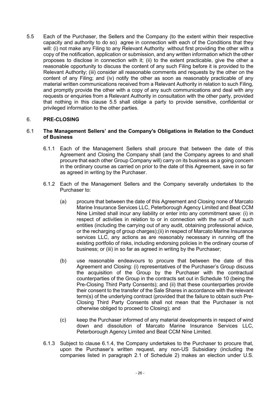 - 26 - 5.5 Each of the Purchaser, the Sellers and the Company (to the extent within their respective capacity and authority to do so) agree in connection with each of the Conditions that they will: (i) not make any Filing to any Relevant Authority without first providing the other with a copy of the notification, application or submission, and any written information which the other proposes to disclose in connection with it; (ii) to the extent practicable, give the other a reasonable opportunity to discuss the content of any such Filing before it is provided to the Relevant Authority; (iii) consider all reasonable comments and requests by the other on the content of any Filing; and (iv) notify the other as soon as reasonably practicable of any material written communications received from a Relevant Authority in relation to such Filing, and promptly provide the other with a copy of any such communications and deal with any requests or enquiries from a Relevant Authority in consultation with the other party, provided that nothing in this clause 5.5 shall oblige a party to provide sensitive, confidential or privileged information to the other parties. 6. PRE-CLOSING 6.1 The Management Sellers’ and the Company's Obligations in Relation to the Conduct of Business 6.1.1 Each of the Management Sellers shall procure that between the date of this Agreement and Closing the Company shall (and the Company agrees to and shall procure that each other Group Company will) carry on its business as a going concern in the ordinary course as carried on prior to the date of this Agreement, save in so far as agreed in writing by the Purchaser. 6.1.2 Each of the Management Sellers and the Company severally undertakes to the Purchaser to: (a) procure that between the date of this Agreement and Closing none of Marcato Marine Insurance Services LLC, Peterborough Agency Limited and Beat CCM Nine Limited shall incur any liability or enter into any commitment save: (i) in respect of activities in relation to or in connection with the run-off of such entities (including the carrying out of any audit, obtaining professional advice, or the recharging of group charges);(ii) in respect of Marcato Marine Insurance services LLC, any actions as are reasonably necessary in running off the existing portfolio of risks, including endorsing policies in the ordinary course of business; or (iii) in so far as agreed in writing by the Purchaser; (b) use reasonable endeavours to procure that between the date of this Agreement and Closing: (i) representatives of the Purchaser’s Group discuss the acquisition of the Group by the Purchaser with the contractual counterparties of the Group in the contracts set out in Schedule 10 (being the Pre-Closing Third Party Consents); and (ii) that these counterparties provide their consent to the transfer of the Sale Shares in accordance with the relevant term(s) of the underlying contract (provided that the failure to obtain such Pre- Closing Third Party Consents shall not mean that the Purchaser is not otherwise obliged to proceed to Closing); and (c) keep the Purchaser informed of any material developments in respect of wind down and dissolution of Marcato Marine Insurance Services LLC, Peterborough Agency Limited and Beat CCM Nine Limited. 6.1.3 Subject to clause 6.1.4, the Company undertakes to the Purchaser to procure that, upon the Purchaser’s written request, any non-US Subsidiary (including the companies listed in paragraph 2.1 of Schedule 2) makes an election under U.S.