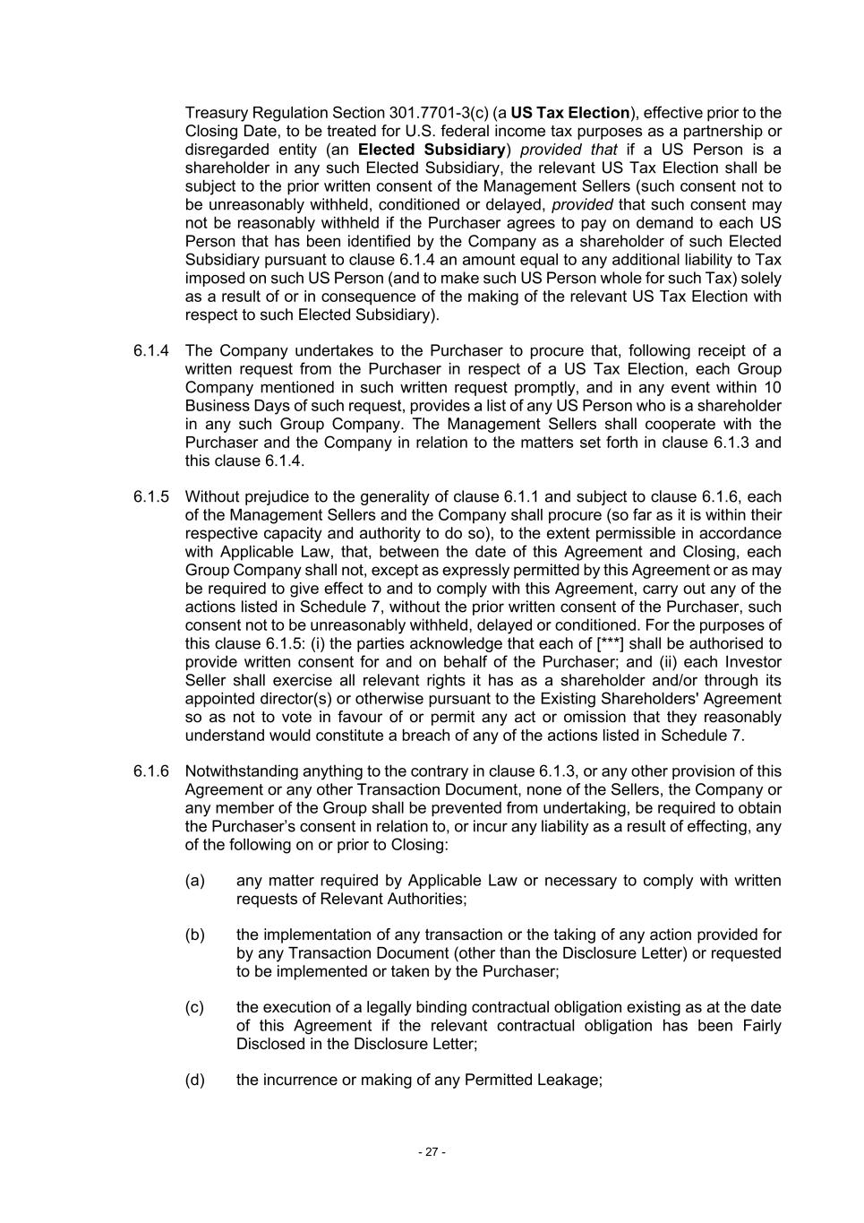 - 27 - Treasury Regulation Section 301.7701-3(c) (a US Tax Election), effective prior to the Closing Date, to be treated for U.S. federal income tax purposes as a partnership or disregarded entity (an Elected Subsidiary) provided that if a US Person is a shareholder in any such Elected Subsidiary, the relevant US Tax Election shall be subject to the prior written consent of the Management Sellers (such consent not to be unreasonably withheld, conditioned or delayed, provided that such consent may not be reasonably withheld if the Purchaser agrees to pay on demand to each US Person that has been identified by the Company as a shareholder of such Elected Subsidiary pursuant to clause 6.1.4 an amount equal to any additional liability to Tax imposed on such US Person (and to make such US Person whole for such Tax) solely as a result of or in consequence of the making of the relevant US Tax Election with respect to such Elected Subsidiary). 6.1.4 The Company undertakes to the Purchaser to procure that, following receipt of a written request from the Purchaser in respect of a US Tax Election, each Group Company mentioned in such written request promptly, and in any event within 10 Business Days of such request, provides a list of any US Person who is a shareholder in any such Group Company. The Management Sellers shall cooperate with the Purchaser and the Company in relation to the matters set forth in clause 6.1.3 and this clause 6.1.4. 6.1.5 Without prejudice to the generality of clause 6.1.1 and subject to clause 6.1.6, each of the Management Sellers and the Company shall procure (so far as it is within their respective capacity and authority to do so), to the extent permissible in accordance with Applicable Law, that, between the date of this Agreement and Closing, each Group Company shall not, except as expressly permitted by this Agreement or as may be required to give effect to and to comply with this Agreement, carry out any of the actions listed in Schedule 7, without the prior written consent of the Purchaser, such consent not to be unreasonably withheld, delayed or conditioned. For the purposes of this clause 6.1.5: (i) the parties acknowledge that each of [***] shall be authorised to provide written consent for and on behalf of the Purchaser; and (ii) each Investor Seller shall exercise all relevant rights it has as a shareholder and/or through its appointed director(s) or otherwise pursuant to the Existing Shareholders' Agreement so as not to vote in favour of or permit any act or omission that they reasonably understand would constitute a breach of any of the actions listed in Schedule 7. 6.1.6 Notwithstanding anything to the contrary in clause 6.1.3, or any other provision of this Agreement or any other Transaction Document, none of the Sellers, the Company or any member of the Group shall be prevented from undertaking, be required to obtain the Purchaser’s consent in relation to, or incur any liability as a result of effecting, any of the following on or prior to Closing: (a) any matter required by Applicable Law or necessary to comply with written requests of Relevant Authorities; (b) the implementation of any transaction or the taking of any action provided for by any Transaction Document (other than the Disclosure Letter) or requested to be implemented or taken by the Purchaser; (c) the execution of a legally binding contractual obligation existing as at the date of this Agreement if the relevant contractual obligation has been Fairly Disclosed in the Disclosure Letter; (d) the incurrence or making of any Permitted Leakage;